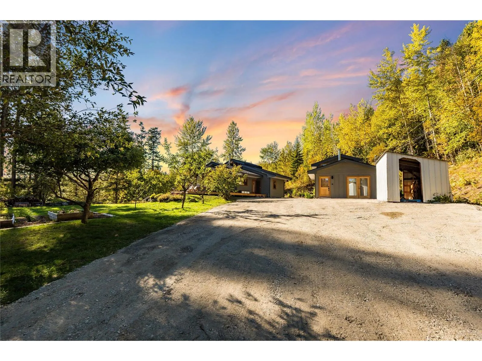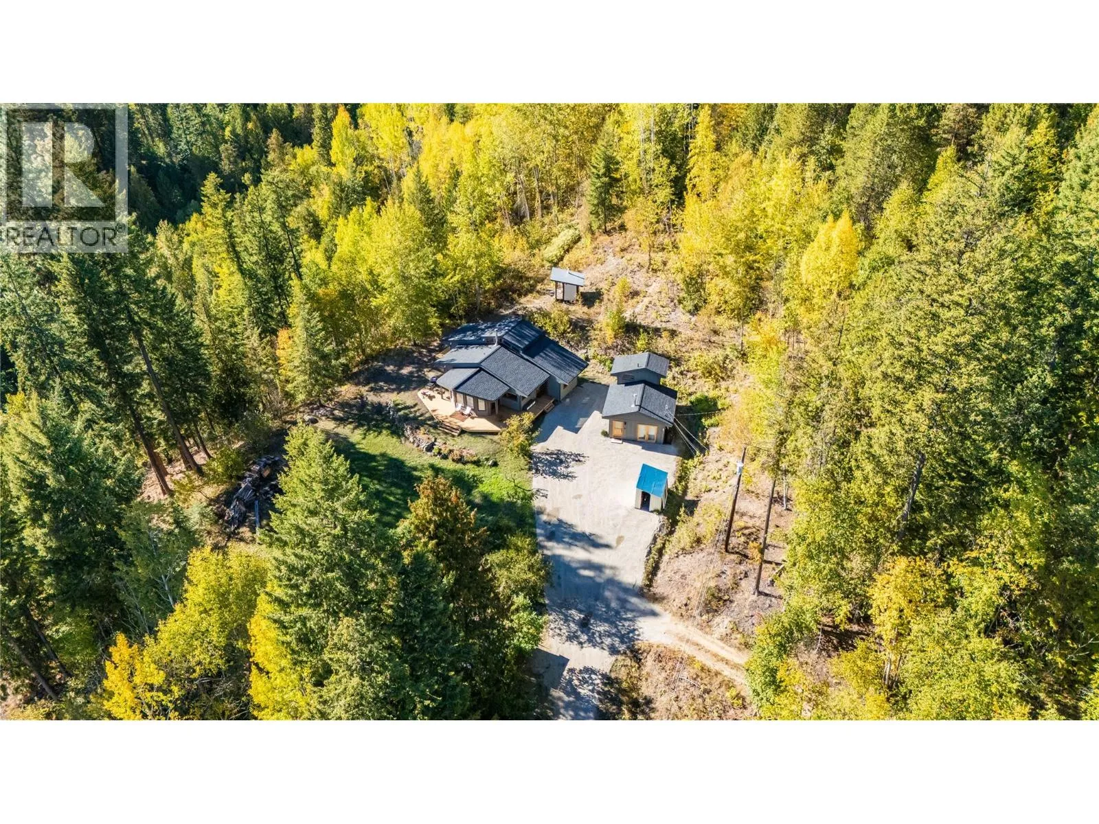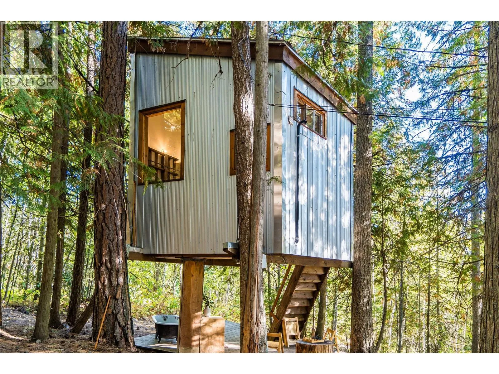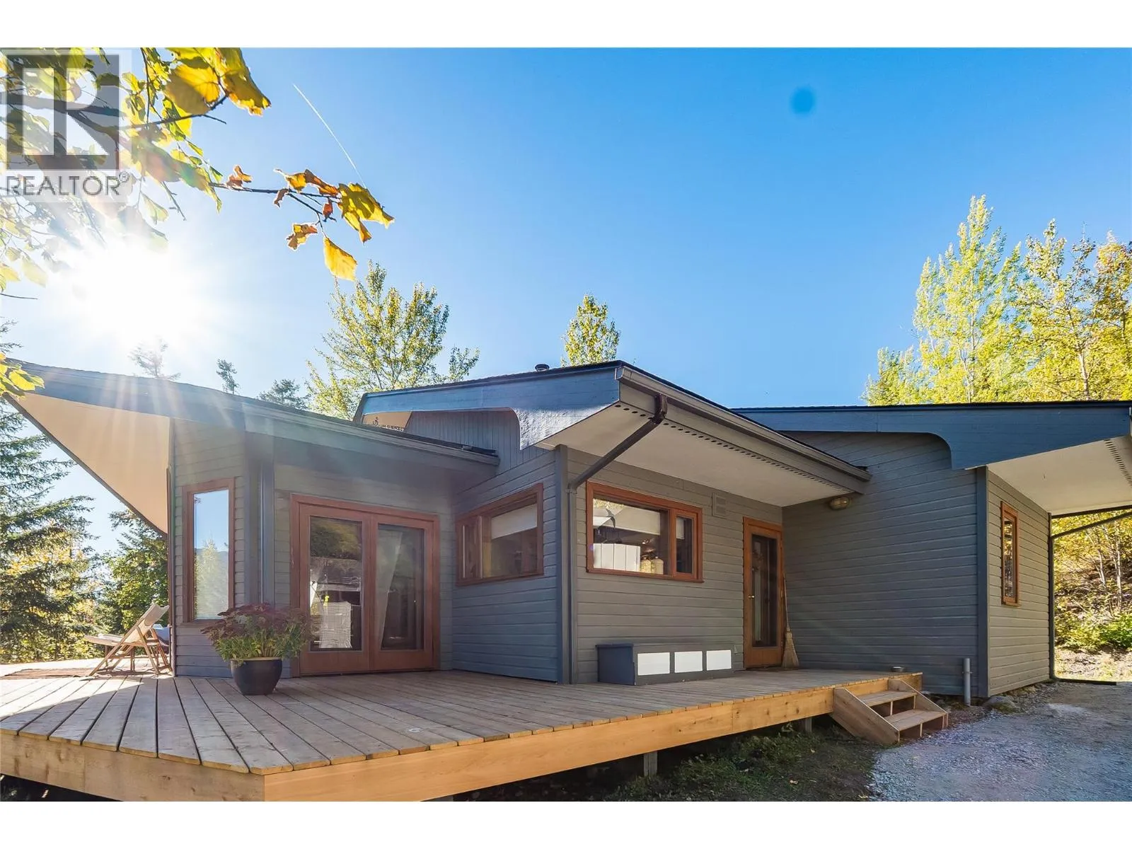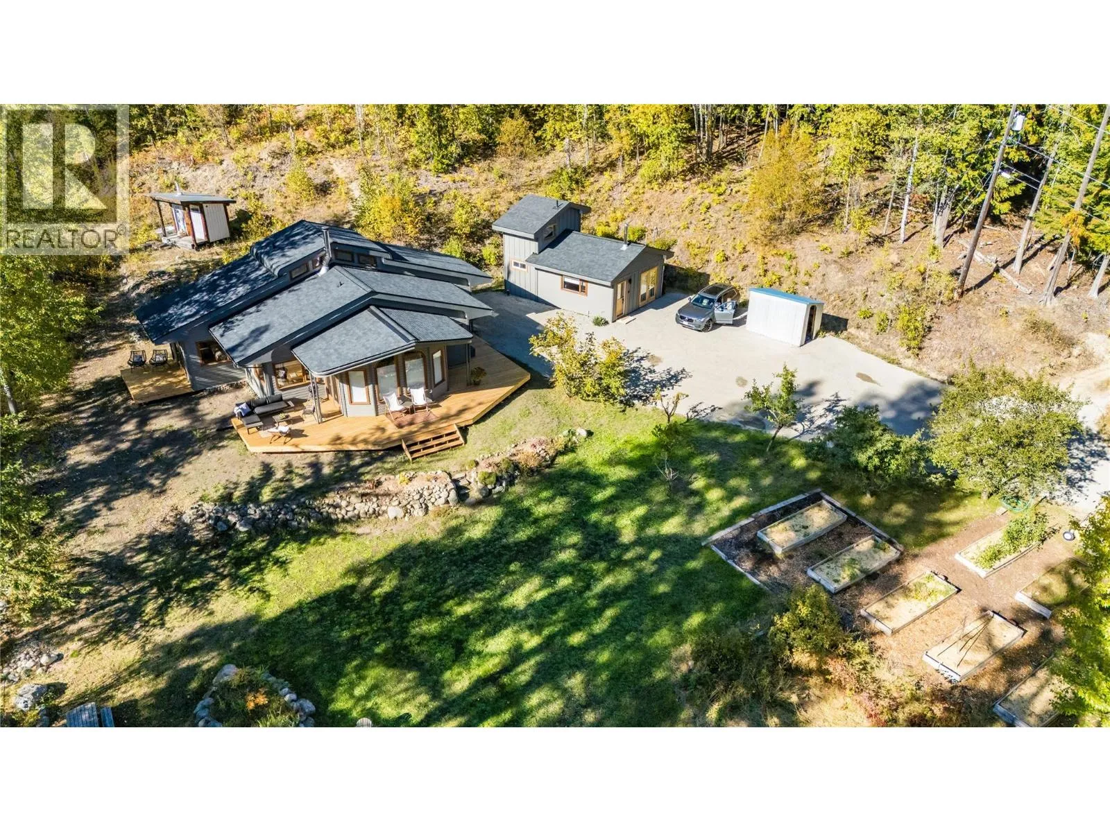 This captivating 3-bedroom, 2-bathroom contemporary home invites you into a warm, modern retreat on 9.75 private acres. Just 15 minutes from Nelson, BC, this sanctuary offers unparalleled privacy, year-round sunshine, breathtaking views, and the soothing murmur of Falls Creek in the distanceâperfect for those craving tranquility, space for gardening, or peaceful walks. Step inside to a cozy, energy-efficient haven with an open-concept design that radiates warmth. Soaring high ceilings and abundant windows bathe the space in natural light, seamlessly blending the stunning surroundings with your everyday life. The thoughtfully designed kitchen is a chefâs delight open to the bright dining and living areas while two luxurious bathrooms feature deep cast-iron tubs for ultimate relaxation. Recent updates elevate the homeâs charm, including a wraparound deck for easy outdoor living and a brand-new roof. Beyond the main house, discover a newly renovated 18x25 guesthouse with modern finishes, ideal for visitors or a private retreat. Additional treasures include a cedar wood-fired sauna, a 12x18 treehouse/studio complete with a kitchenette, sink, shower, and sleeping loft. A thriving garden in the front yard with a state-of-the-art chicken coop. This property blends modern updates with soulful warmth, making it a must-see for those seeking a unique, nature-embraced lifestyle. With subdivision potential, this property must be seen to appreciate all the possibilities. (id:27476)