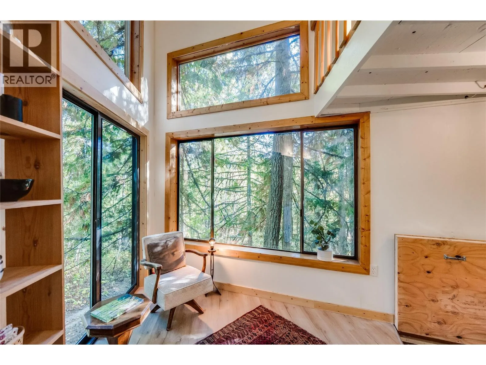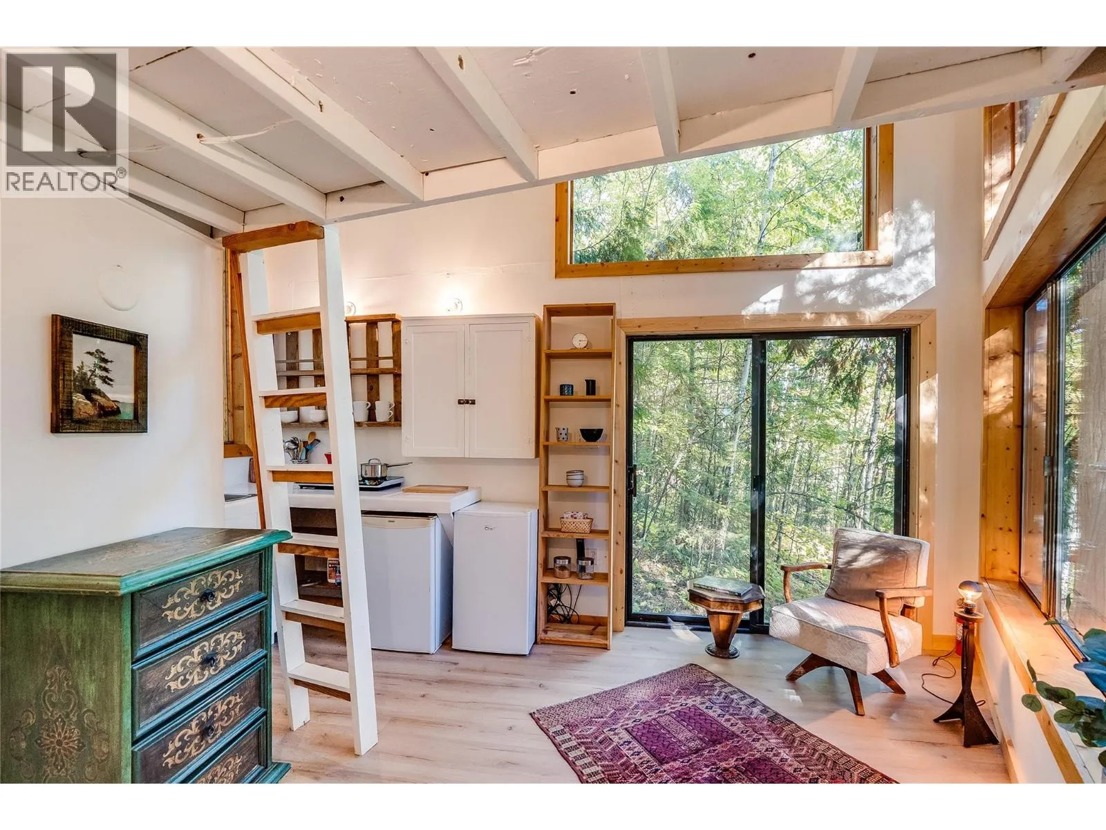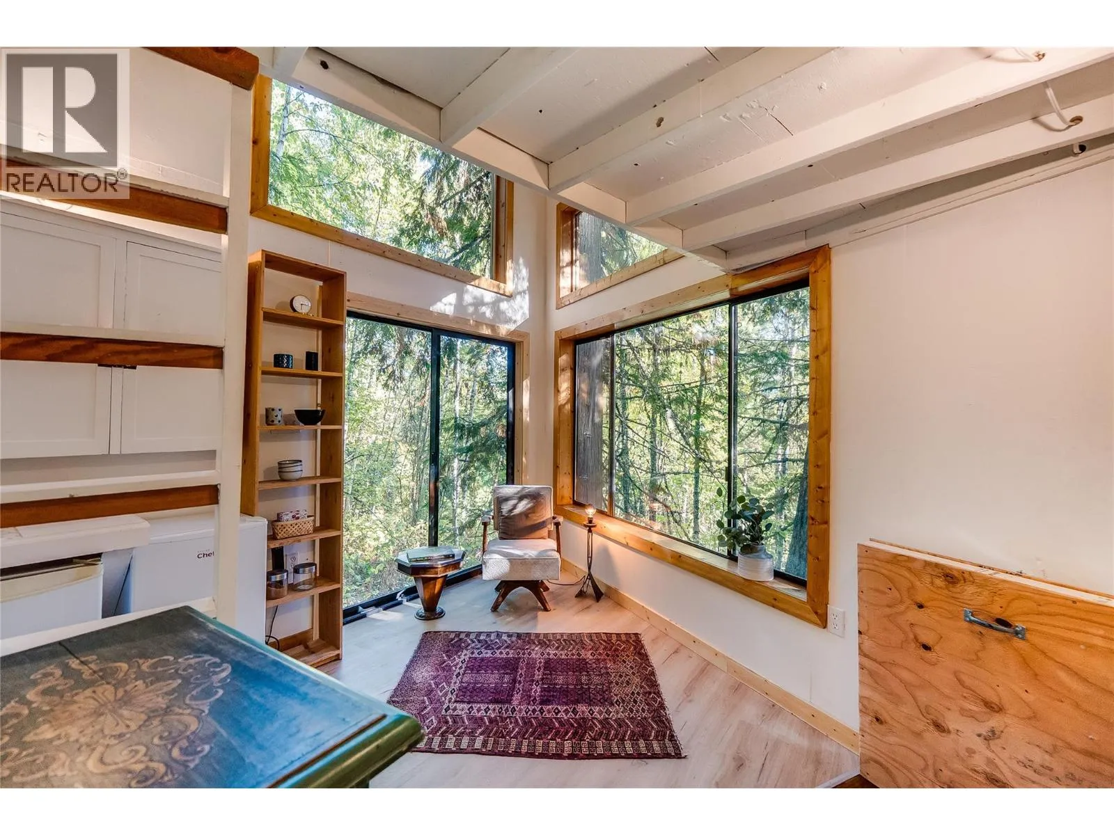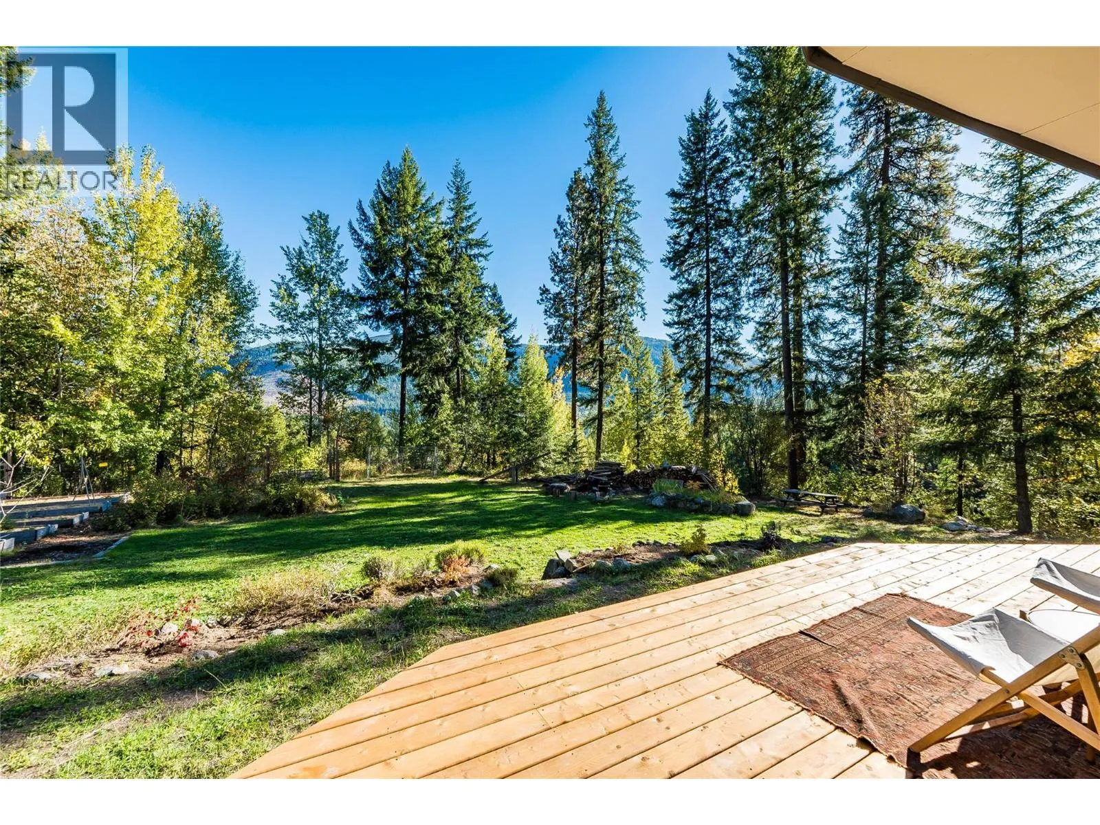 This captivating 3-bedroom, 2-bathroom contemporary home invites you into a warm, modern retreat on 9.75 private acres. Just 15 minutes from Nelson, BC, this sanctuary offers unparalleled privacy, year-round sunshine, breathtaking views, and the soothing murmur of Falls Creek in the distanceâperfect for those craving tranquility, space for gardening, or peaceful walks. Step inside to a cozy, energy-efficient haven with an open-concept design that radiates warmth. Soaring high ceilings and abundant windows bathe the space in natural light, seamlessly blending the stunning surroundings with your everyday life. The thoughtfully designed kitchen is a chefâs delight open to the bright dining and living areas while two luxurious bathrooms feature deep cast-iron tubs for ultimate relaxation. Recent updates elevate the homeâs charm, including a wraparound deck for easy outdoor living and a brand-new roof. Beyond the main house, discover a newly renovated 18x25 guesthouse with modern finishes, ideal for visitors or a private retreat. Additional treasures include a cedar wood-fired sauna, a 12x18 treehouse/studio complete with a kitchenette, sink, shower, and sleeping loft. A thriving garden in the front yard with a state-of-the-art chicken coop. This property blends modern updates with soulful warmth, making it a must-see for those seeking a unique, nature-embraced lifestyle. With subdivision potential, this property must be seen to appreciate all the possibilities. (id:27476)