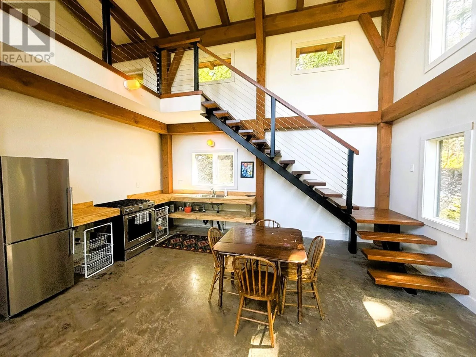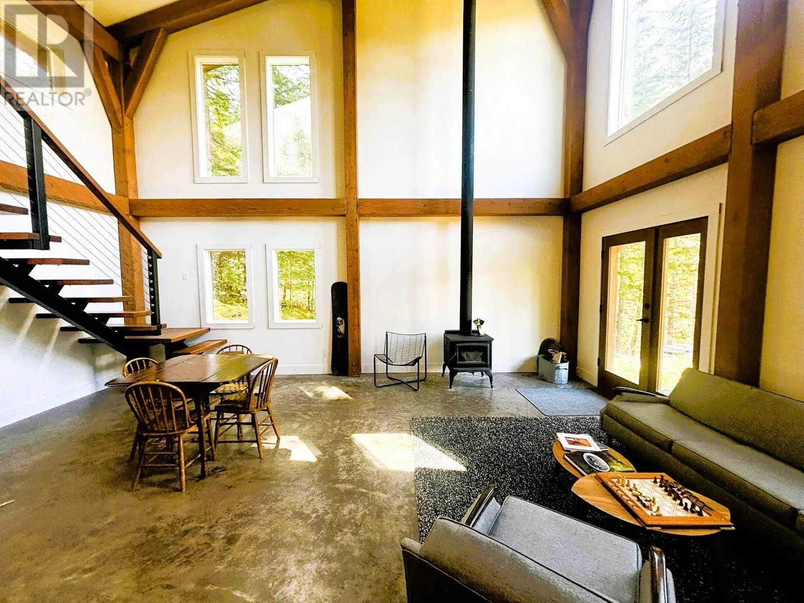 A beautiful and modern timber frame cabin set on 2 forested acres in the lakeside community of Beaton. Beaton is located at the end of Beaton Arm on Upper Arrow Lake, immersed in the Selkirk Mountains. The cabin has approx. 1,200 sq,ft with 2 bedrooms upstairs plus a den / office / potential 3rd bedroom down. The main floor has polished and heated floors throughout, here you will find an open kitchen / dining & living area with wood stove, a utility room, full bathroom with soaker tub and plumbed and ready for a standing shower to be put in and the aforementioned den. Access to the home is ground level with a formal entrance into a good sized foyer / mudroom or directly into the living area. The off grid set up includes solar power (4 12v batteries powered by 4 panels with auxiliary generator connection for winter), in slab radiant heat supplied by a Navien on demand gas boiler, wood stove and a full septic and drilled well. This amazing and complete off grid set up has lake access nearby, truly stunning geography, endless backcountry to explore, and complete solitude. (id:27476)