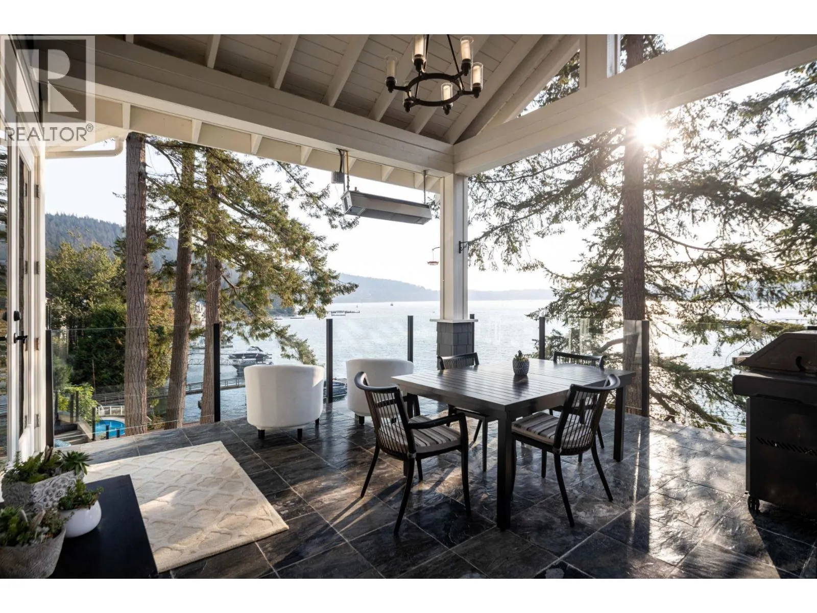 EXCLUSIVE WATERFRONT RESIDENCE w/sunset views & private dock. Beautiful 5286 SF craftsman home w/the charm & details that will endure the test of time. Custom layout provides privacy while offering sunny southerly panoramic water views from every room. Lovely front garden entry opens to an immediate ocean view that will mesmerize your guests on every visit. High vaulted ceilings, bay windows, stone fireplace & entertainers dream kitchen that flows to your outdoor spaces, 40´ infinity pool, hot tub & private slip for your water craft pursuits. A luxurious primary bedrm will delight the sophisticated couple w/spacious ensuite & balcony. Quality finishes, premium appl, AC, elevator, oak HW, travertine marble, sound system, rec room & wheelchair accessible. 15 min to P Moody Centre/45 to D/T Van. (id:27476)