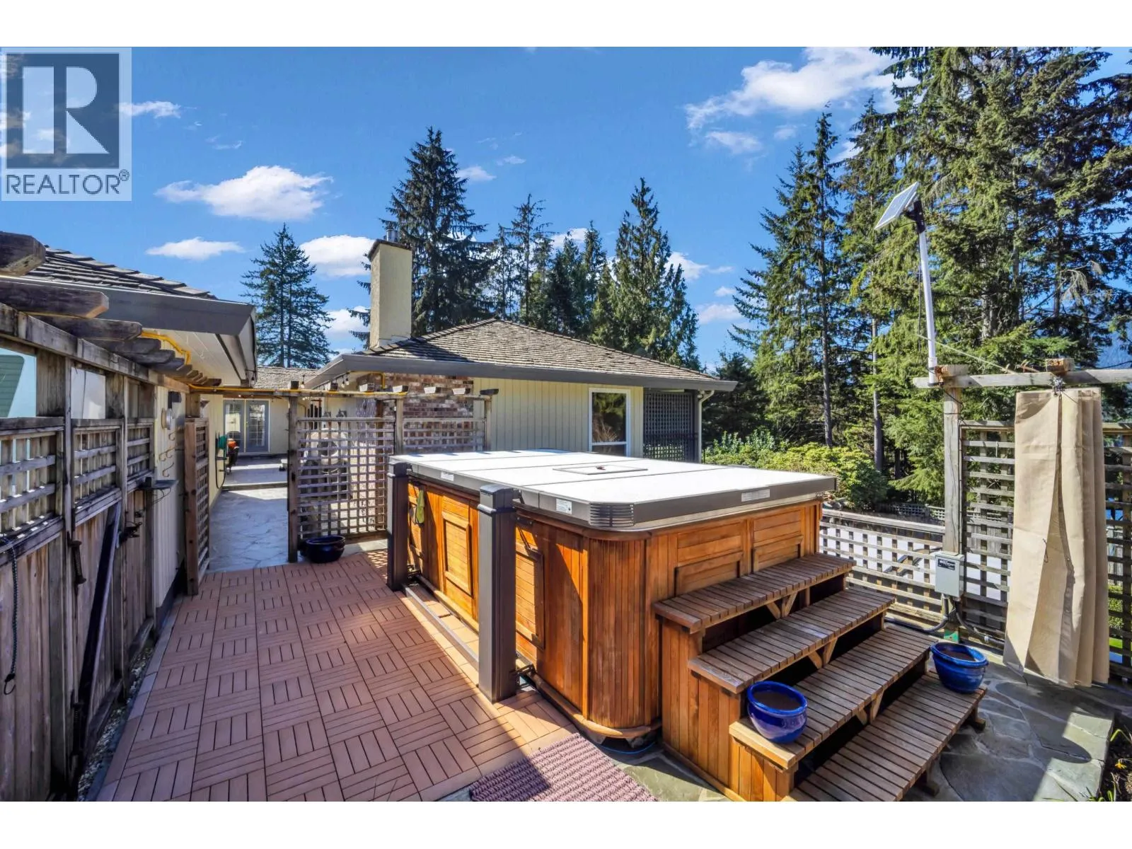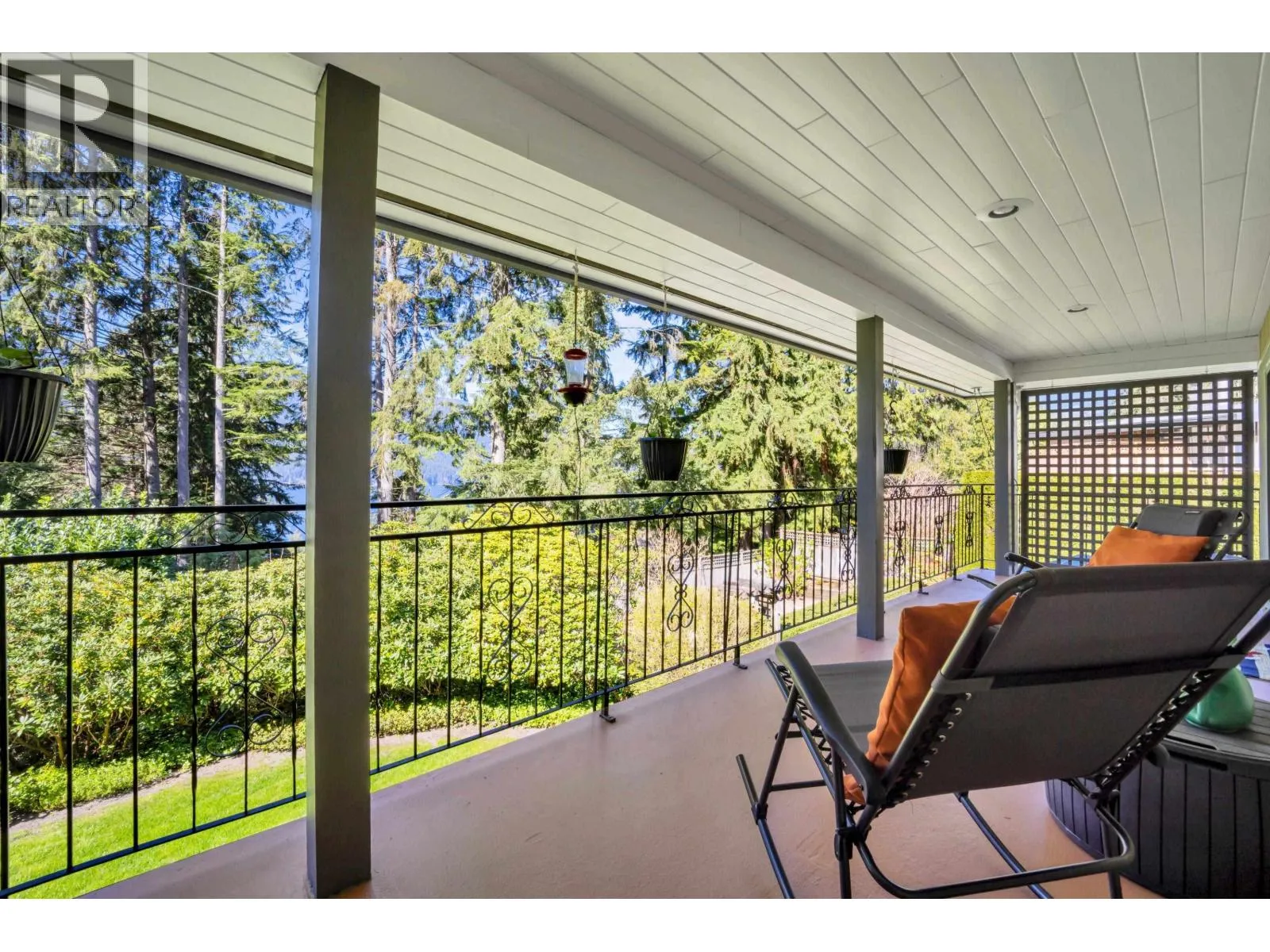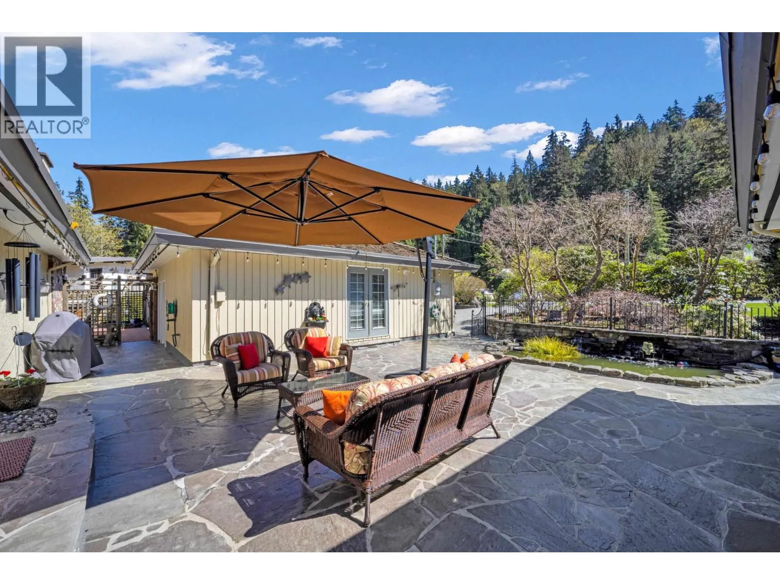 Tucked away on a flat, beautifully manicured 15,800 sq.ft. lot on the sunny side of a quiet Belcarra street, this thoughtfully updated 4 bed, 3 bath home offers a rare blend of lifestyle, function, and long-term value. A private courtyard sanctuary finished in Pennsylvania bluestone features a soothing waterfall with goldfish, creating a peaceful retreat that seamlessly blends indoor and outdoor living. The home flows to a sheltered balcony and 250 sq.ft. lower deck with serene garden outlooks and ocean views, plus potential membership in a nearby group dock. The main level offers a renovated kitchen with Miele appliances, a large Silestone island, and a stunning gas rock f/p, along with updated bathrooms. The walkout lower level with separate entry is ideal for a suite or Airbnb. Outside, manicured gardens and a swim spa complete the resort-like feel. Additional features include a 22KW generator, high-efficiency boiler, EV-ready outlet, irrigation system, workshop RV & ample amounts of parking. (id:27476)