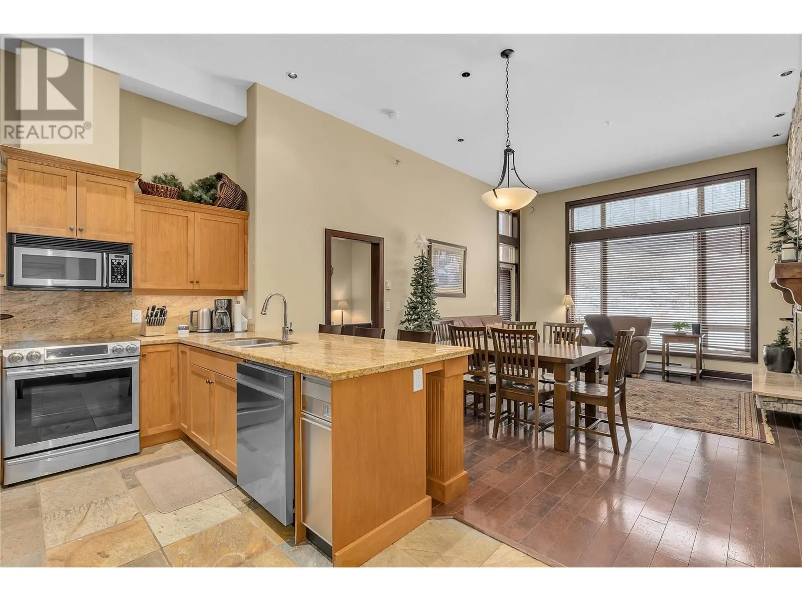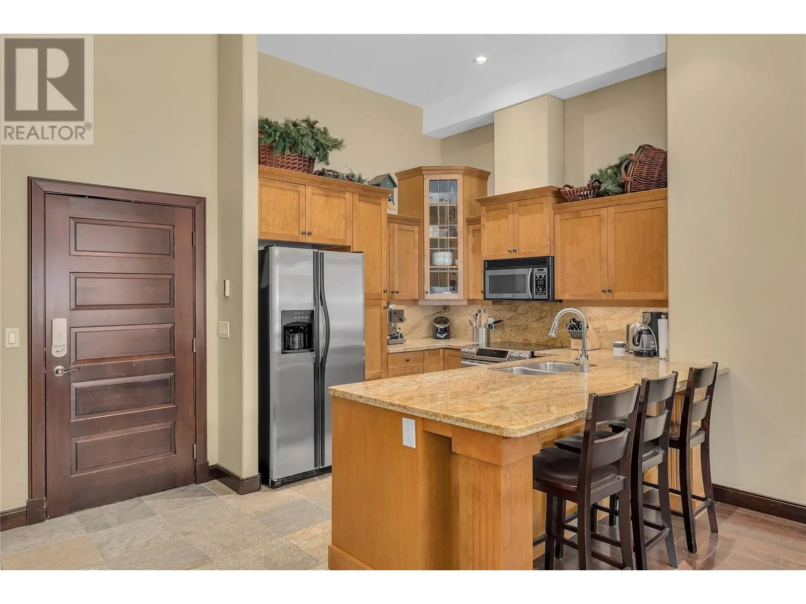 This beautifully appointed 3-bedroom, 2-bathroom condo boasts 12â ceilings and is fully furnished with exquisite furniture and decor, creating a cozy and inviting mountain retreat. Turn-key and year to go for this winter season. Located directly on the ""Sun Run"" with unbeatable ski access to four major chairlifts. Relax on your covered deck with a private hot tub overlooking the slopes, offering the perfect spot to unwind after a day on the mountain. Additional features include underground parking, making it easy to arrive and hit the slopes, in-unit laundry for added convenience, hardwood, granite, stainless appliances, maple cabinetry, beverage center with fridge, wine storage behind a custom iron gate, heated slate flooring in entryway and both bathrooms. GST paid and this unit has never been rented, it shows like new! Well run strata with full time building manager year round. Donât miss this opportunity to own a piece of Big Whiteâs finest ski-in/ski-out real estate! With direct flights from cities like Los Angeles, Toronto, and Montreal, and just an hour from YLW, Big White is more accessible than ever. Known for some of the best snow in North America, this resort offers a winter wonderland experience. Best of all, this property is fully exempt from the Foreign Buyer Ban, Foreign Buyers Tax, Speculation Tax, Empty Home Tax, and Short-Term Rental Ban, providing a rare opportunity for international buyers. LIVE WHERE YOU PLAY! (id:27476)
