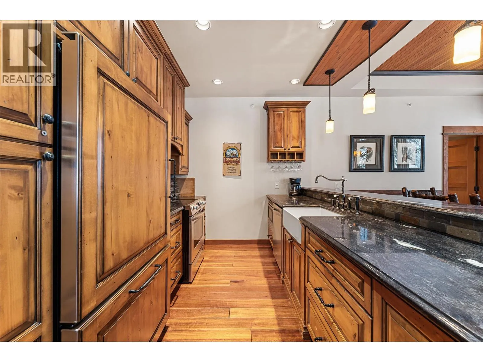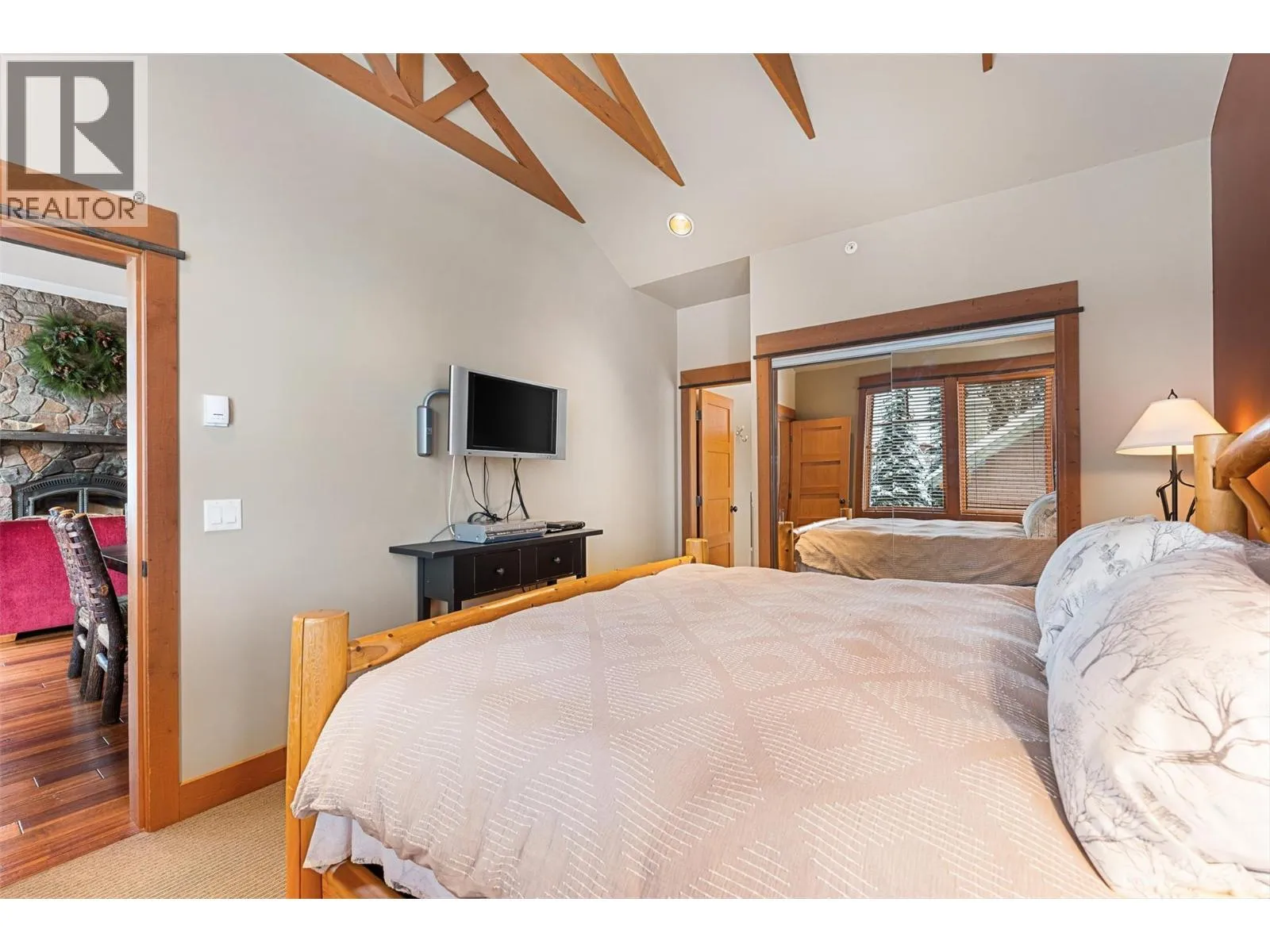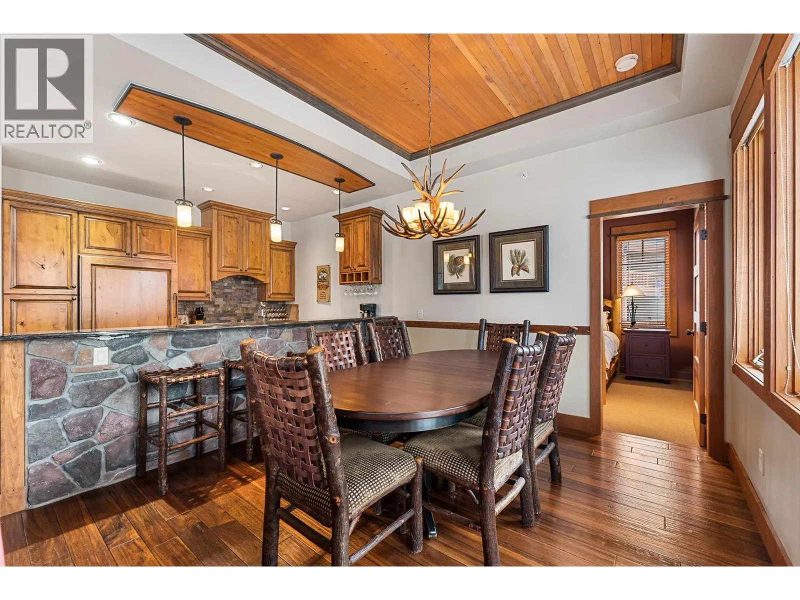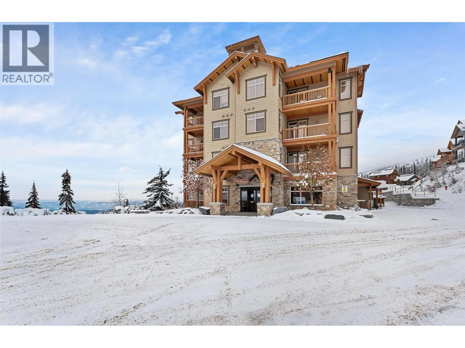Mountain retreat tucked into the heart of the slope side community of Sundance Resort offering the ultimate ski-in, ski-out lifestyle. This chalet blends timeless craftsmanship w the warmth & comfort of alpine living. Vaulted ceilings, fir doors and trim, wood-framed windows, rustic hardwood, & slate tile details create a cohesive atmosphere. The main level embraces open-concept living, anchored by a floor-to-ceiling wood-burning stone fireplace that enhances the homeâs lodge-like ambiance. Large view windows frame the surrounding snow-covered trees and mountain vistas, while the adjoining kitchen features granite countertops, a raised island with seating for six, traditional wood cabinetry, and a panelled JennAir fridge, perfect for gathering after a day on the hill. The dining room opens to a covered view deck for year-round enjoyment. The vaulted primary suite offers a peaceful retreat with mountain views & a spa-like ensuite complete with heated slate floors, a soaker tub, and a walk-in steam shower. The lower level extends the homeâs comfort with two additional bedrooms, one with a private ensuite, a den/rec room with walkout access to the covered patio-wired for a hot tub, and ample room for family and guests. One underground parking stall in main garage can be used by this free-standing chalet. Residents enjoy access to a swimming pool, hot tub, gym, sauna room & lounge area amenities. This chalet offers an idyllic retreat in one of Big Whiteâs most desirable settings. (id:27476)
