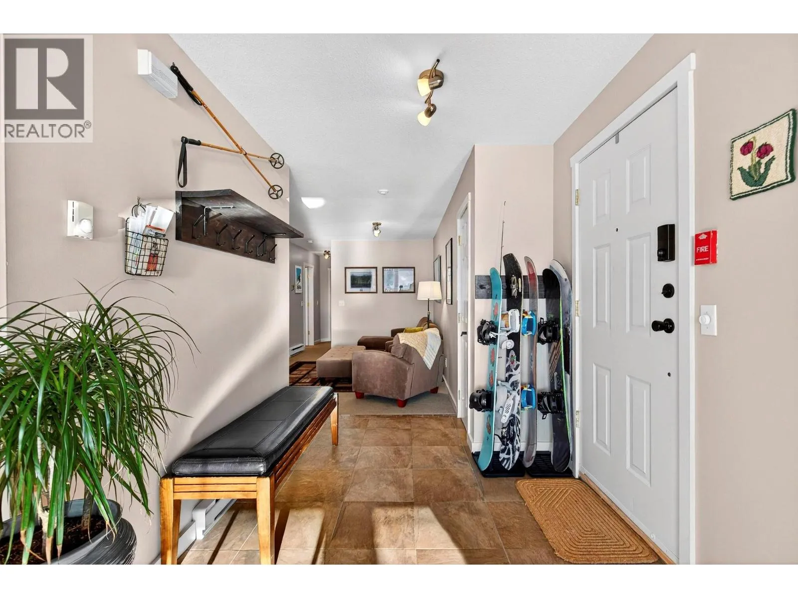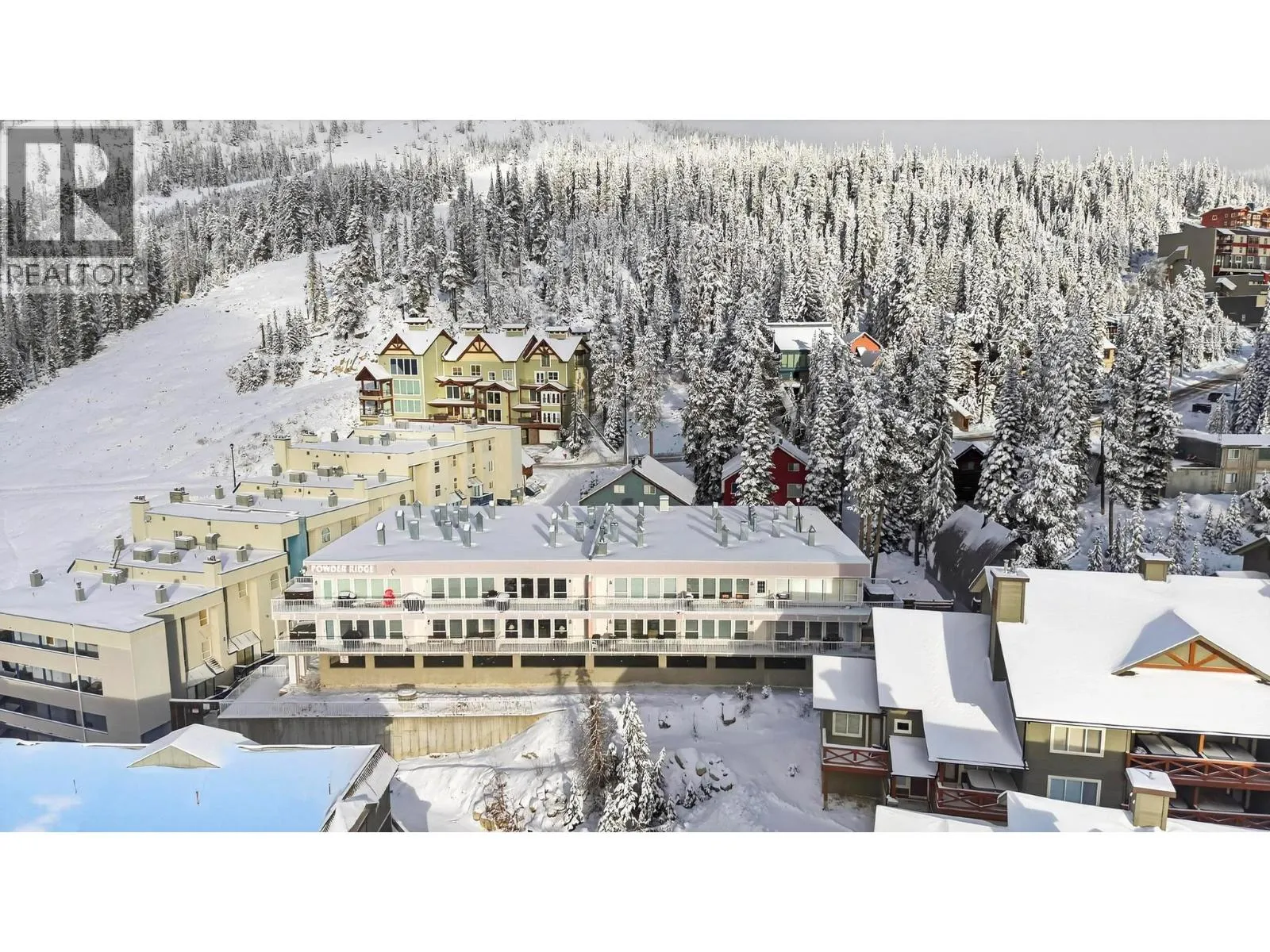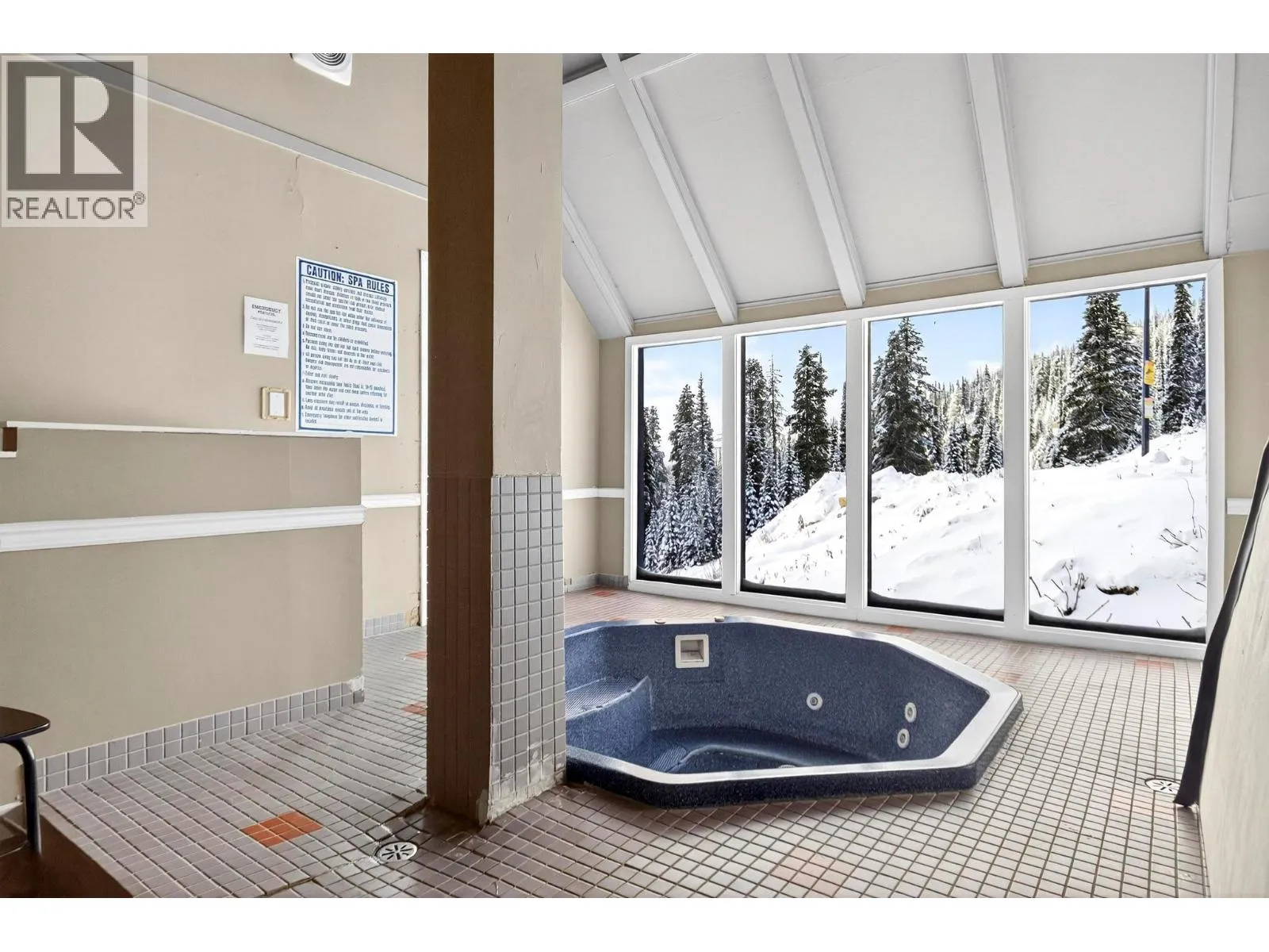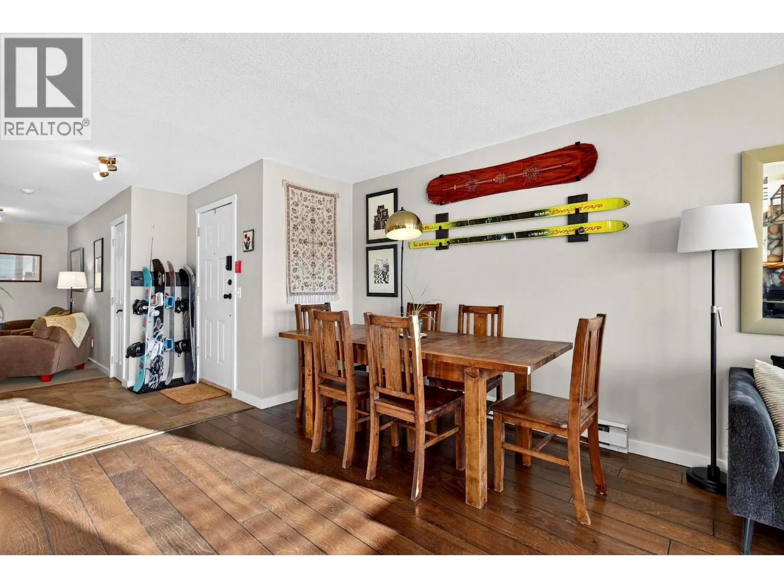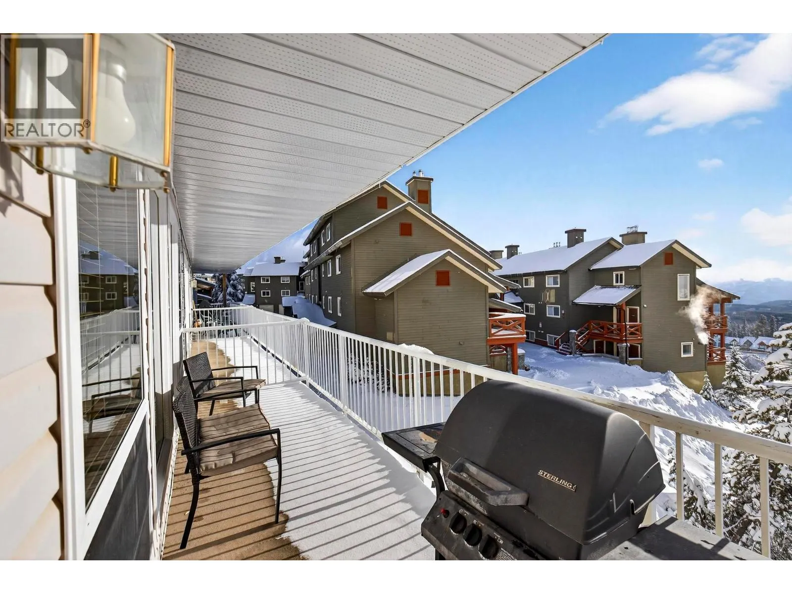 A warm and inviting mountain retreat perfectly designed for both personal enjoyment and short-term rental success. This beautifully updated condo is Airbnb-able, true ski-in/ski-out access, and shared hot tub amenities through the Winter Ridge strata partnership. Step into a bright, open living space flooded with natural light from the wall of west-facing windows. The spacious layout features rich wood flooring, charming mountain decor, and a cozy gas fireplace set into a stunning river-rock surround, creating the perfect apres-ski atmosphere. The dining area comfortably hosts large groups, making this an ideal space for families and guests. The kitchen has stainless steel appliances, warm wood cabinetry, a generous peninsula with bar seating, and plenty of prep space. Whether you're cooking for guests or hosting friends, the flow of this kitchen-to-living space feels effortless. From the living room, step out onto the private deck and take in the expansive mountain and valley views, a true Big White highlight. This is the perfect spot for morning coffee or watching the sun set over the snow-covered rooftops. The bedroom is spacious and comfortable with good storage, and the unit includes a well-kept bathroom and convenient in-suite laundry. Located just minutes from the Village, this complex sits in a quiet, elevated area with excellent ski access. (id:27476)