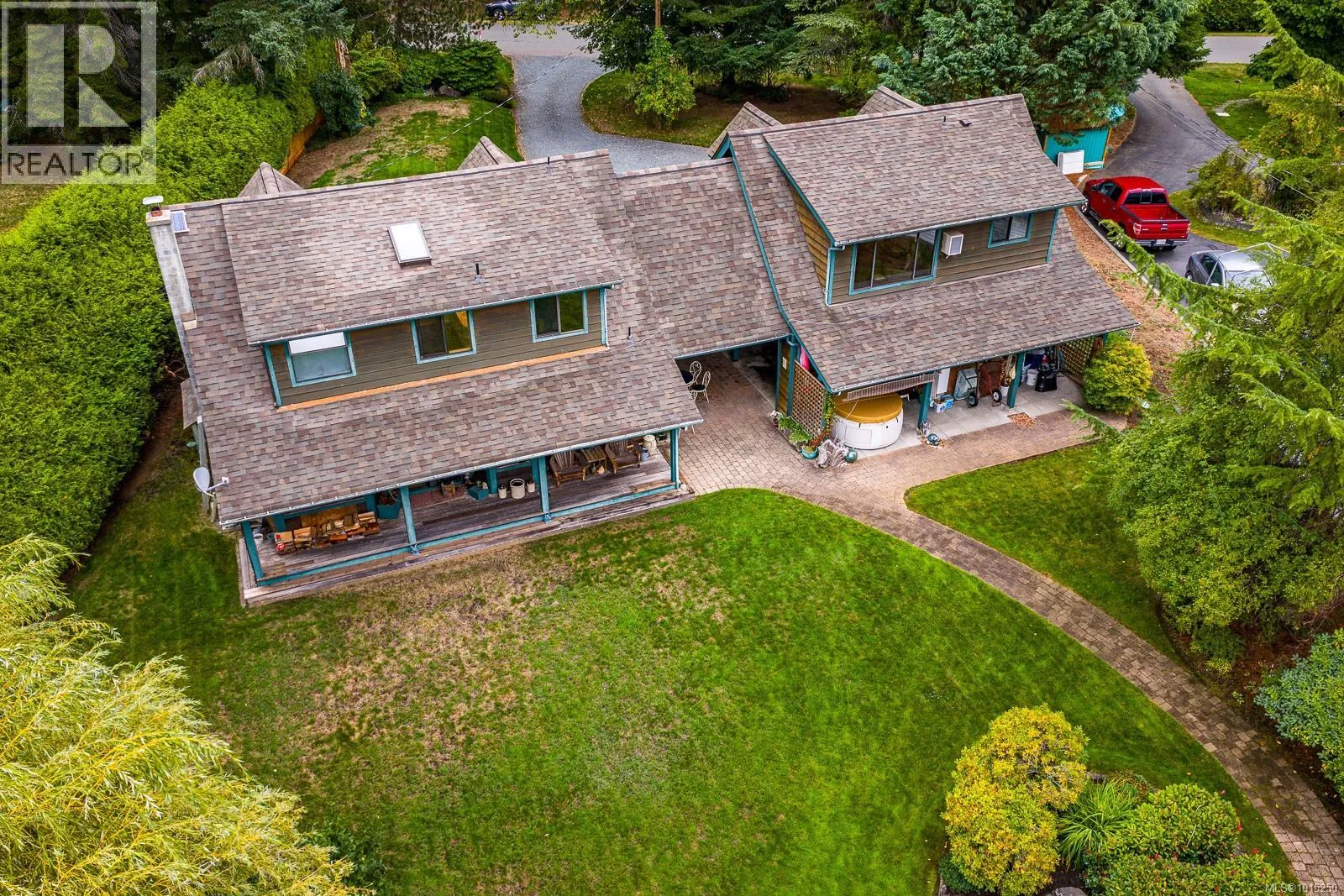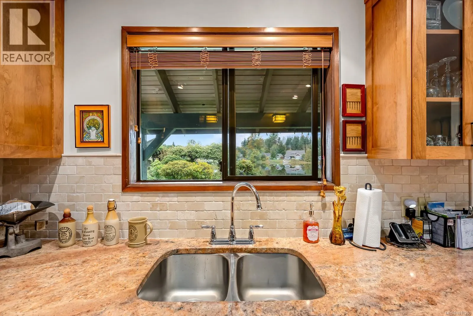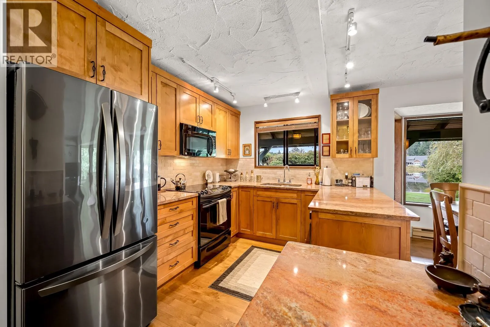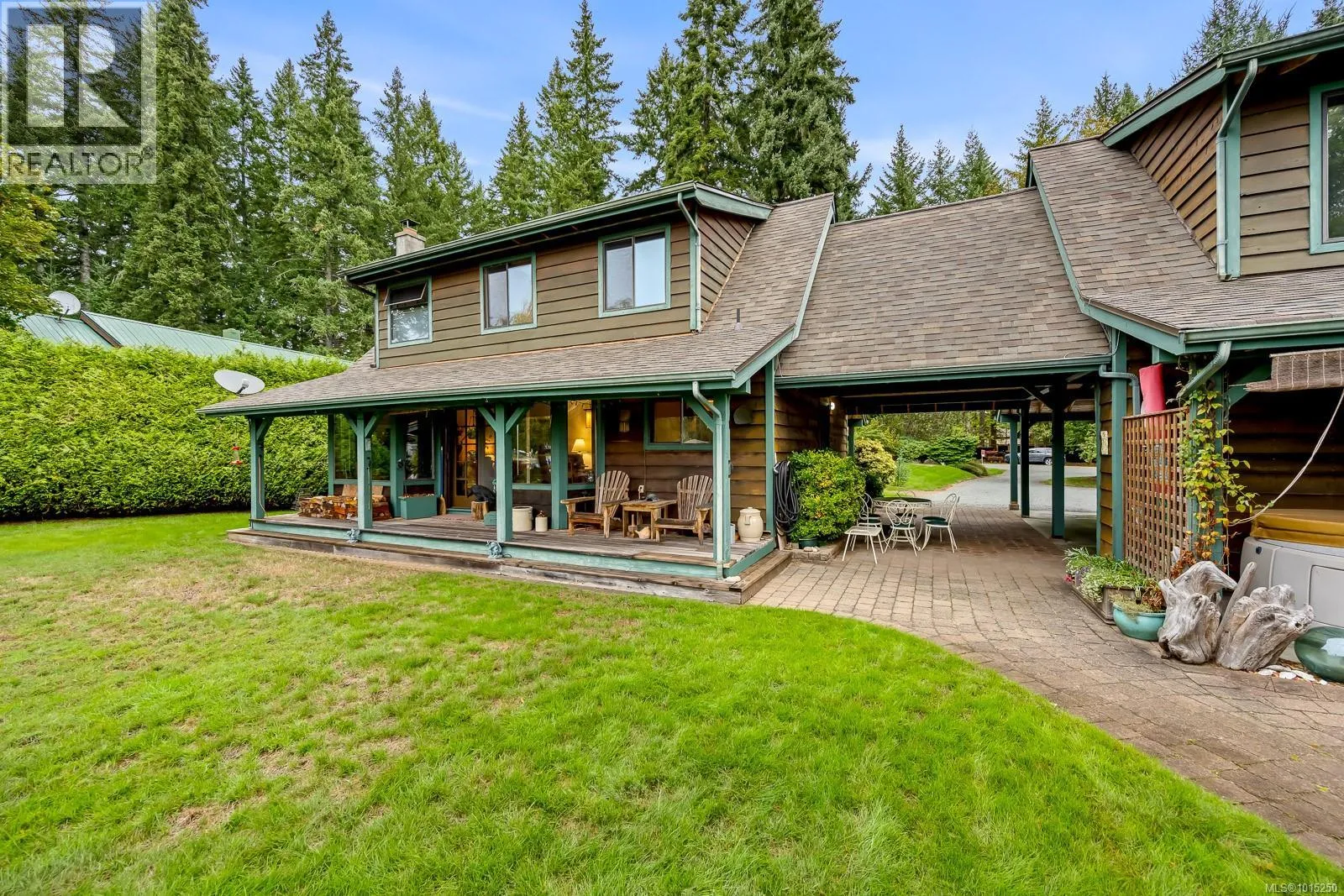 Lakefront home on Robinson Lake with additional accommodation. Set on a peaceful half acre, this classic Cape Cod inspired character home sits right on the shore of Robinson Lake with mountains rising beyond a private, trout-stocked lake. The exterior is clad in custom beveled cedar siding, and the grounds feature mostly perennial, deer-resistant gardens and a storage shed. Enjoy the sun on the sandy beach, or relax beneath the pergola on the lakeside patio. Inside, the 2,128 sq ft layout offers three generous bedrooms plus a versatile bonus room. The primary easily fits a king bed and includes a spa nook with a six-foot soaker tub and shower framed by lake views. An adjacent two-piece bath has room to add a walk-in shower if desired. On the main level, a second bathroom features an authentic clawfoot tub with a pedestal sink originally from the Empress Hotel, adding a little charm. The kitchen offers modern cabinetry, granite counters, two pantries, all appliances, and beautiful lake views. New maple hardwood floors ground the main level, the upper level is carpeted for warmth. Gather in the living room around the wood stove on winter evenings, and stay comfortable and cool through summer and warm in the winter with the mini-split heat pump. Enjoy the bonus of a heated garage connected by a breezeway and carport. There's a full concrete crawlspace that provides ample dry storage with easy access and a solar powered attic ventilation fan. Well maintained with multiple upgrades, including two new 40-gallon hot-water tanks, built-in water filtration, a 2021 roof, an upgraded septic system, and irrigation for lawns and gardens, solar film on upper windows facing the lake. A separate, self-contained studio suite above garage with lake views adds flexible accommodation with its own entrance, high ceilings, kitchen, three-piece bath, and air conditioning, ideal for guests, family, or creative work. Lakeside living, timeless charm, and thoughtful updates ready to enjoy. (id:27476)