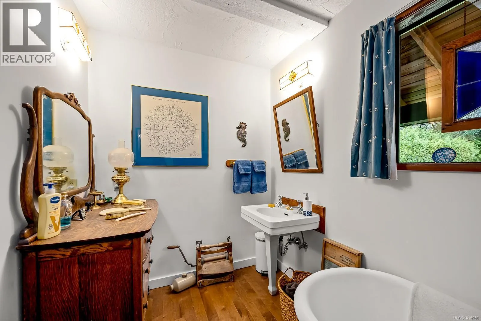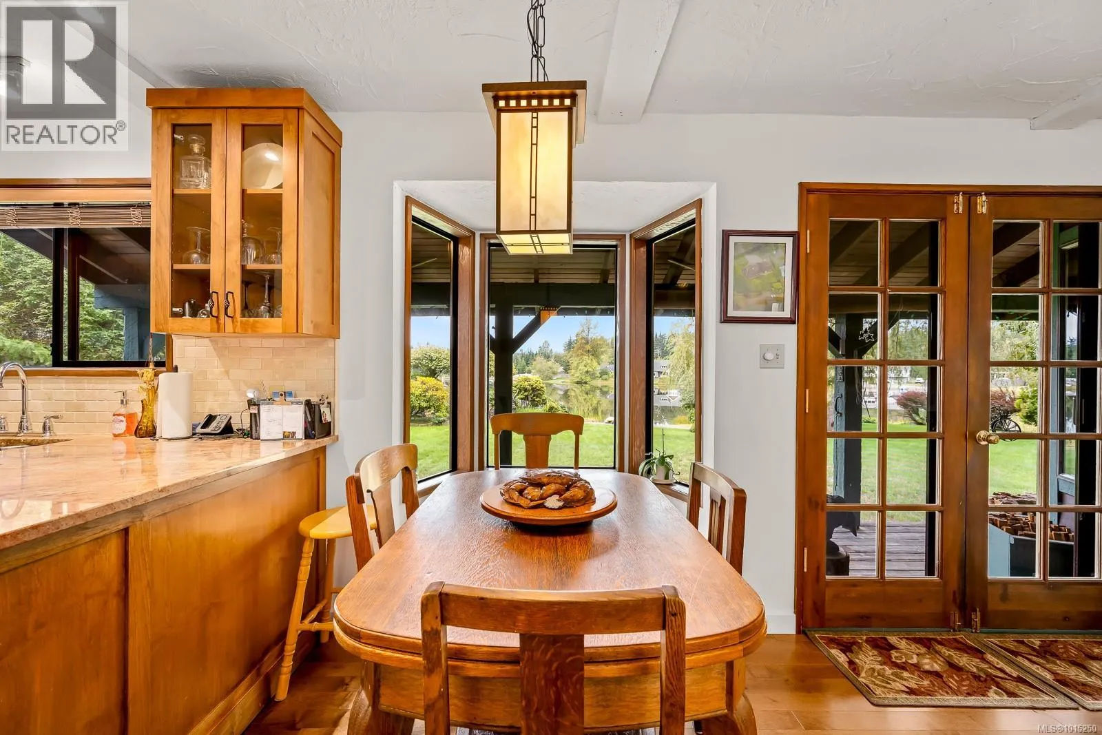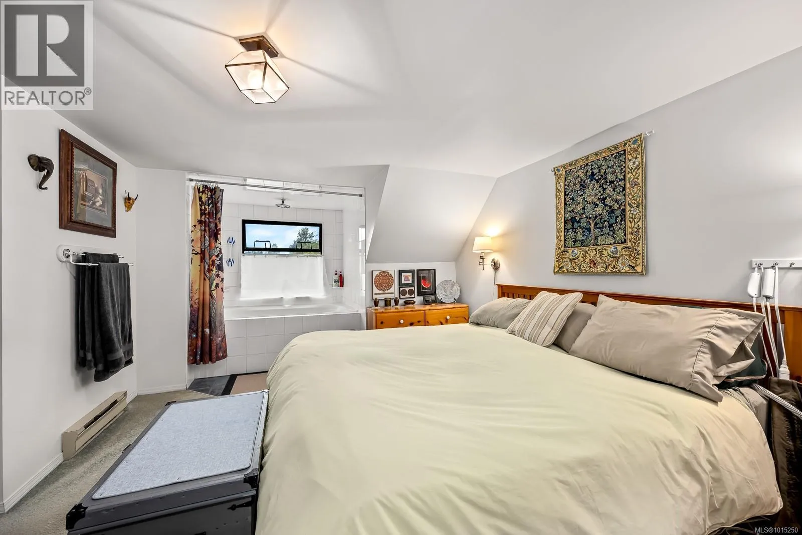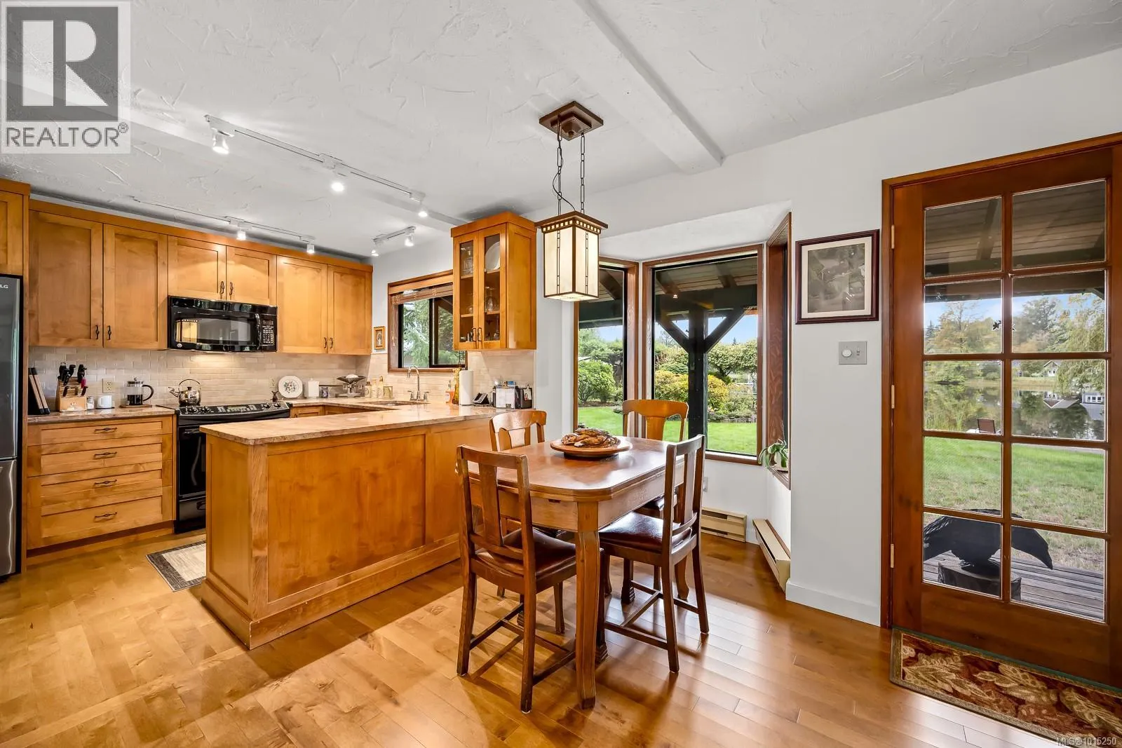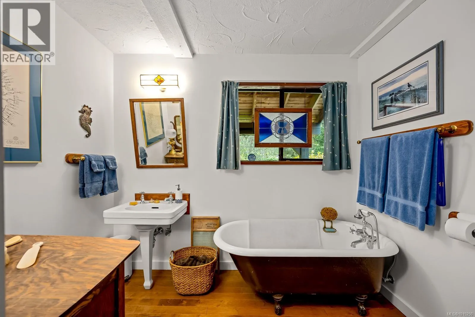 Lakefront home on Robinson Lake with additional accommodation. Set on a peaceful half acre, this classic Cape Cod inspired character home sits right on the shore of Robinson Lake with mountains rising beyond a private, trout-stocked lake. The exterior is clad in custom beveled cedar siding, and the grounds feature mostly perennial, deer-resistant gardens and a storage shed. Enjoy the sun on the sandy beach, or relax beneath the pergola on the lakeside patio. Inside, the 2,128 sq ft layout offers three generous bedrooms plus a versatile bonus room. The primary easily fits a king bed and includes a spa nook with a six-foot soaker tub and shower framed by lake views. An adjacent two-piece bath has room to add a walk-in shower if desired. On the main level, a second bathroom features an authentic clawfoot tub with a pedestal sink originally from the Empress Hotel, adding a little charm. The kitchen offers modern cabinetry, granite counters, two pantries, all appliances, and beautiful lake views. New maple hardwood floors ground the main level, the upper level is carpeted for warmth. Gather in the living room around the wood stove on winter evenings, and stay comfortable and cool through summer and warm in the winter with the mini-split heat pump. Enjoy the bonus of a heated garage connected by a breezeway and carport. There's a full concrete crawlspace that provides ample dry storage with easy access and a solar powered attic ventilation fan. Well maintained with multiple upgrades, including two new 40-gallon hot-water tanks, built-in water filtration, a 2021 roof, an upgraded septic system, and irrigation for lawns and gardens, solar film on upper windows facing the lake. A separate, self-contained studio suite above garage with lake views adds flexible accommodation with its own entrance, high ceilings, kitchen, three-piece bath, and air conditioning, ideal for guests, family, or creative work. Lakeside living, timeless charm, and thoughtful updates ready to enjoy. (id:27476)