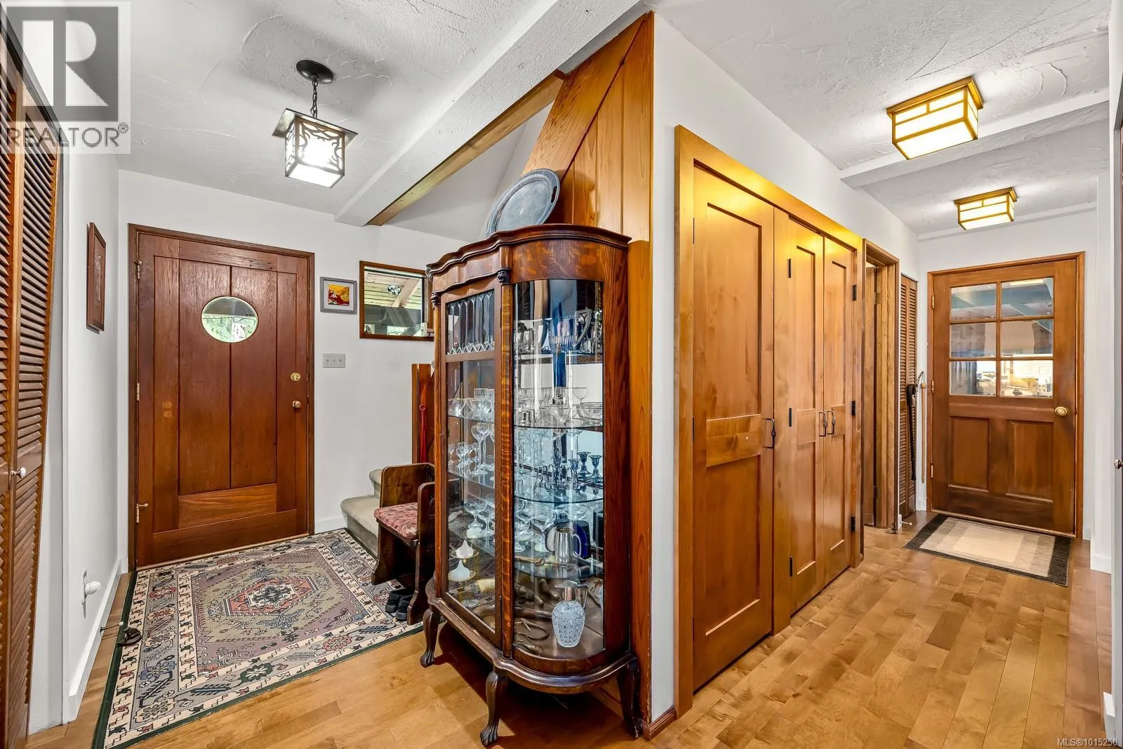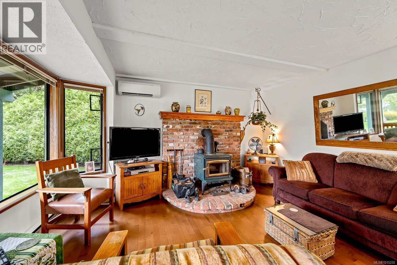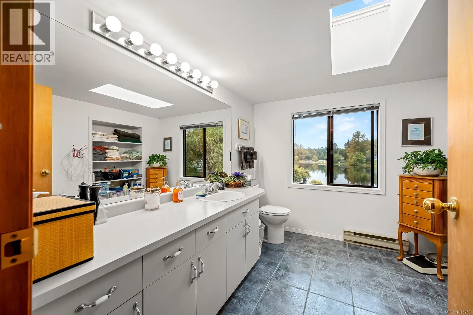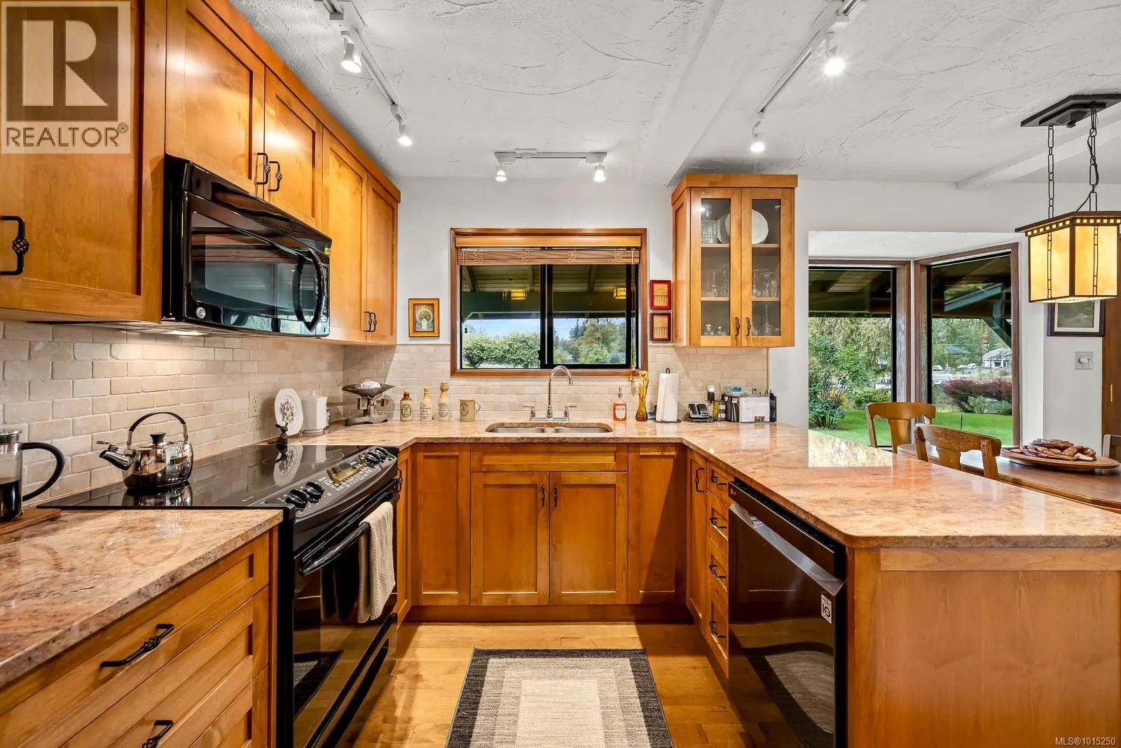 Lakefront home on Robinson Lake with additional accommodation. Set on a peaceful half acre, this classic Cape Cod inspired character home sits right on the shore of Robinson Lake with mountains rising beyond a private, trout-stocked lake. The exterior is clad in custom beveled cedar siding, and the grounds feature mostly perennial, deer-resistant gardens and a storage shed. Enjoy the sun on the sandy beach, or relax beneath the pergola on the lakeside patio. Inside, the 2,128 sq ft layout offers three generous bedrooms plus a versatile bonus room. The primary easily fits a king bed and includes a spa nook with a six-foot soaker tub and shower framed by lake views. An adjacent two-piece bath has room to add a walk-in shower if desired. On the main level, a second bathroom features an authentic clawfoot tub with a pedestal sink originally from the Empress Hotel, adding a little charm. The kitchen offers modern cabinetry, granite counters, two pantries, all appliances, and beautiful lake views. New maple hardwood floors ground the main level, the upper level is carpeted for warmth. Gather in the living room around the wood stove on winter evenings, and stay comfortable and cool through summer and warm in the winter with the mini-split heat pump. Enjoy the bonus of a heated garage connected by a breezeway and carport. There's a full concrete crawlspace that provides ample dry storage with easy access and a solar powered attic ventilation fan. Well maintained with multiple upgrades, including two new 40-gallon hot-water tanks, built-in water filtration, a 2021 roof, an upgraded septic system, and irrigation for lawns and gardens, solar film on upper windows facing the lake. A separate, self-contained studio suite above garage with lake views adds flexible accommodation with its own entrance, high ceilings, kitchen, three-piece bath, and air conditioning, ideal for guests, family, or creative work. Lakeside living, timeless charm, and thoughtful updates ready to enjoy. (id:27476)