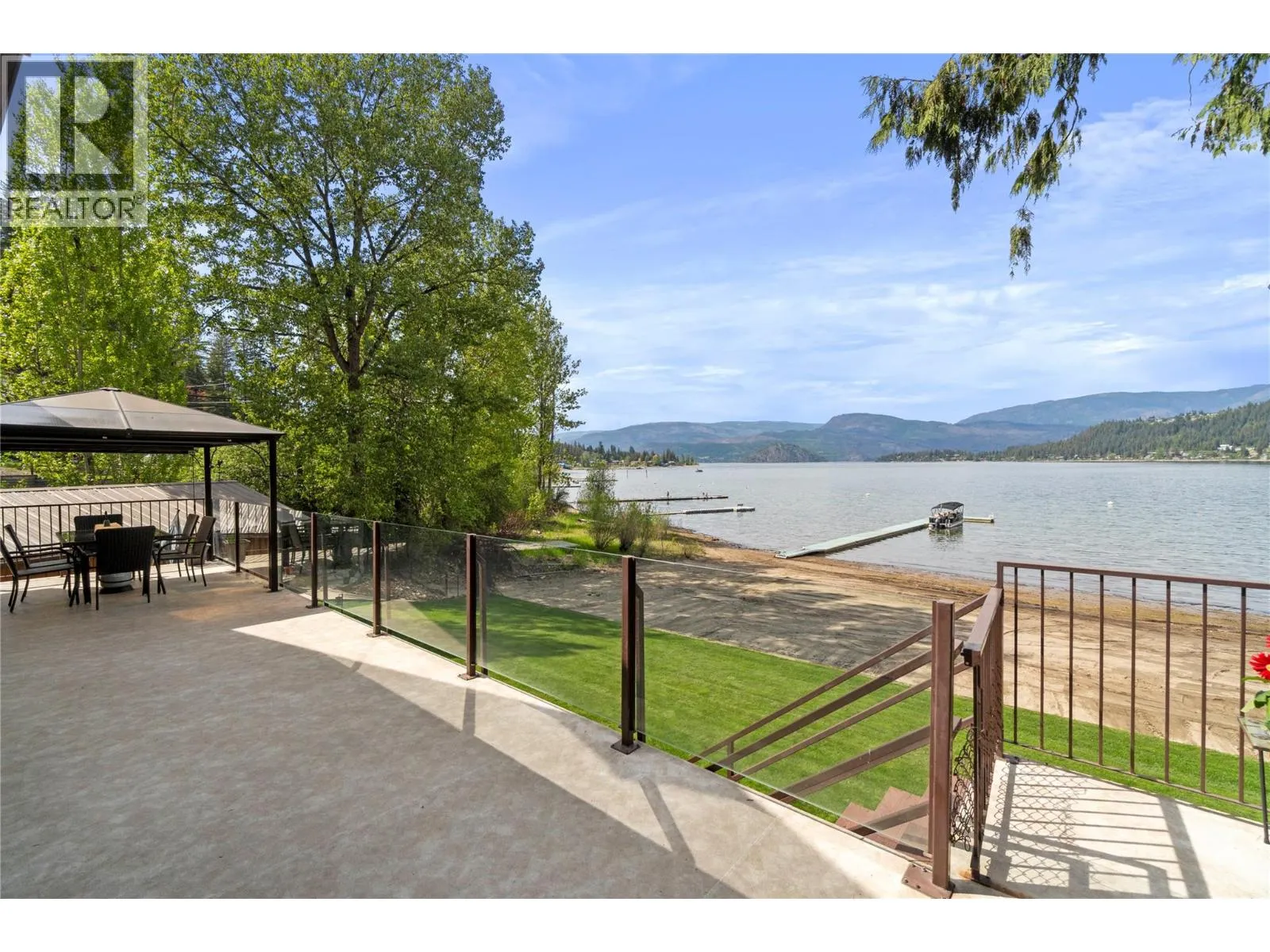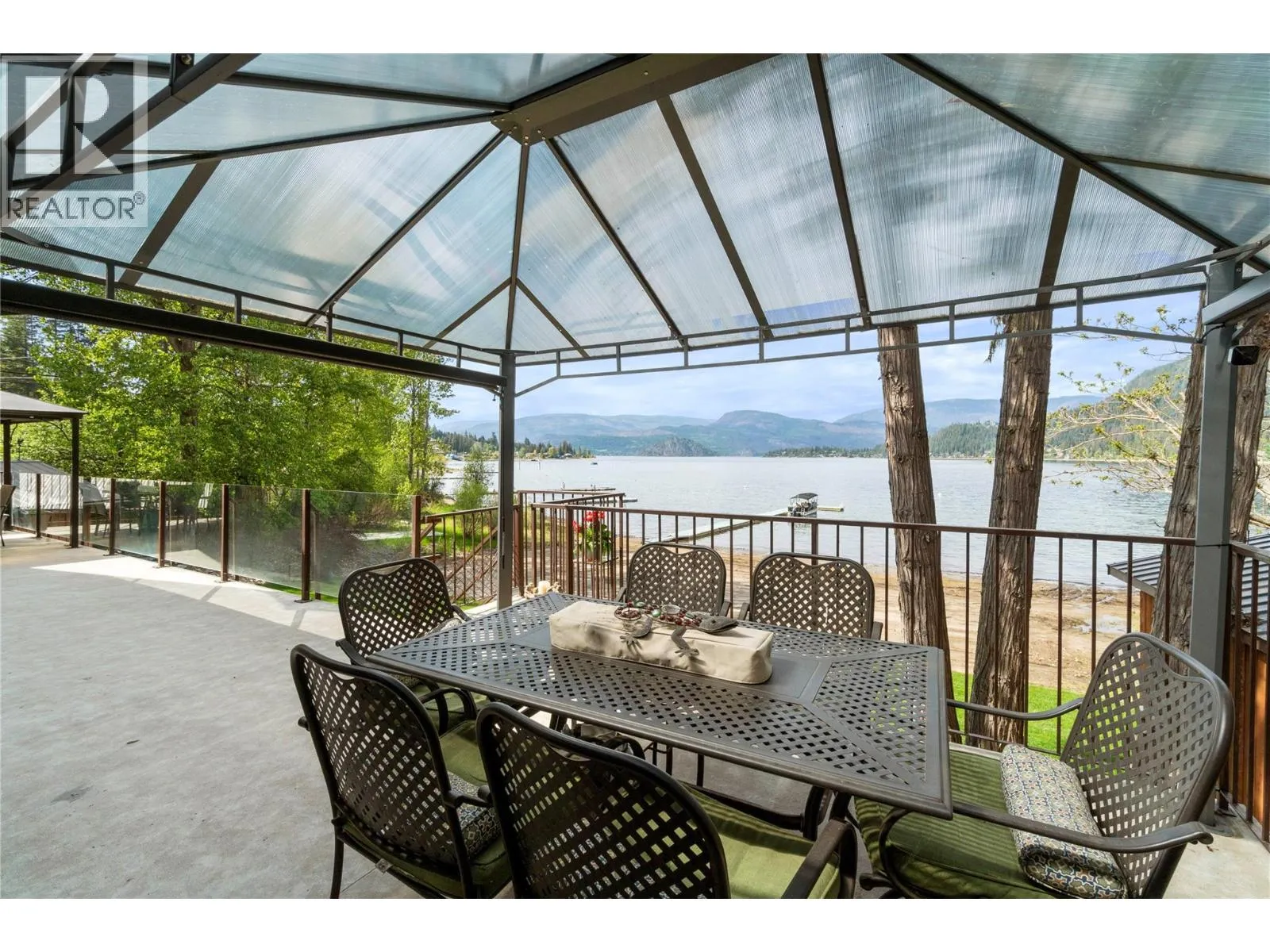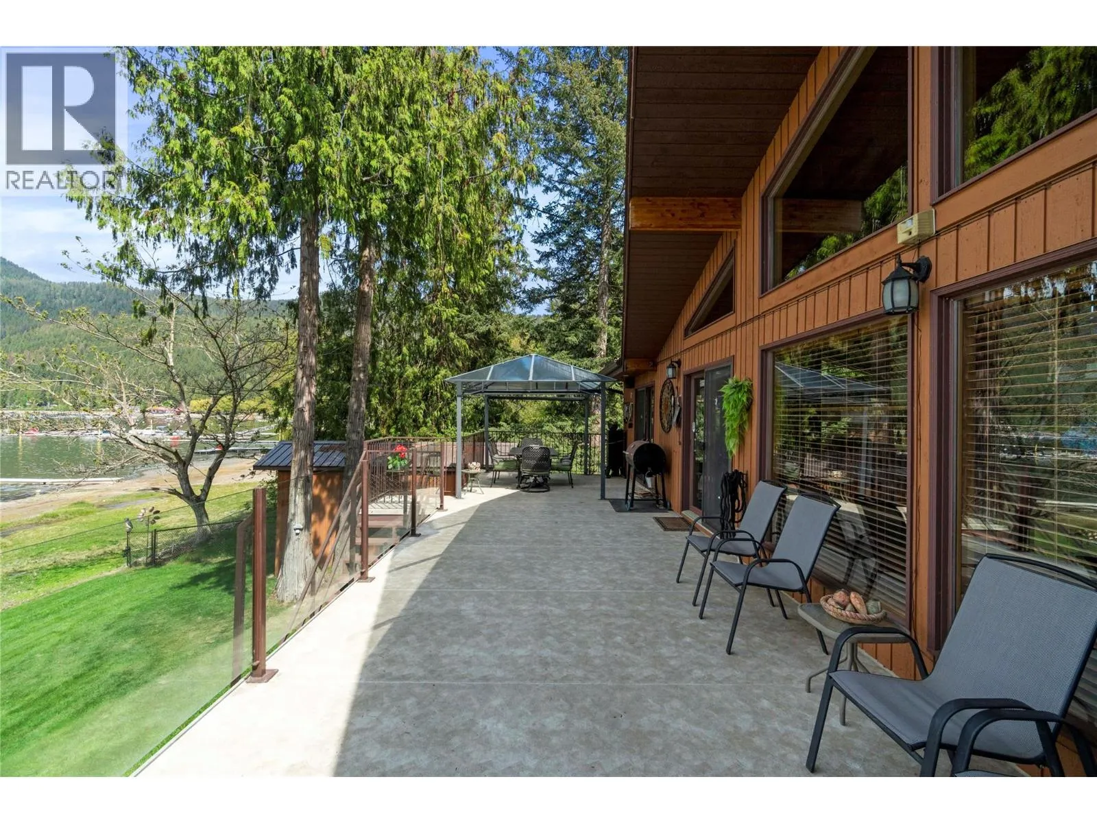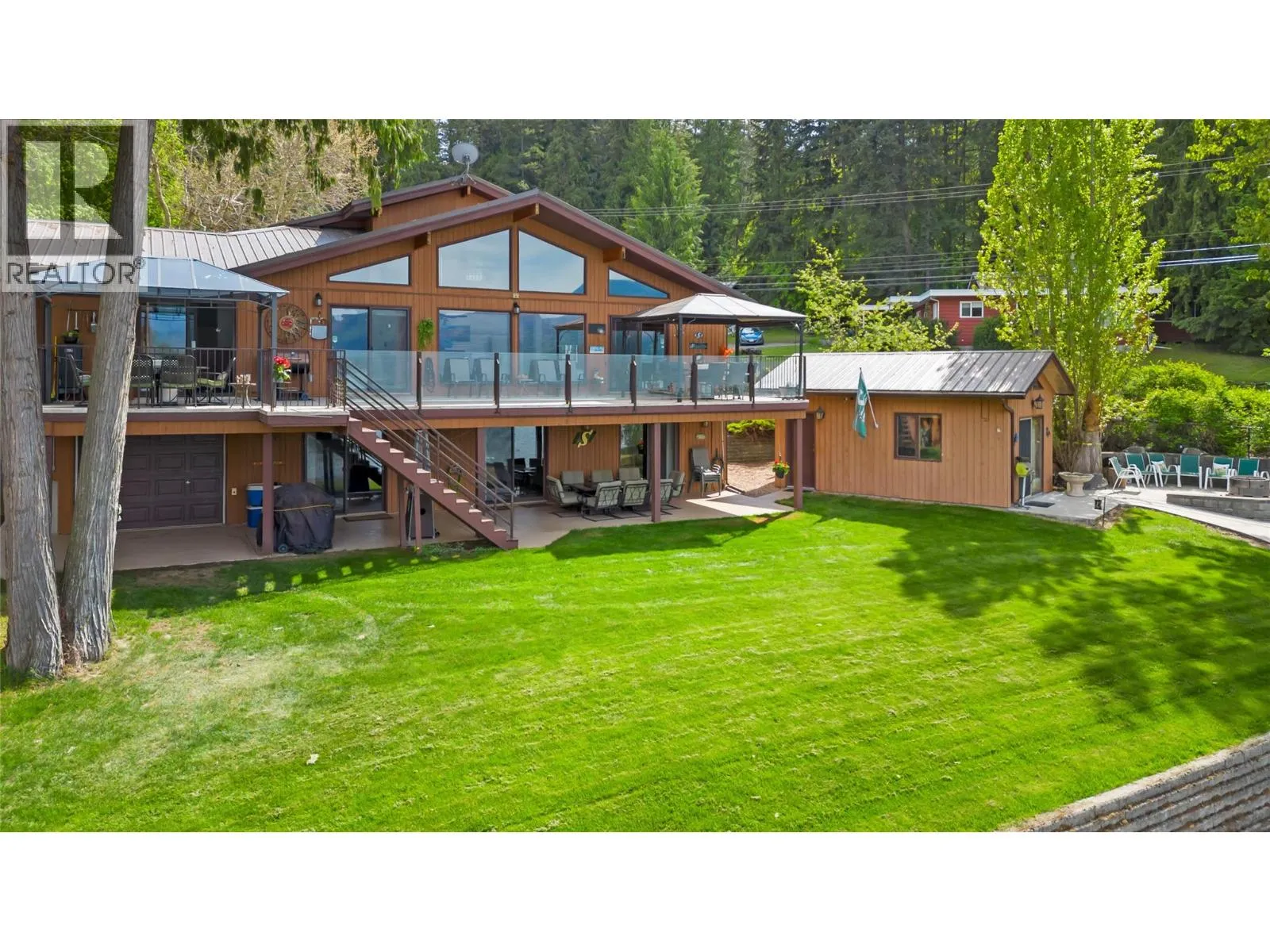 Conveniently located near local amenities, dining, and just 20 minutes to Salmon Arm, this Blind Bay waterfront property presents a rare opportunity to secure a prime position on Shuswap Lake, set along 121 feet of soft, weedless sandy beach with a registered 130-foot dock. Ideally positioned to capture views of Copper Island and the surrounding lake from nearly every room, including all bedrooms with sliding doors to the deck, along with the living room, kitchen and dining area featuring three access points to the expansive balcony. This well-cared-for 2,642 sq ft custom home offers vaulted cedar ceilings, handcrafted cedar doors, 4 bedrooms and 3 bathrooms, plus a 280 sq ft self-contained guest cottage. The main floor showcases engineered hardwood and an open, comfortable living space, with a kitchen appointed with granite countertops, oak cabinetry and quality appliances. A 1,408 sq ft four-bay drive-through garage with acrylic pebble flooring is complemented by two detached garages. The property includes lake intake water, private septic, parking for 6+ vehicles, and secure fenced storage for boat, trailer or RV, along with a detached boathouse and shed. Enjoy a lakeside fire pit, level grassy play area, pristine sandy beach and a spacious glass-railed balcony in an exceptional year-round waterfront residence. (id:27476)