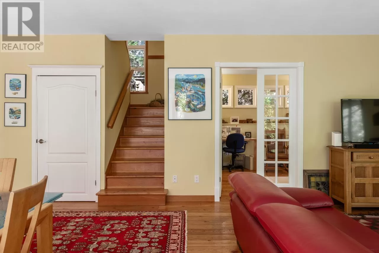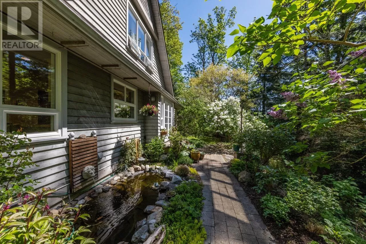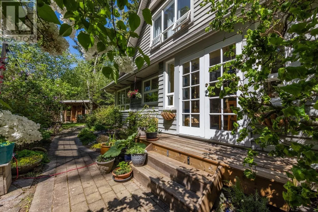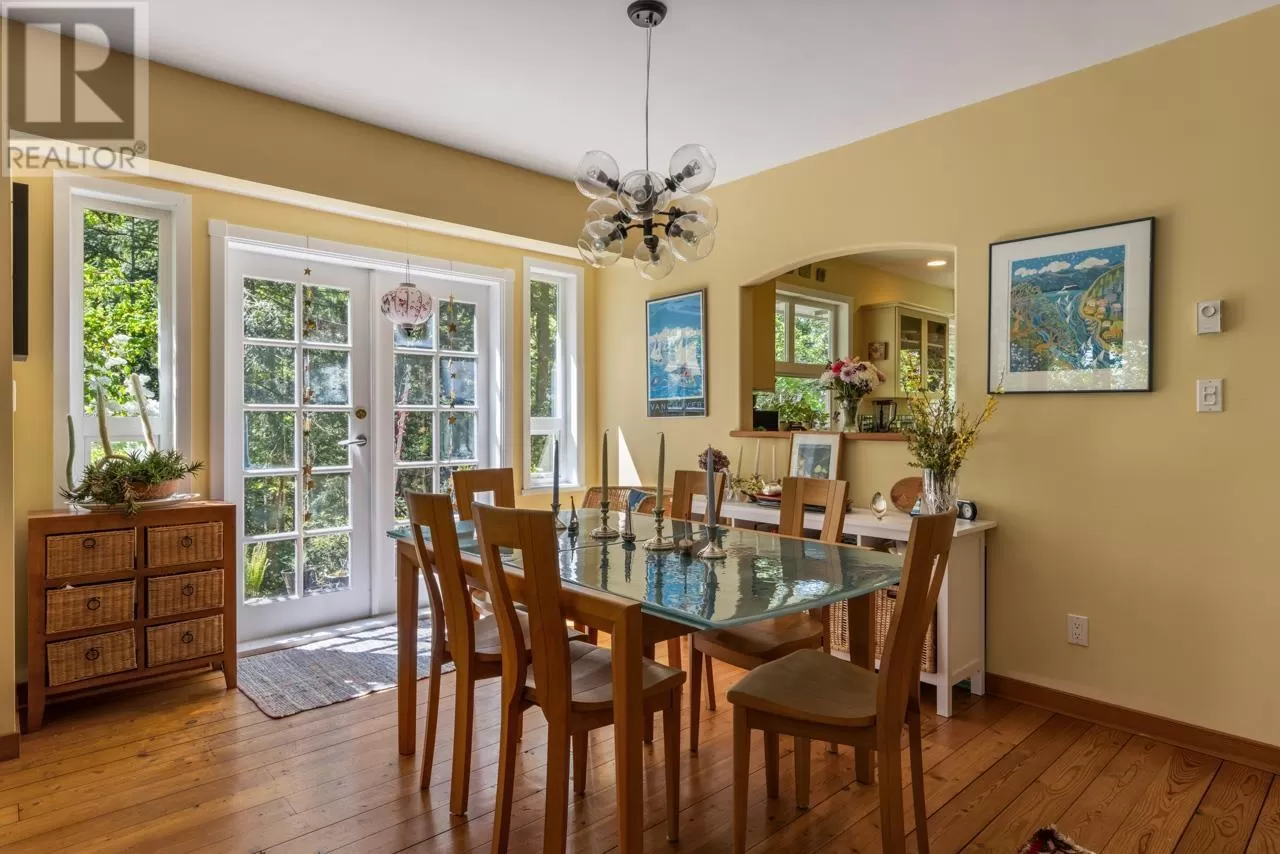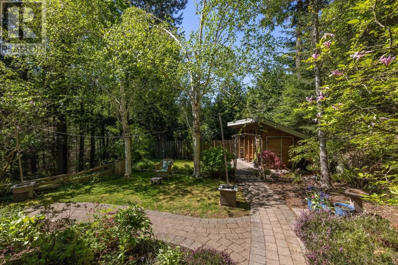 Perched on picturesque Cates Hill, this beautifully secluded 3-bedroom home offers peace, privacy, and nearly an acre of lush grounds. Surrounded by greenery, this tranquil retreat invites you to relax and unwind. Inside, the bright and airy open-concept living and dining area is filled with natural light, featuring rich hardwood floors and a cozy wood-burning fireplace that adds charm and warmth. The upper level includes a generous primary suite with ensuite bath, while two additional bedrooms, a full bathroom, and a convenient main floor powder room complete the thoughtful layout. French doors off the dining room open to a sun-soaked patio, ideal for relaxing or entertaining in the garden setting. Bonus features include a private outdoor shower, covered secondary patio, and proximity to Bowen Island Community School. A rare offering in an idyllic location. (id:27476)