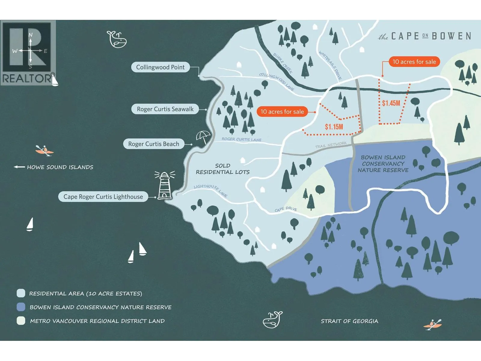 Southwest tip of Bowen Island. Along the western waterfront is a 1-km sunset trail connecting three iconic viewpoints. 272 acres is a managed, publicly accessible conservation park, incl.112 acres of southern waterfront. Sunny western exposure. 3 minute walk to beach. Certified wells. Septic pre-approved. 48,438 sf total buildable area permitted: primary residence, secondary dwelling, and up to 20 secondary structures for farm stable, home-based business, workshop, studio, guest cottages (max 5, totalling 93sm or 1001sf). An idyllic, tight-knit community of caring neighbors who form truly intimate human connection based on shared lifestyle, passions and values. Residents get together and look out for each other. Children play with neighboring children. (id:27476)