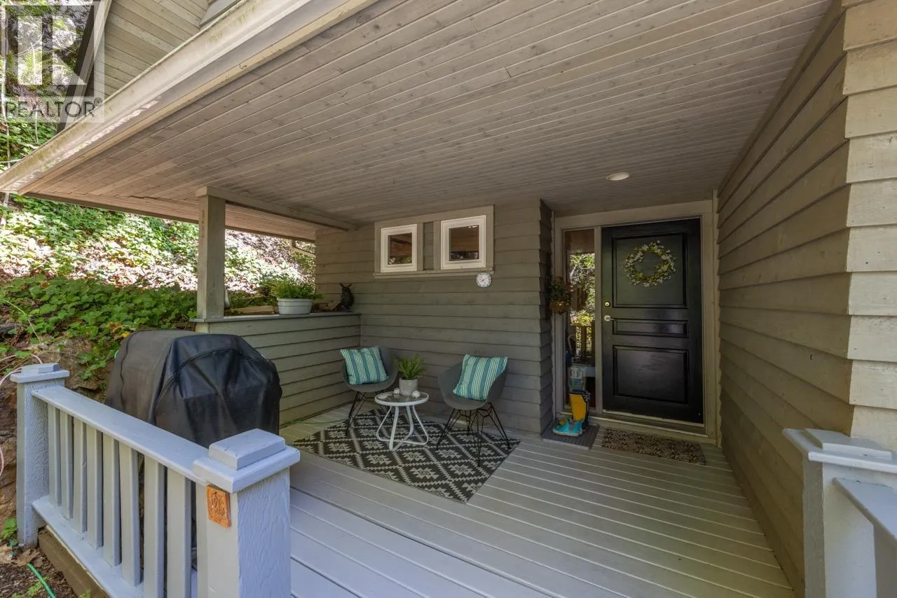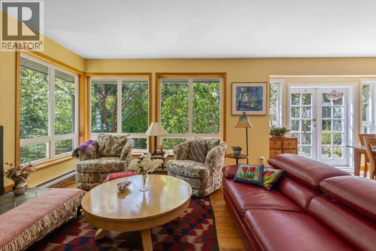 Perched on picturesque Cates Hill, this beautifully secluded 3-bedroom home offers peace, privacy, and nearly an acre of lush grounds. Surrounded by greenery, this tranquil retreat invites you to relax and unwind. Inside, the bright and airy open-concept living and dining area is filled with natural light, featuring rich hardwood floors and a cozy wood-burning fireplace that adds charm and warmth. The upper level includes a generous primary suite with ensuite bath, while two additional bedrooms, a full bathroom, and a convenient main floor powder room complete the thoughtful layout. French doors off the dining room open to a sun-soaked patio, ideal for relaxing or entertaining in the garden setting. Bonus features include a private outdoor shower, covered secondary patio, and proximity to Bowen Island Community School. A rare offering in an idyllic location. (id:27476)