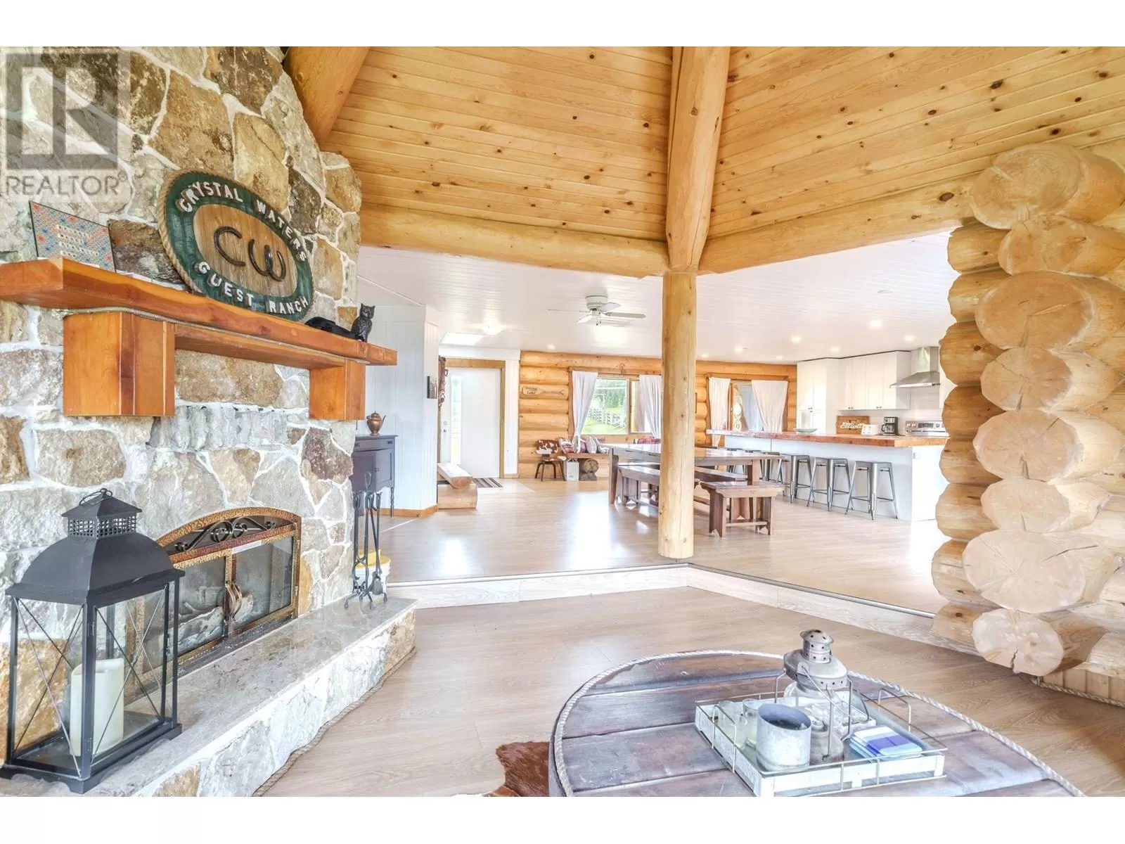 Amongst the rolling hills of British Columbia's Cariboo Chilcotin, on the shores of Crystal Lake you will find this spectacular property located on 17.9 beautiful acres. Operated as a Guest Ranch until recently and features a beautiful family home along with 7 guest cottages, RV sites, dry sauna, hot tub, trampoline, outdoor BBQ area with kids play area. The amazing waterfront is perfect for swimming, boating, fishing or whatever your heart desires. The acreage is fenced and cross fenced and is ready for horses. Located approx. 45 min from 100 Mile House and 4 hours from the Lower Mainland, getting here is quick and easy; for the aviation enthusiast, you can land and tie up your float plane right at the dock. This is a one of a kind property and must be seen. (id:27476)