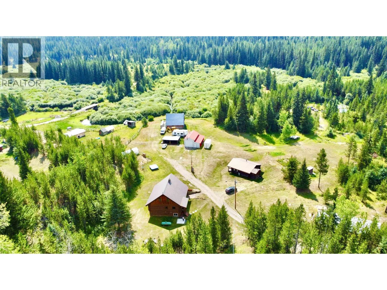 Embrace the Cariboo lifestyle on this stunning 23.5-acre property with Bridge Creek meanduring through. This well-built log home features a spacious loft currently used as the primary bedroom, along with three additional bedrooms and two full bathrooms. Country style kitchen and spacious living room with large vaulted ceiling and windows to allow lots of natural light. Stay cozy year-round with forced air propane and wood furnaces, complemented by a centrally located wood stove. The property also includes a seasonally serviced guest cabin, a 25' x 32' detached workshop (heated and wired), and a 26' x 30' rustic barn with power, making it ideal for setting up your own hobby farm or simply enjoying the peaceful surroundings. Don't miss this opportunity to enjoy country living at its finest. (id:27476)
