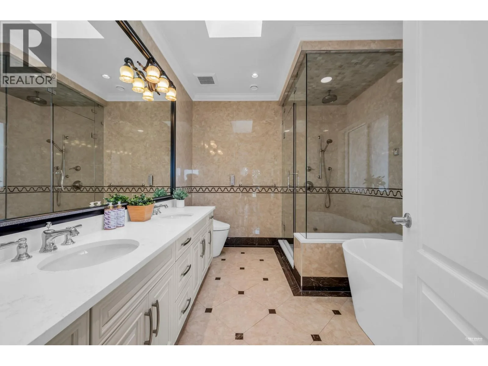 Stunning luxurious custom built home located in desirable Burnaby North Parkcrest area. This expansive 4800+ sqft living space on 8000 sf lot with huge south facing backyard. Elegant style finishing with 10' ceilings in each floor. Top quality appliances with huge island plus perfect size Wok kitchen makes you a dream kitchen. Very practical layout with separate living, dining, family area and spacious office. Entertainment decks out of huge family room. 4 large bedroom and 4 full bathroom upstairs. Basement offers huge entertaining & relaxing space including spacious home theater and sauna room. 2 bedroom guess suite with separate entrance. 2 car garage&more parking space. OPEN HOUSE: Sat (Nov 15) at 2-4PM! (id:27476)