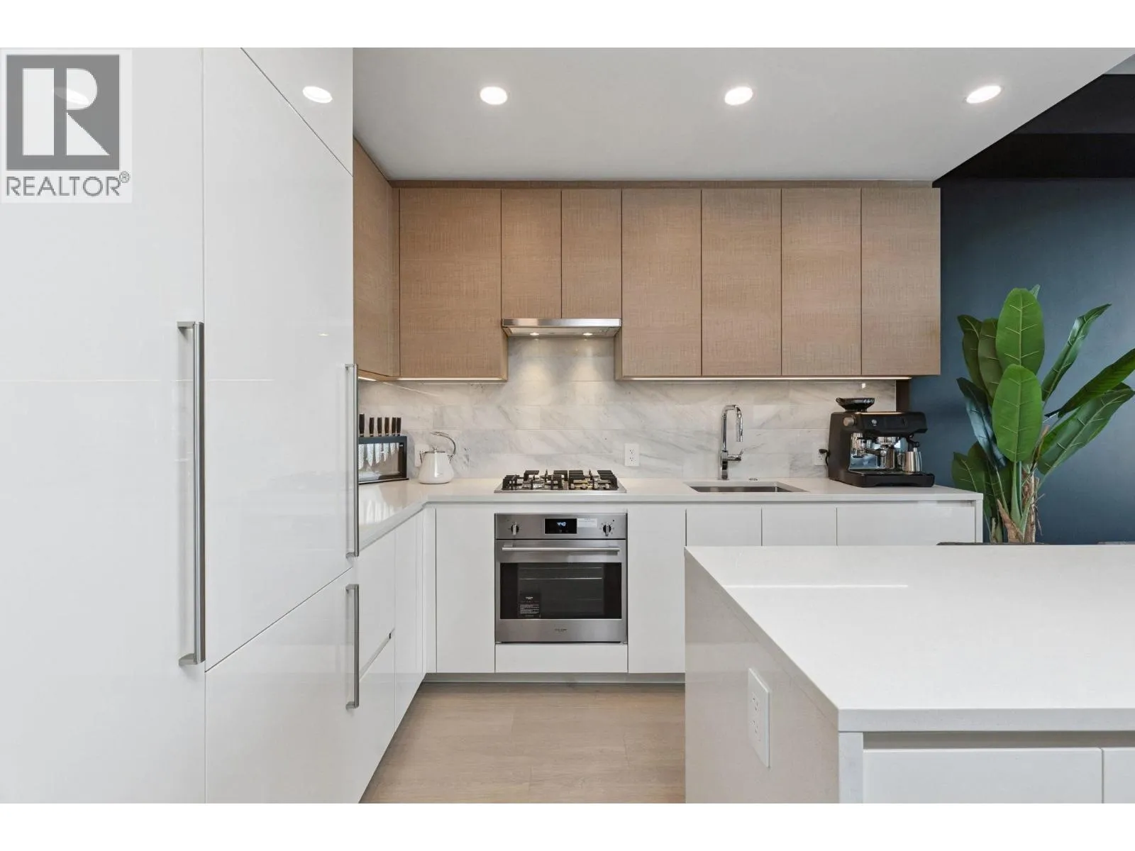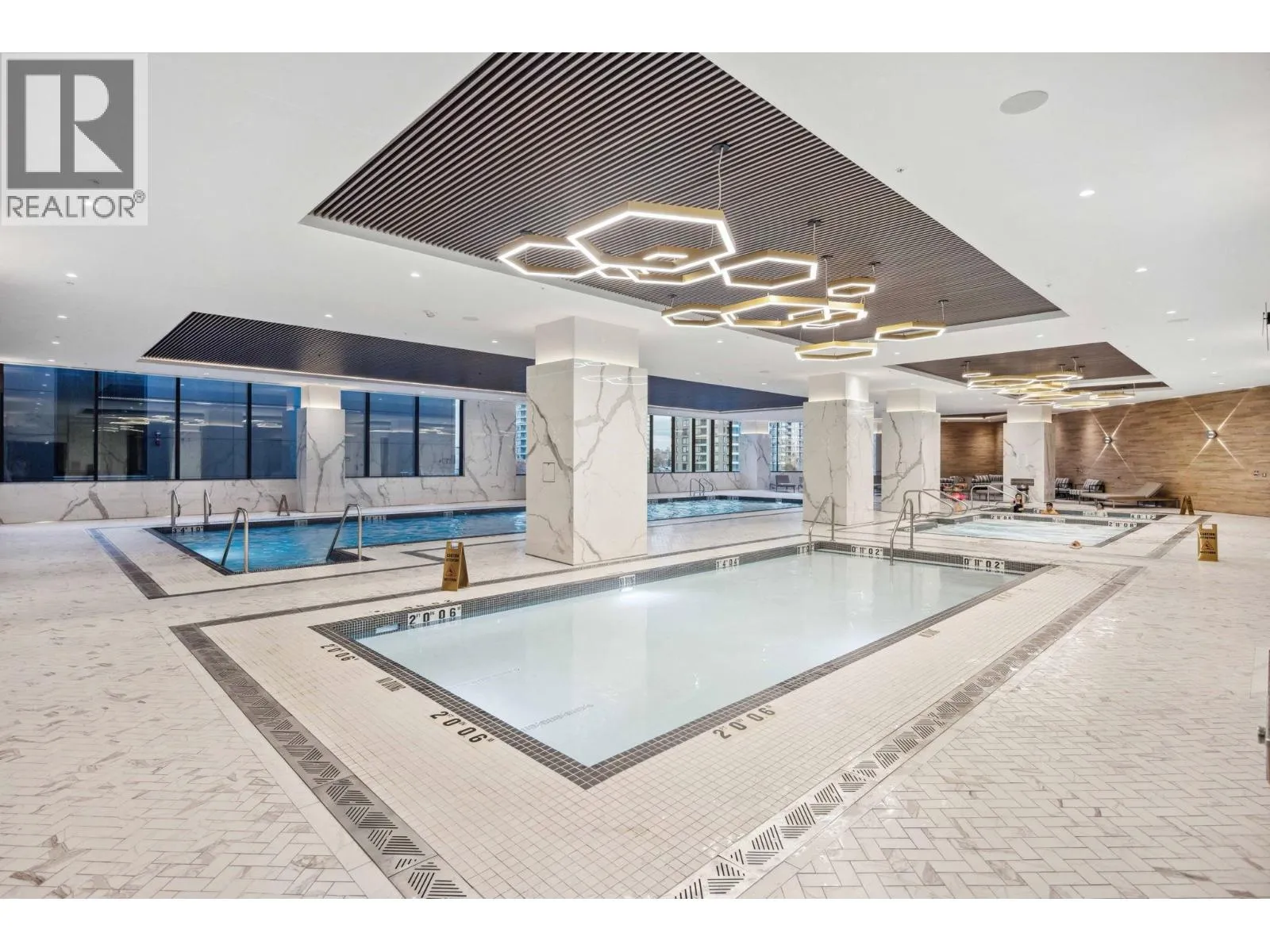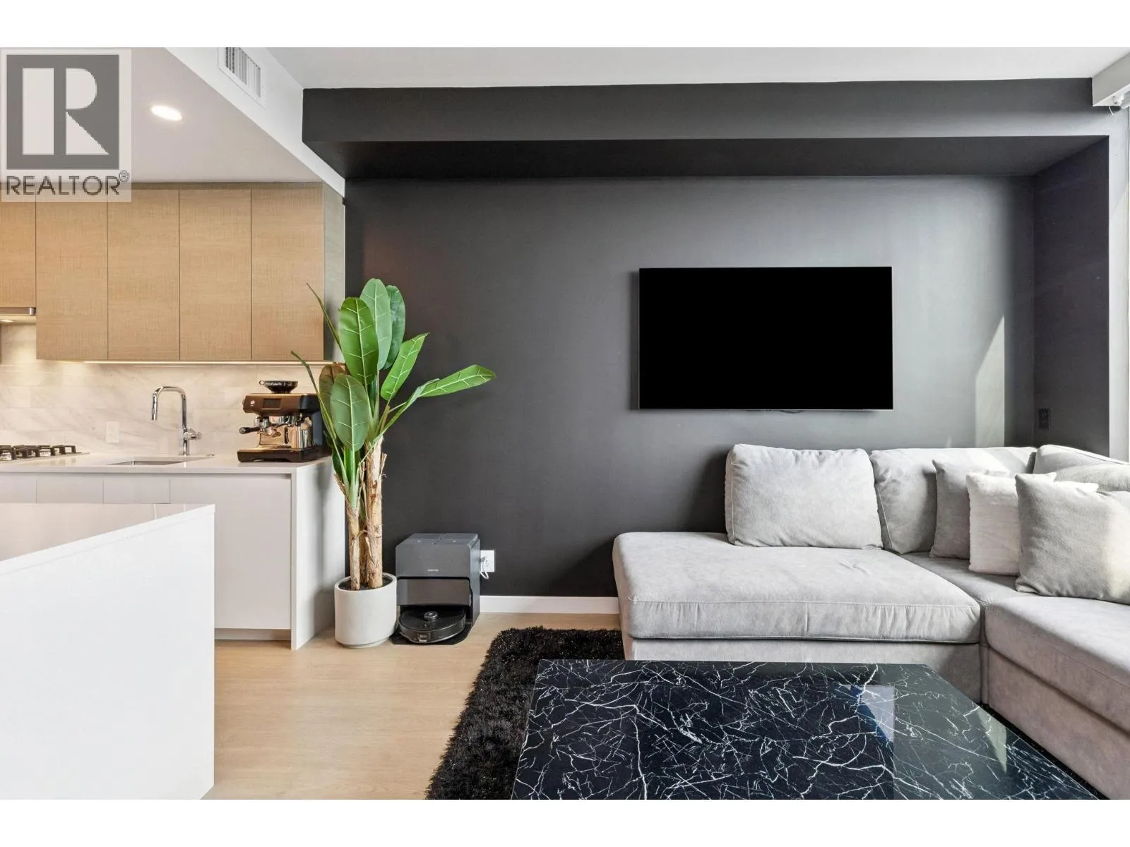 Welcome to Gilmore Place - where modern elegance meets resort style living. This junior 2-bed, 1-bath features soaring 9.5' ceilings, electric blinds, and a South facing open layout. The Italian gourmet kitchen with waterfall stone island perfect for entertaining, complemented by a premium appliance package, gas cooktop, A/C, upgraded flooring, and built-in speakers with integrated Sonos system. Your private balcony offers a peaceful retreat amid the city´s vibrance. Enjoy 75,000+ SF of world-class amenities - 24-hr concierge, fitness center, pools, golf simulator, bowling alley, karaoke lounge, steam & sauna rooms and more. Steps to Gilmore SkyTrain, Amazing Brentwood & T&T Supermarket. 1 EV parking + 1 storage included. (id:27476)