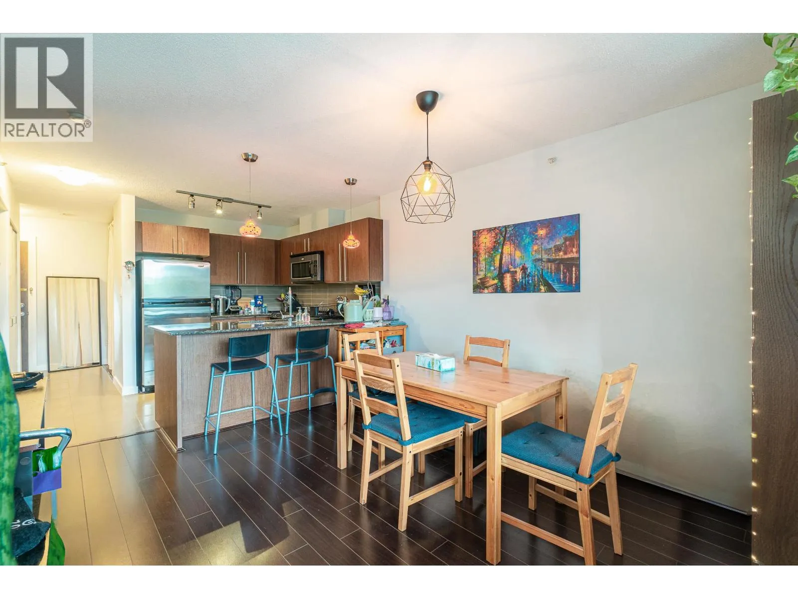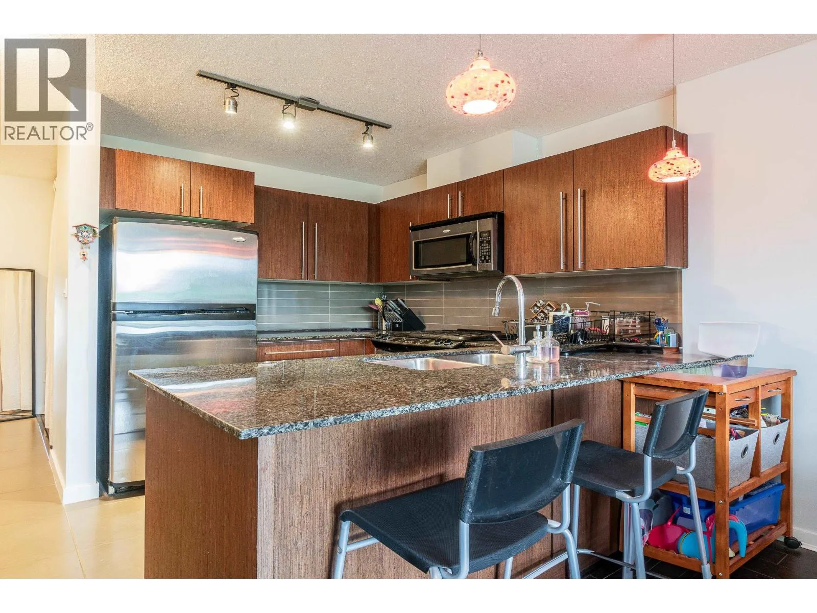 Central location, quiet north facing 1 bedroom room and den unit has great view to North Shore Mountains and Downtown, really well kept, bright and spacious with open floor plan, granite counter top with stainless appliances, electrical fire place, large outdoor patio, 1 parking and storage. Walking distance to Amazing Brentwood and Skytrain Station. (id:27476)