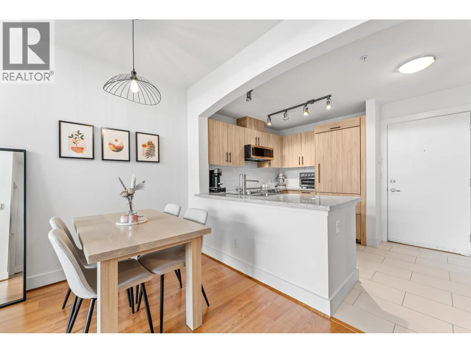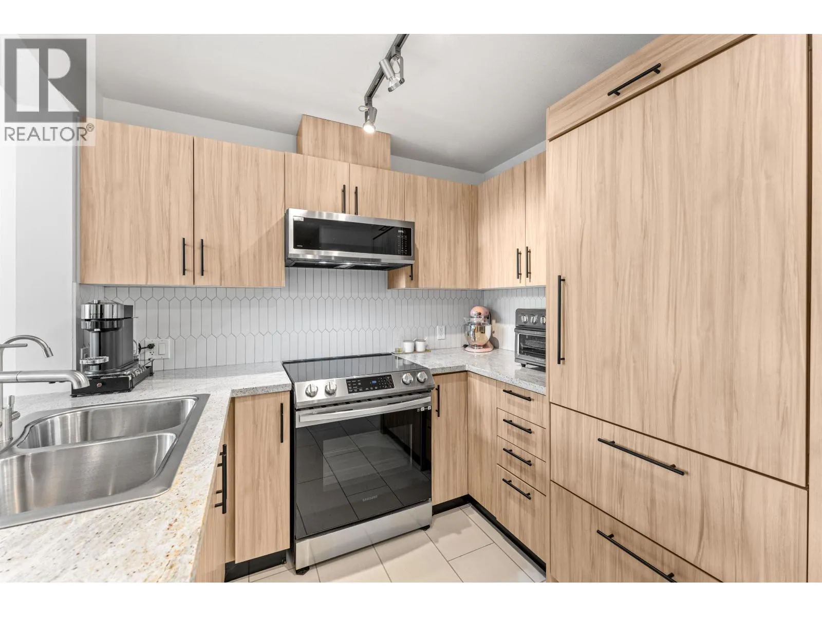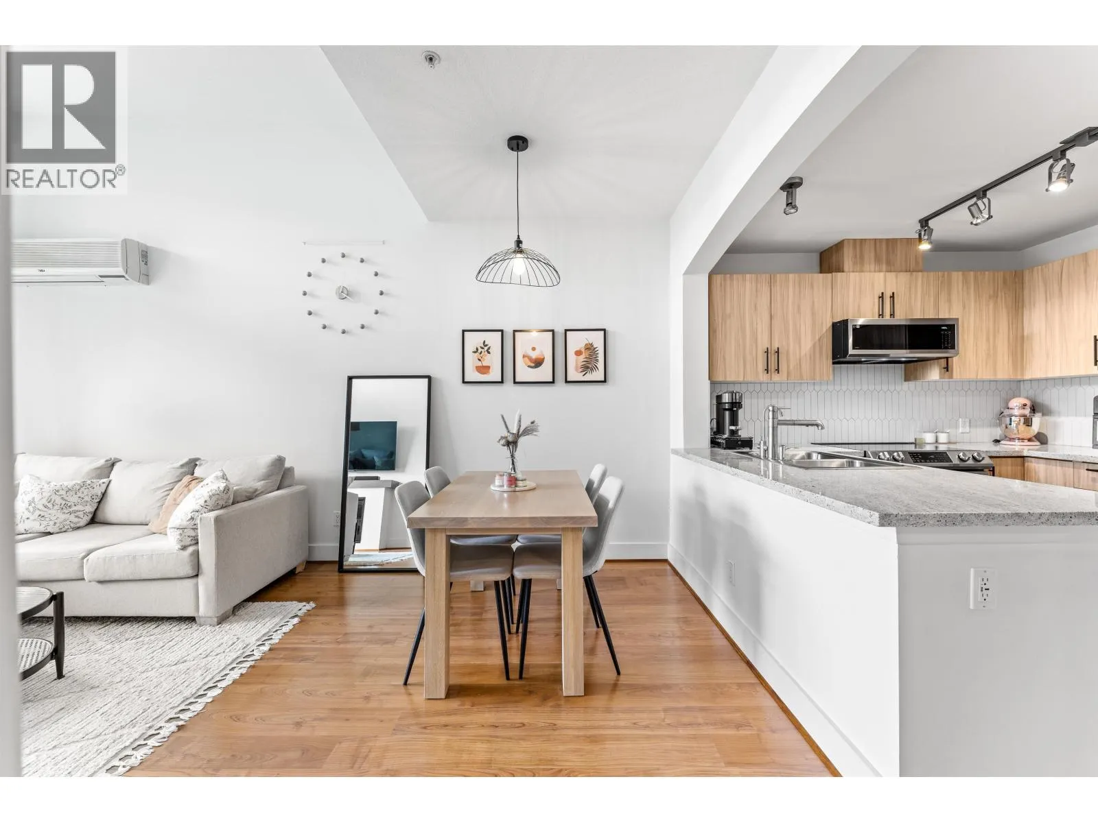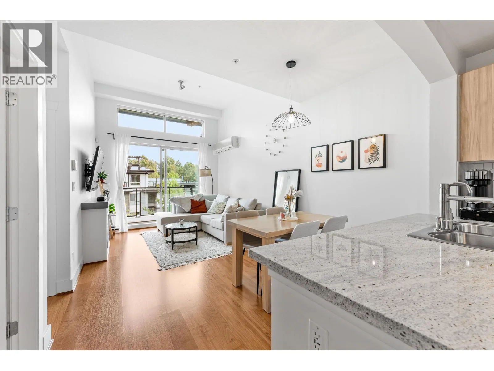 Bright, air conditioned 1 bedroom and den Penthouse suite in GREEN, by Adera. Features include 11ft+ vaulted ceilings in the living/ dining room, updated open plan kitchen equipped with new high end appliances & upgraded cabinet doors, granite countertops with large peninsula/ eating bar and custom backsplash . Beautiful laminate floor. The suite is impeccably maintained, and opens onto a large sundeck with views to the South, overlooking beautiful gardens. Upgraded washer /dryer. 1 parking and 1 storage locker. Amenities include clubhouse, fitness center, sauna, games room and more. Lots of visitor parking. Open House Sunday Nov 16, 2-4pm. (id:27476)