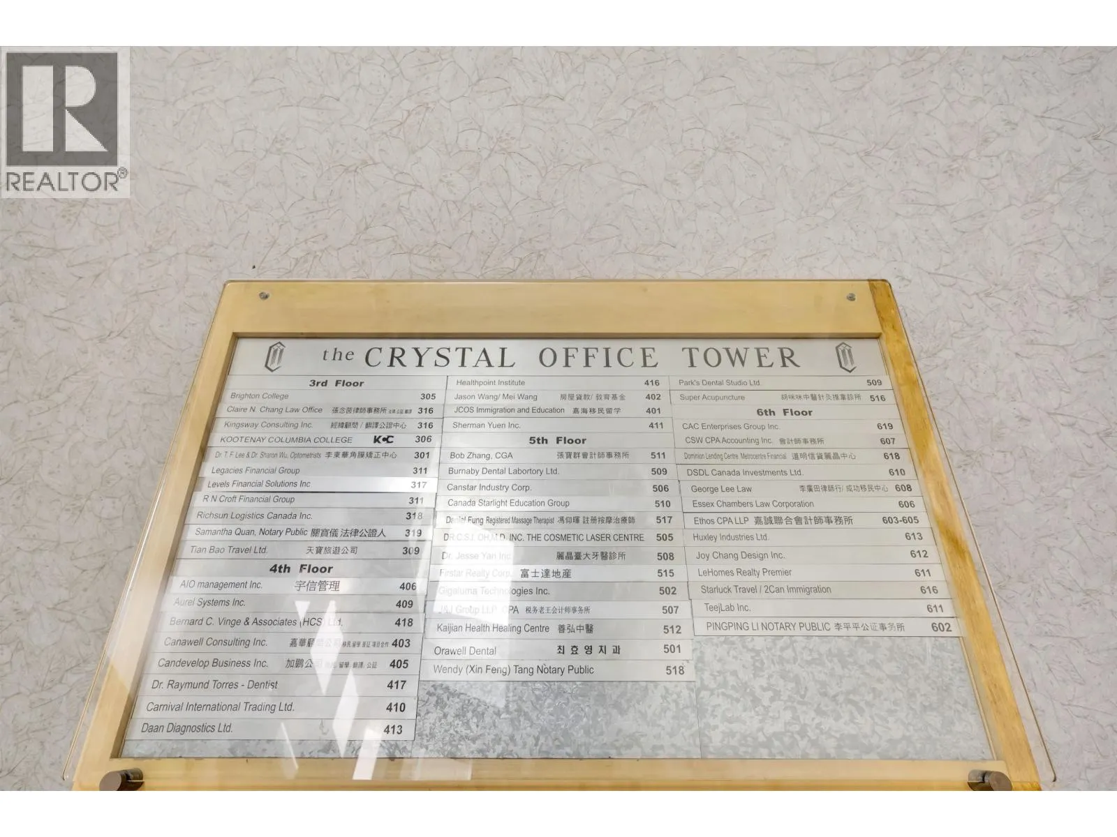 Excellent Owner-User or Investment Opportunity ' 1138 sq.ft. professional office in the highly sought-after Crystal Mall Office Tower, facing Kingsway with mountain views. Improved with 5 private offices, open work space, kitchenette and reception and client area. Long-term owner since 1999 operating a well-established accounting practice. Direct access to Crystal Mall retail, food court and parking, steps to Metrotown SkyTrain. Unit 606 (633 sqft) also available for purchase. Owner upsized to bigger location, vacant possession available Dec. (id:27476)