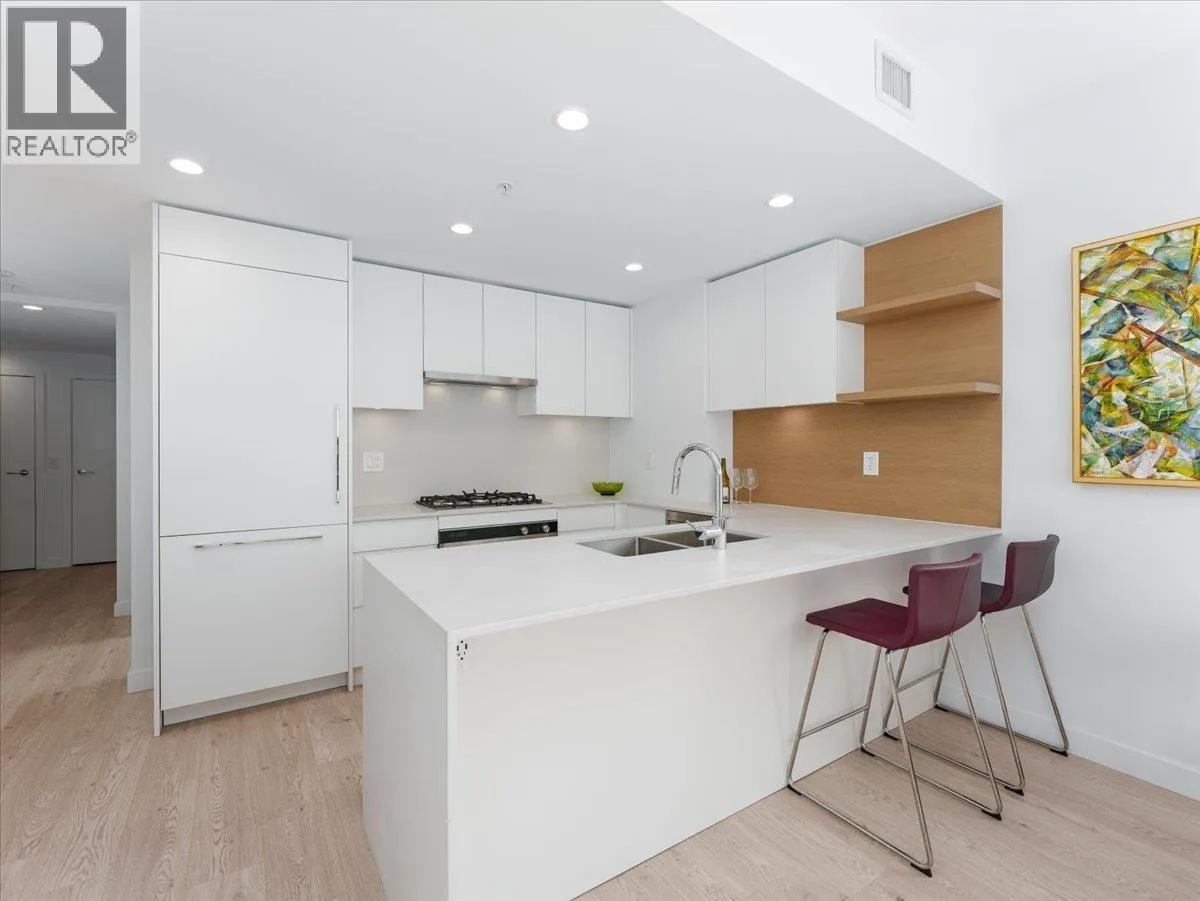 Welcome to this rare patio home at Akimbo in Brentwood. This 2 bed, 2 bath corner unit offers a highly efficient layout with no shared bedroom walls, 9´ ceilings, floor-to-ceiling windows, and air conditioning throughout. The highlight is the massive 603 sq. ft. west-facing wraparound patio overlooking quiet green space-ideal for entertaining, relaxing, or enjoying sunset views. The sleek kitchen features quartz countertops, a gas cooktop, and integrated appliances. Both bedrooms are well-separated and generously sized. Includes 1 parking and 1 locker. Akimbo is a bold architectural statement in the heart of Brentwood and offers premium amenities including 24/7 concierge, fitness centre, party lounge, guest suite, garden, and rooftop BBQ area. Steps to Gilmore SkyTrain, Brentwood Mall, Whole Foods, parks, and restaurants. Pet and rental friendly. Still under new home warranty. OPEN HOUSE SAT NOV 1st 12:30-2:00 (id:27476)