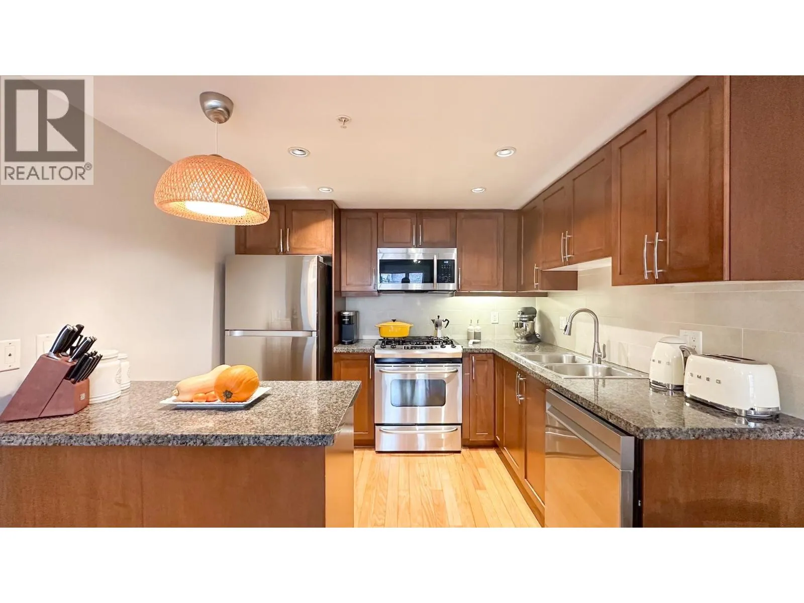 Welcome to Mondeo! Beautifully appointed 2 bed + den, 2 bath upper floor home in one of Burnaby's most desirable neighbourhoods. This bright and spacious 833 square ft unit features an open-concept layout with hardwood floors, granite counters, stainless steel appliances, gas range, and large windows that fill the space with natural light. The private balcony offers peaceful city and mountain views - perfect for evening sunsets. Primary bedroom includes a full ensuite and generous closet space. Enjoy in-suite laundry, secure parking, and storage locker. Concrete low-rise built in 2007, pet and rental friendly. Steps to cafes, restaurants and shops along Hastings Street, with easy access to transit and downtown Vancouver. A perfect choice in Burnaby Heights! (id:27476)