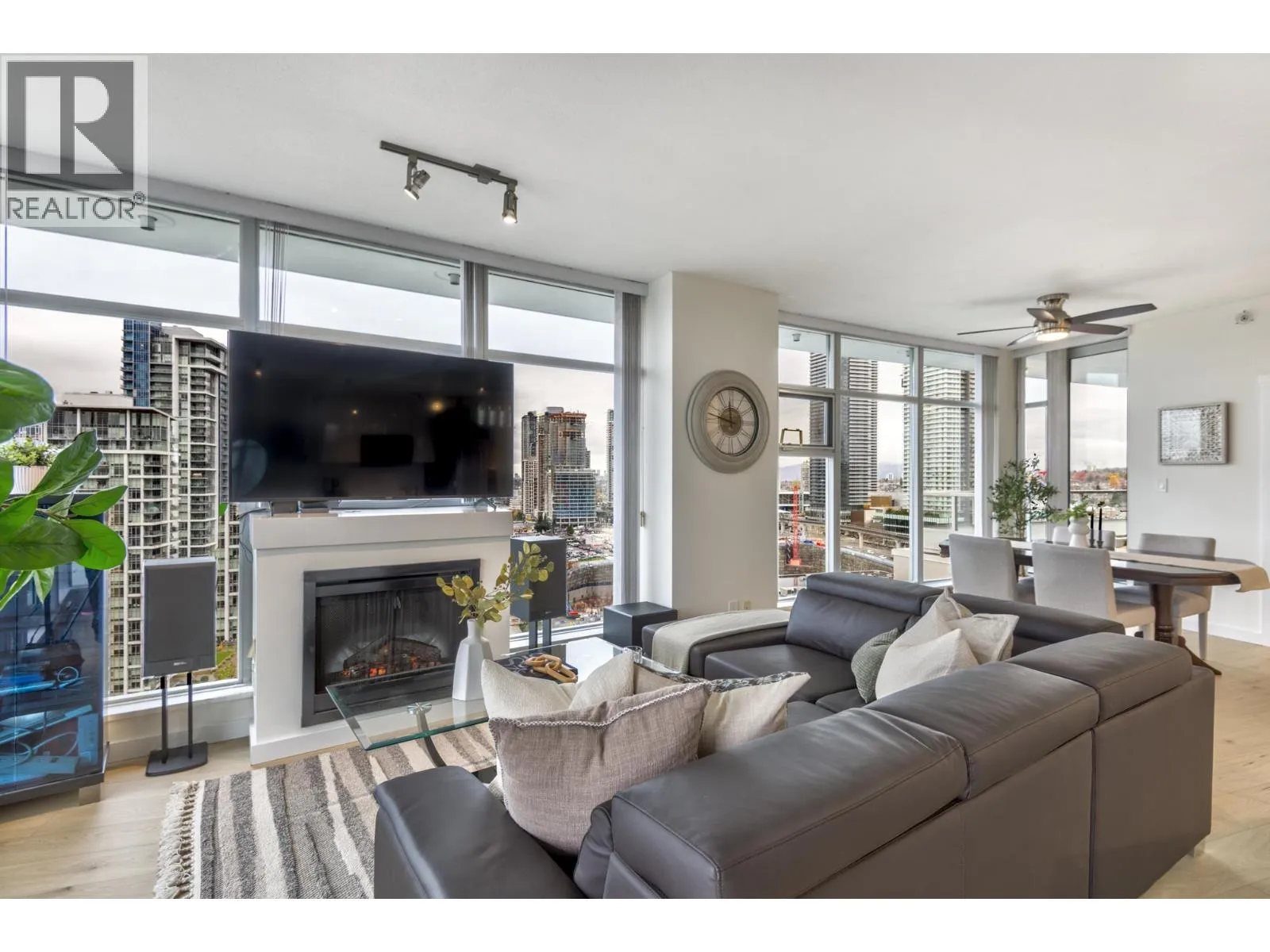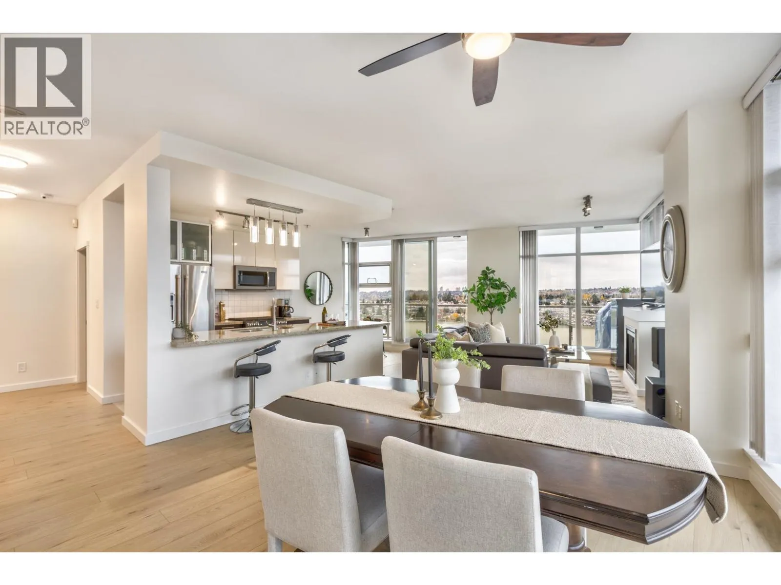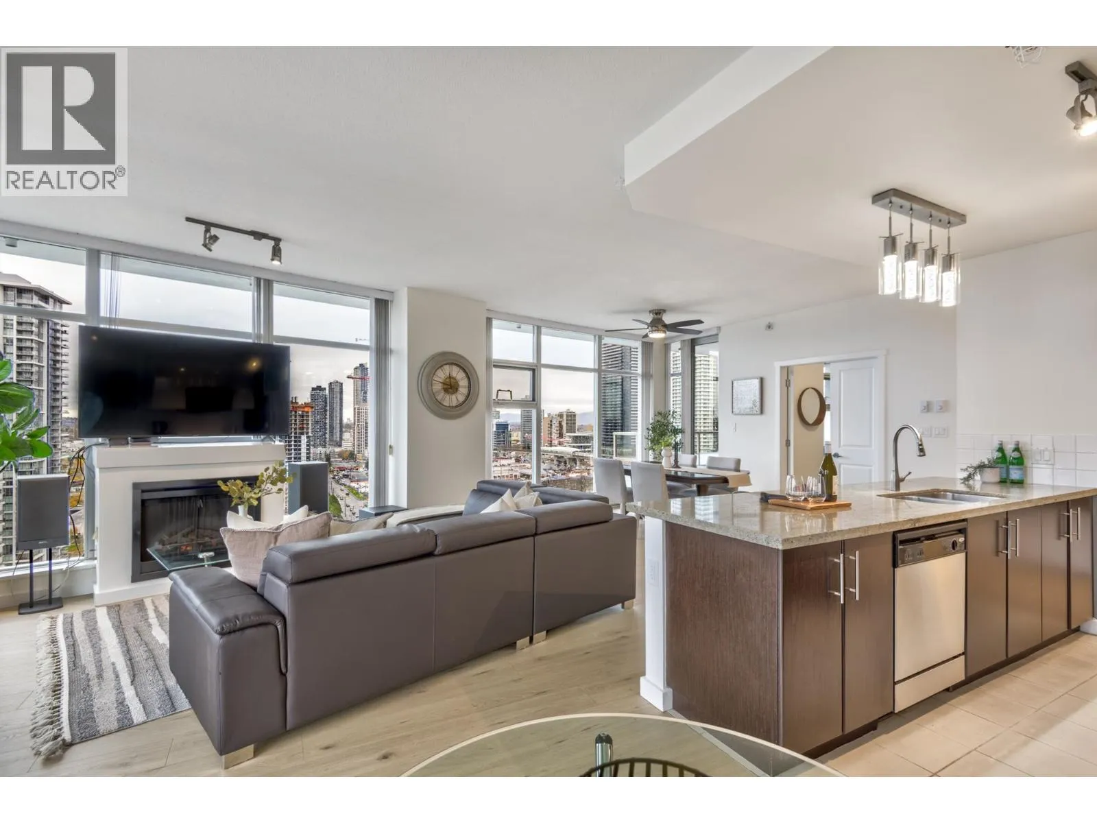 Watercolors by Polygon! A rare 3 bedroom 1,278 sqft SW corner Penthouse with sweeping views of Mt. Baker, Metrotown & the North Shore Mountains from 2 private balconies, plus stunning sunsets. Featuring new paint & laminate flooring, floor-to-ceiling windows, granite counters, tiled baths & a cozy electric fireplace. The kitchen offers stainless appliances, gas stove, a breakfast bar & bright eating area. The primary includes a walk-through closet & luxurious ensuite with double sinks, soaker tub & separate shower. The second bath has a steam shower. In-suite laundry, 2 parking & 1 locker. Amenities include gym, hot tub, sauna & party room. Steps to Brentwood, transit & SkyTrain, with quick access to Metrotown, highway & DT.**OPEN HOUSE: Dec. 14, 2-4 PM (id:27476)