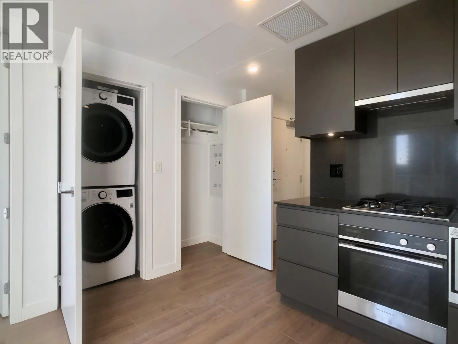 Fairly new concrete high rise in Brentwood of Burnaby North, just a block from Gilmore SkyTrain station. Most daily errands can be done by walking. Building is called Akimbo, and it is a modern design condo with concierge service, exercise room, party room, rooftop garden, parcel lockers, guest suites and a meeting room. This unit is on the 12th floor, South facing with lots of natural light. Wood flooring throughout, integrated appliances, fan coil unit for heating and cooling. Rent does not include electricity, telecommunications and move in. Comes with a parking stall and a locker. Video available upon request. Minimum one year. (id:27476)