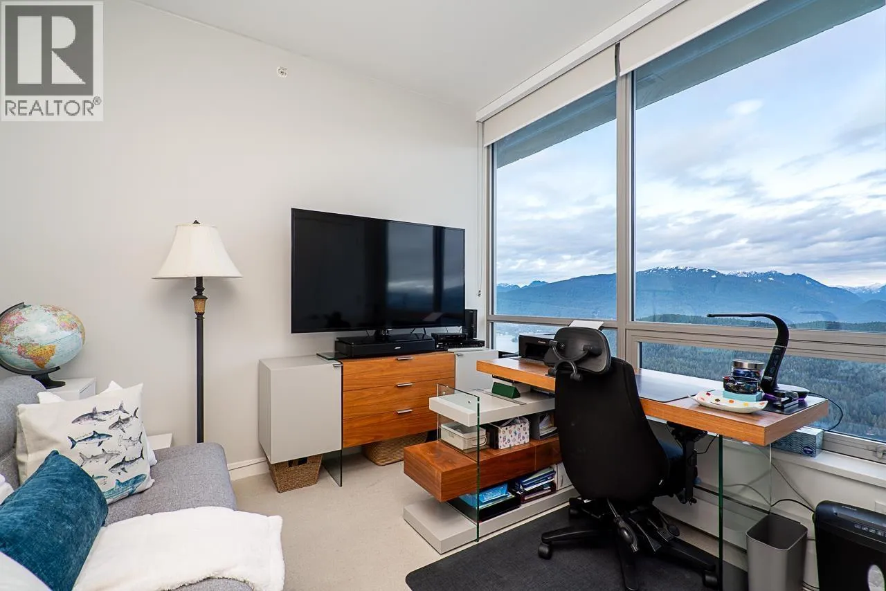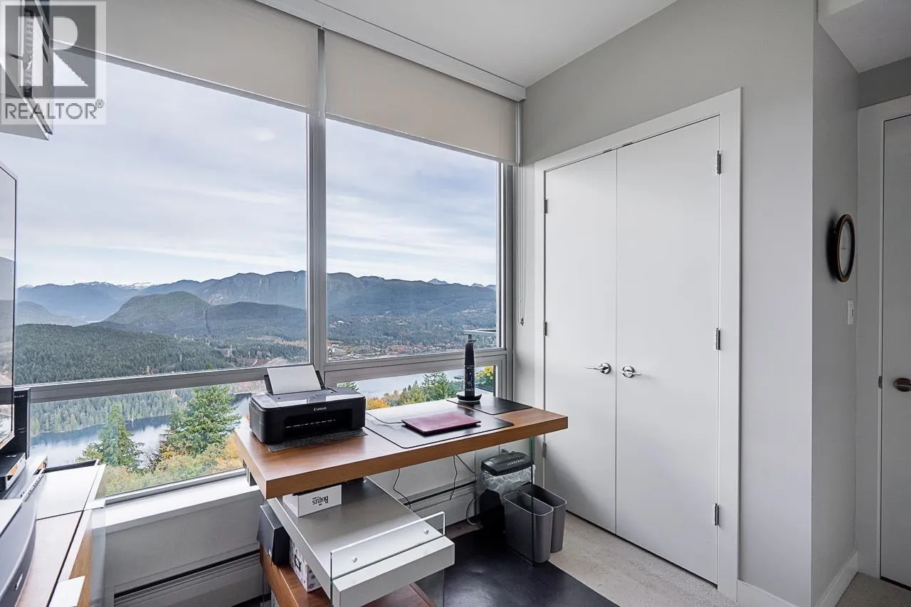 Executive-style 2 bedroom + den, 2 bathroom home at Altitude, SFU. This upper-level residence offers unobstructed 180 degree panoramic views of the Burrard Inlet, North Shore Mountains, and city skyline from every room. The open-concept layout features floor to ceiling windows that fill the home with natural light and showcase stunning scenery from sunrise to sunset. Step out onto your private balcony to enjoy peaceful mornings or evening sunsets. Located steps to the SFU campus, schools, shops, cafes, and transit, this home blends luxury, convenience, and an exceptional mountain setting. Strata payments include heat and gas for added comfort and value. Situated on SFU land, this established leasehold ownership offers access to extraordinary views and location at a more accessible price point than comparable freehold homes, within a well understood UniverCity community. (id:27476)