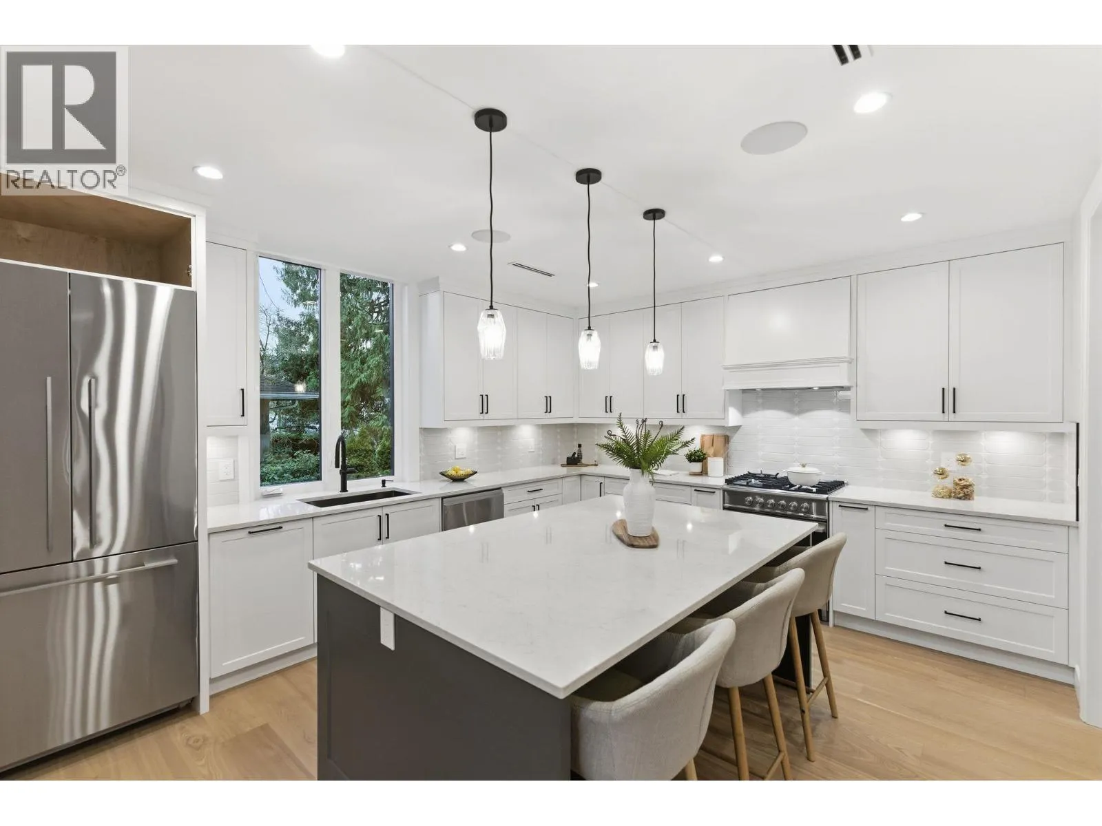 Soak in MOUNTAIN VIEWS from your private ROOFTOP DECK in this modern luxury brand new 1/2 duplex. Spanning over 3,675 SF, this 6-bedroom, 7-bath stunner has engineered hardwood floors, central A/C, built-in speakers and smart home tech throughout. Entertain in the open-concept living area and chef's kitchen equipped with FISHER & PAYKEL European appliances, quartz countertops, and a full WOK KITCHEN. FOUR BEDROOMS upstairs each have own PRIVATE ENSUITE, while the main level includes a full bedroom and bath - ideal for guests or flexible living. Additional highlights include a 1 BEDROOM LEGAL SUITE , potential to convert to 2 BEDROOM SUITE, an ATTACHED GARAGE and a WALKABLE location directly across from green space and steps to schools, parks, shopping, and transit.No open House Feb 14&15 (id:27476)