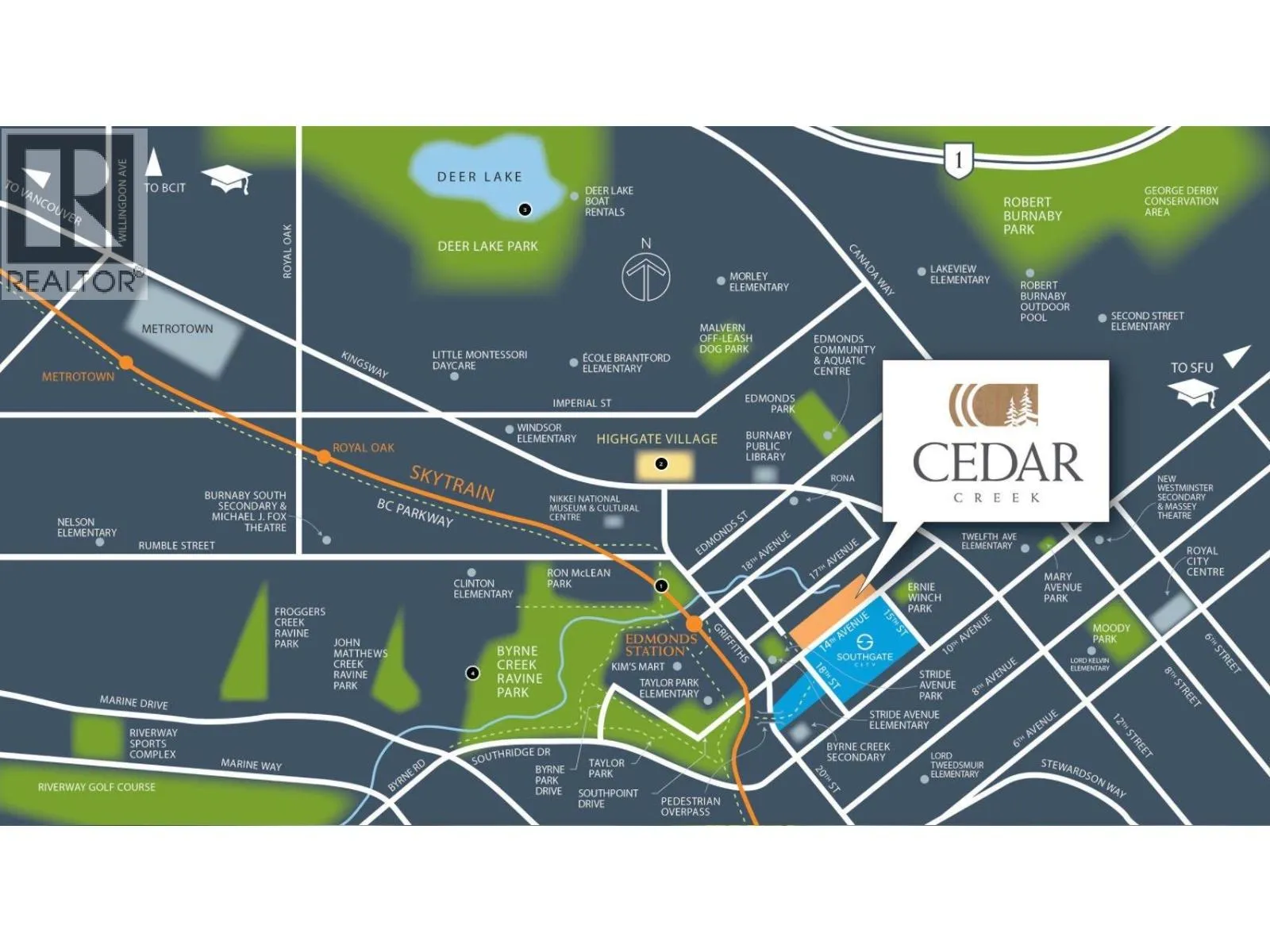 Bright and spacious 2 bed 2 bath home at Cedar Creek, a master planned community by Ledingham McAllister. Functional layout with 9 ft ceilings, no wasted space, large bedrooms and a primary suite with walk in closet and ensuite. Lots of natural light and an spacious private balcony. Modern L shaped kitchen with island, stainless steel appliances, stone countertops and plenty of cabinet space. Well managed building with great amenities including gym, guest suite, EV parking and bike room. Comes with 1 parking and 1 storage locker. Rental and pet friendly, close to Edmonds SkyTrain, Highgate Village, schools, parks and shopping. Open house Feb 07 & Feb 08 (2 - 4 pm) (id:27476)