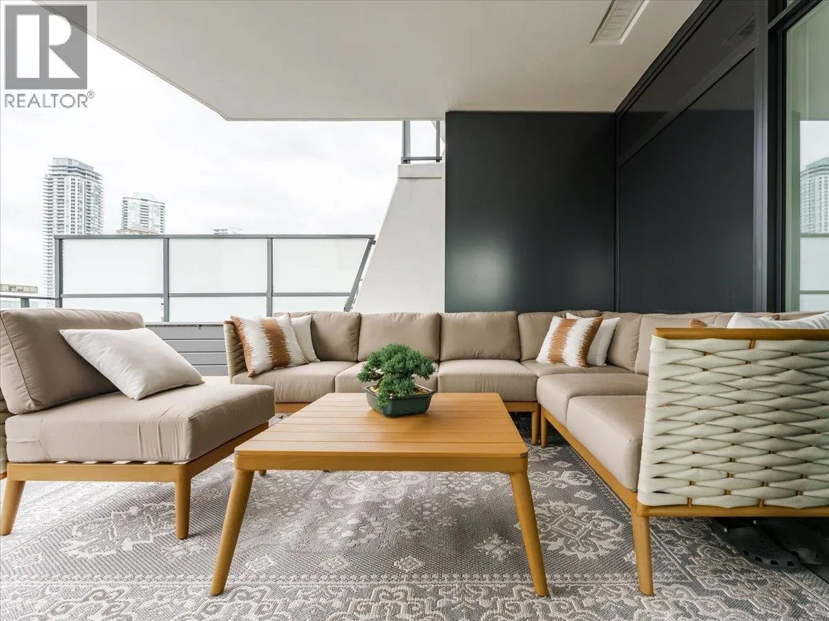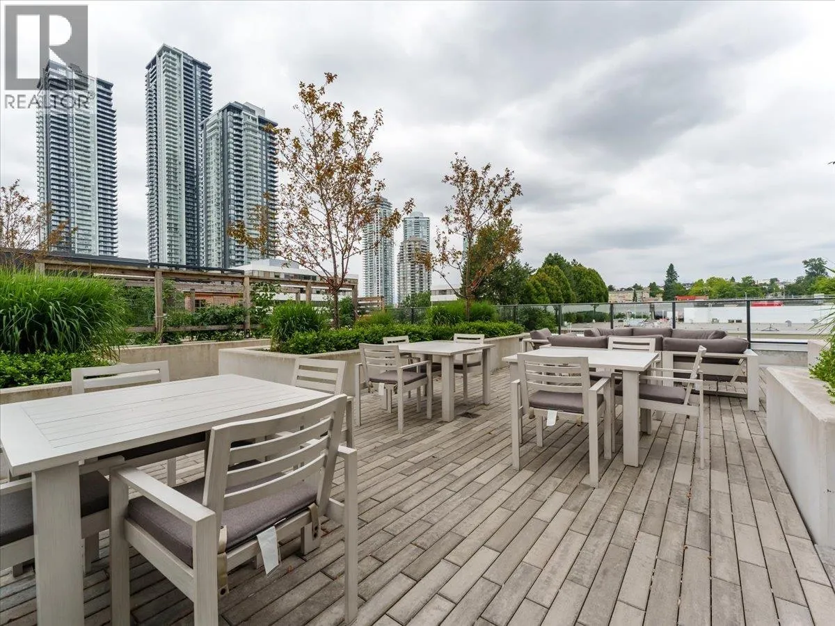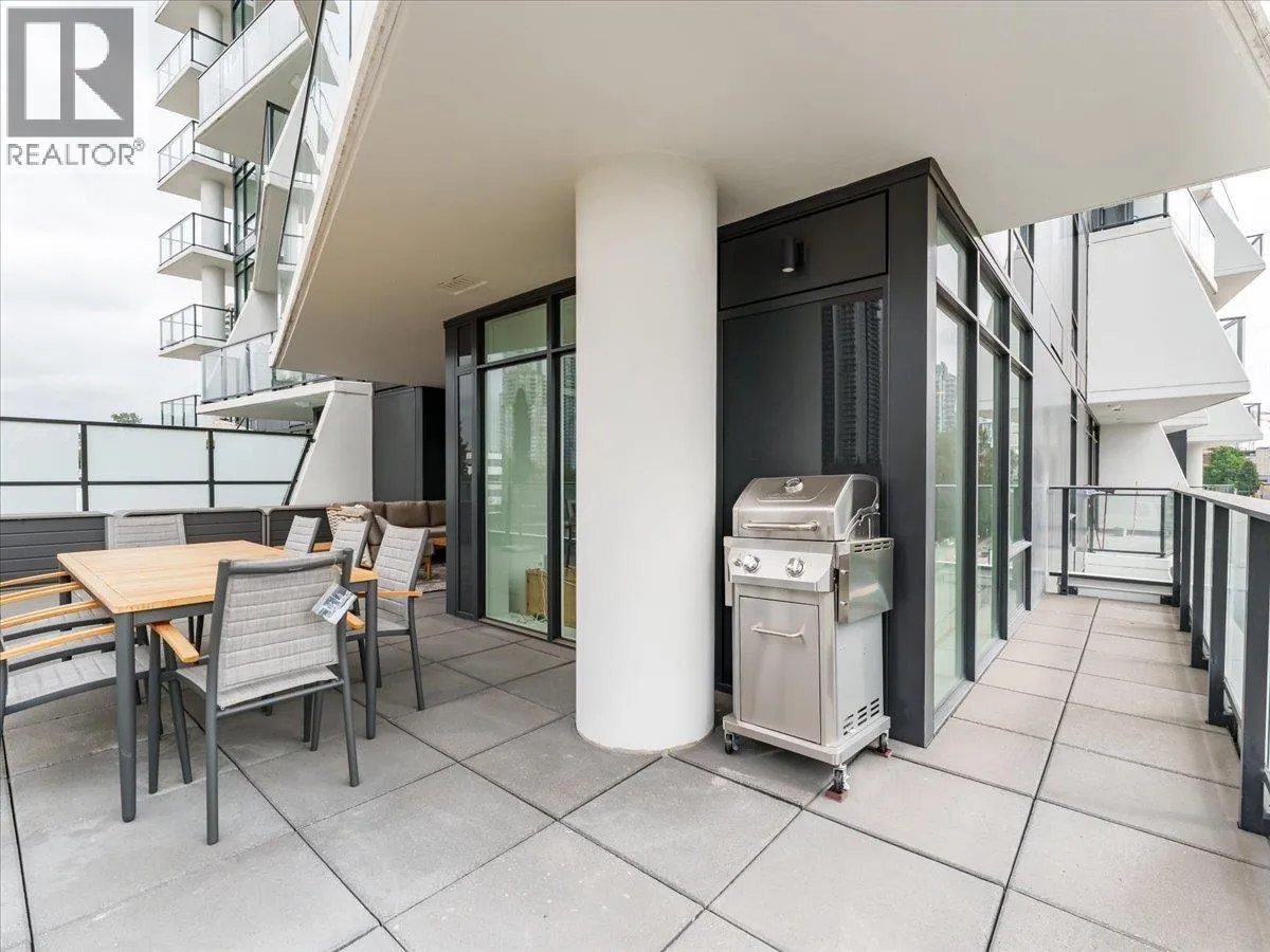 Welcome to this rare patio home at Akimbo in Brentwood. This 2 bed, 2 bath corner unit offers a highly efficient layout with no shared bedroom walls, 9´ ceilings, floor-to-ceiling windows, and air conditioning throughout. The highlight is the massive 603 sq. ft. west-facing wraparound patio overlooking quiet green space-ideal for entertaining, relaxing, or enjoying sunset views. The sleek kitchen features quartz countertops, a gas cooktop, and integrated appliances. Both bedrooms are well-separated and generously sized. Includes 1 parking and 1 locker. Akimbo is a bold architectural statement in the heart of Brentwood and offers premium amenities including 24/7 concierge, fitness centre, party lounge, guest suite, garden, and rooftop BBQ area. Steps to Gilmore SkyTrain, Brentwood Mall, Whole Foods, parks, and restaurants. Pet and rental friendly. Still under new home warranty. OPEN HOUSE SUN FEB 15th 3:00-4:30 (id:27476)