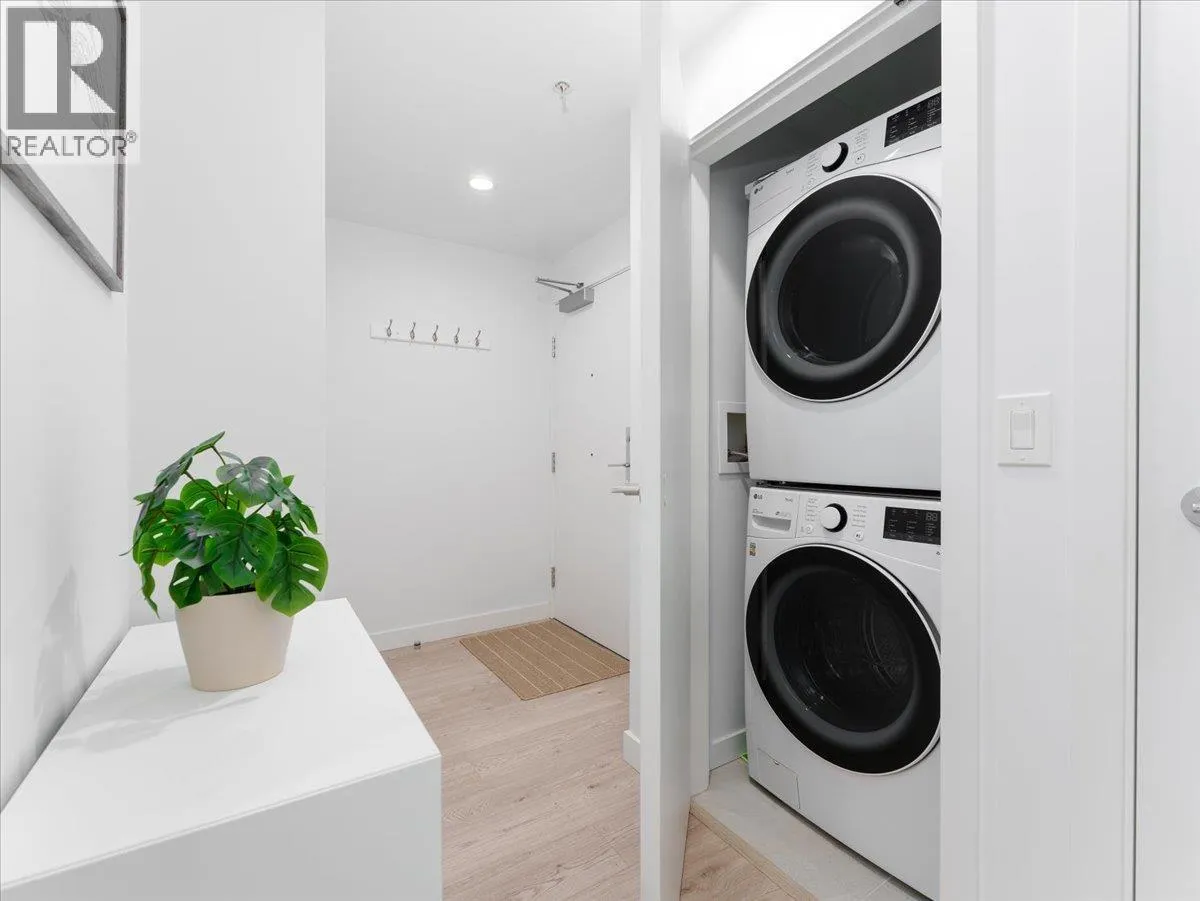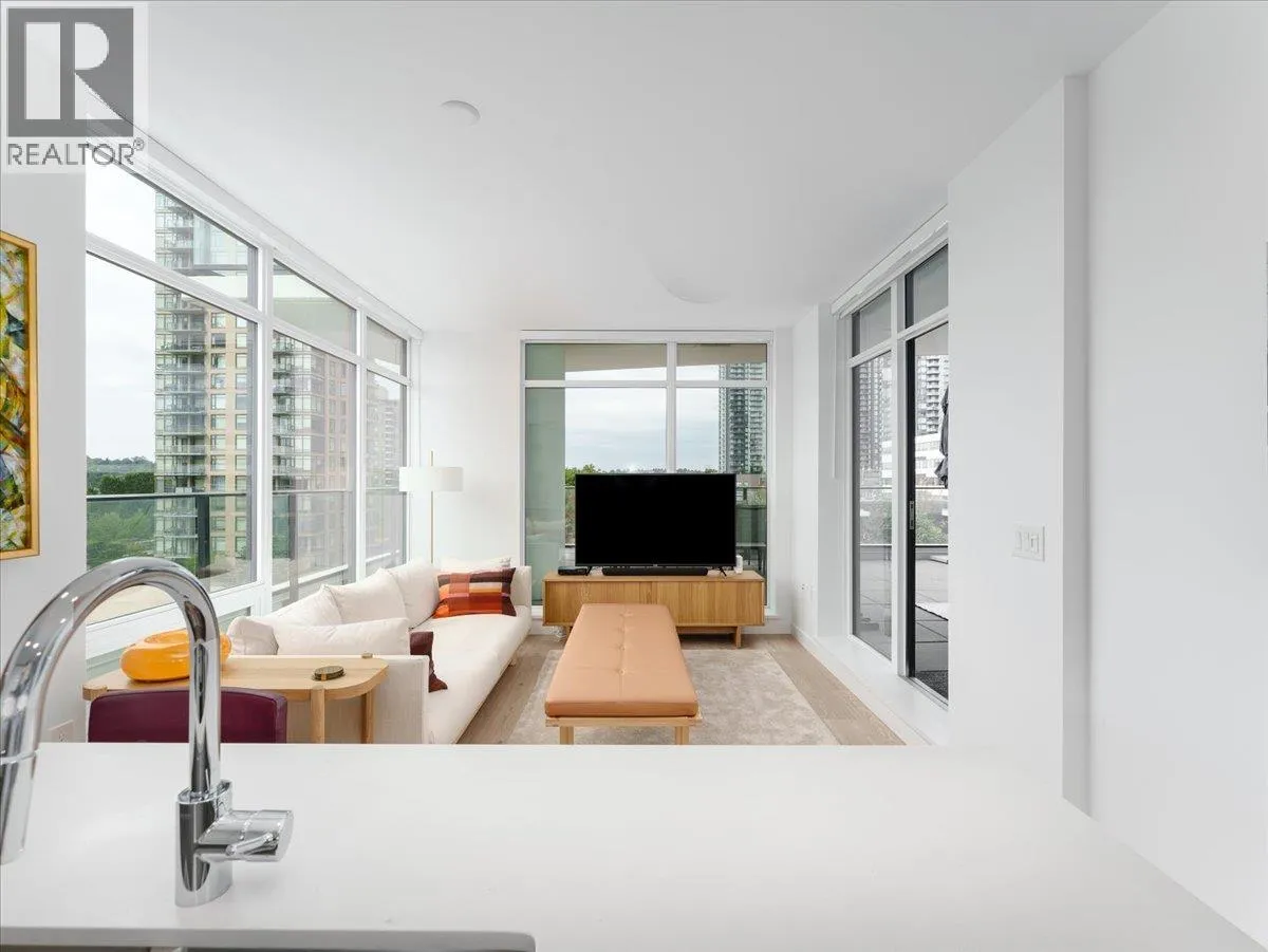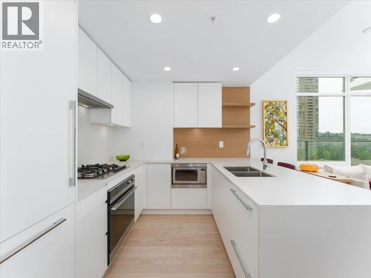 Welcome to this rare patio home at Akimbo in Brentwood. This 2 bed, 2 bath corner unit offers a highly efficient layout with no shared bedroom walls, 9´ ceilings, floor-to-ceiling windows, and air conditioning throughout. The highlight is the massive 603 sq. ft. west-facing wraparound patio overlooking quiet green space-ideal for entertaining, relaxing, or enjoying sunset views. The sleek kitchen features quartz countertops, a gas cooktop, and integrated appliances. Both bedrooms are well-separated and generously sized. Includes 1 parking and 1 locker. Akimbo is a bold architectural statement in the heart of Brentwood and offers premium amenities including 24/7 concierge, fitness centre, party lounge, guest suite, garden, and rooftop BBQ area. Steps to Gilmore SkyTrain, Brentwood Mall, Whole Foods, parks, and restaurants. Pet and rental friendly. Still under new home warranty. OPEN HOUSE SUN FEB 15th 3:00-4:30 (id:27476)
