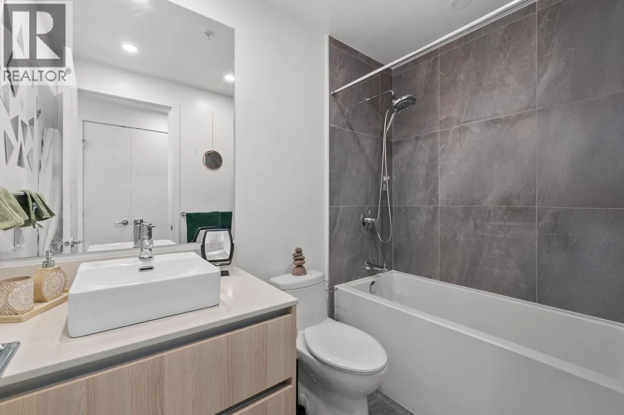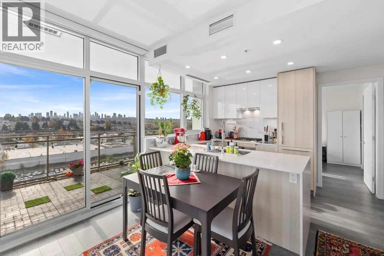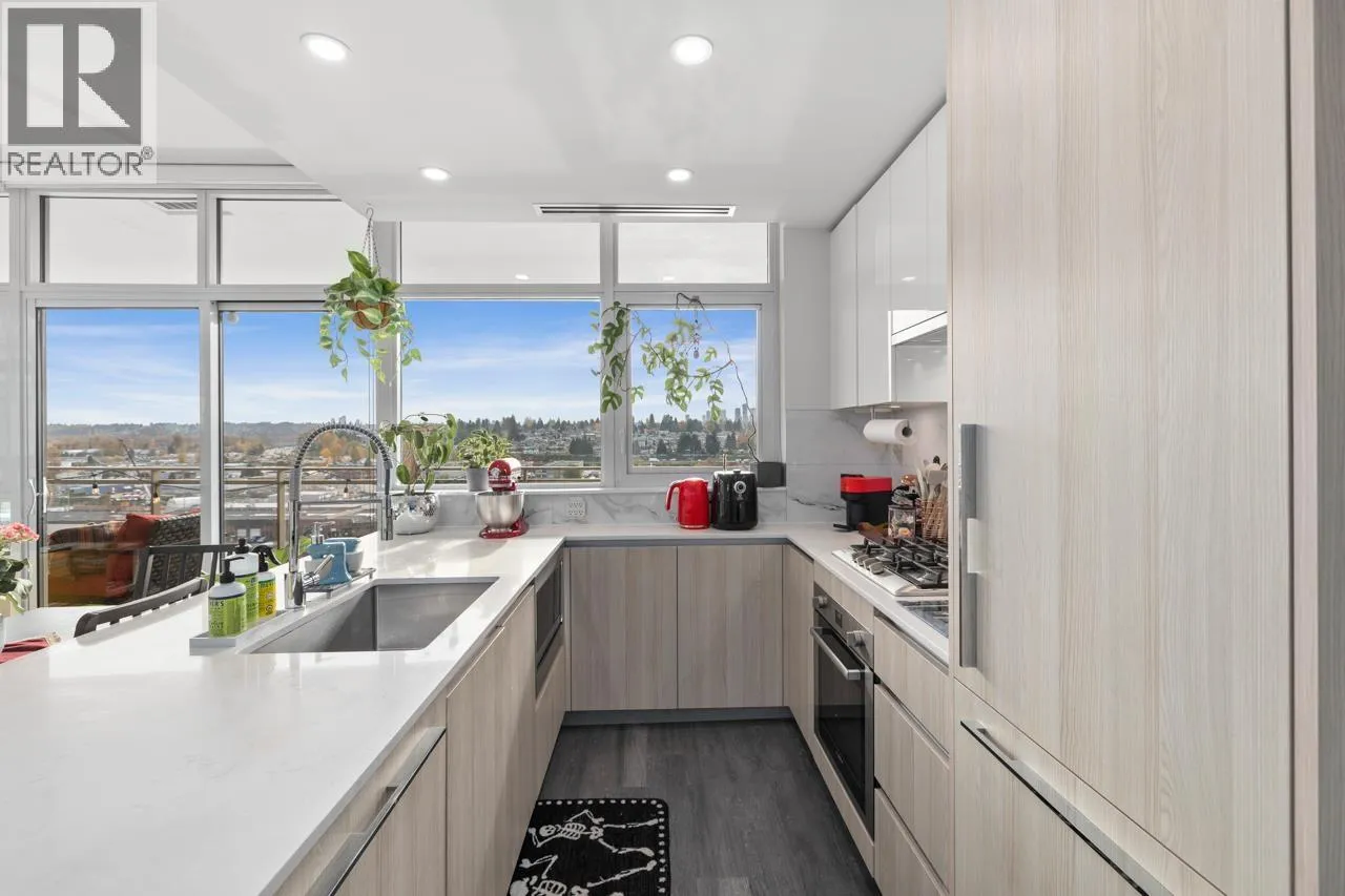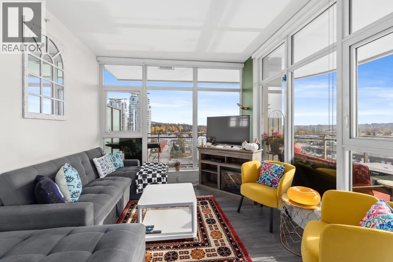 Welcome to Etoile, where modern elegance meets effortless Brentwood living. This rare 2 bed+ den, 2 bath corner home invites you to live both indoors and out, featuring 879 sqft of refined interior space and an extraordinary 377 sqft wrap-around balcony. Soaring ceilings and wall-to-wall windows frame sweeping city and mountain views, while a sleek kitchen with Bosch appliances and a waterfall island anchors the home. The den offers the perfect work-from-home retreat. Unwind in spa-inspired bathrooms or entertain under the stars on your heated terrace. Resort-style amenities include a fitness centre, steam rooms, outdoor pool, hot tub, and concierge. Steps to SkyTrain, Brentwood, parks, cafes, restaurants, and Whole Foods. Urban living, elevated. Open House- Saturday, Feb 7th, 1-3 PM (id:27476)