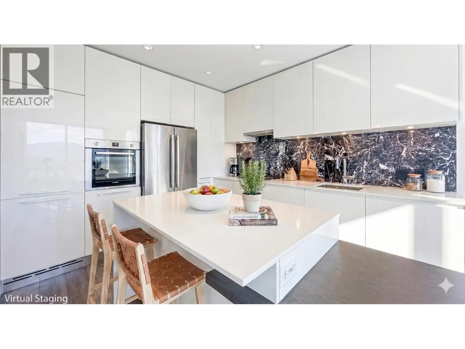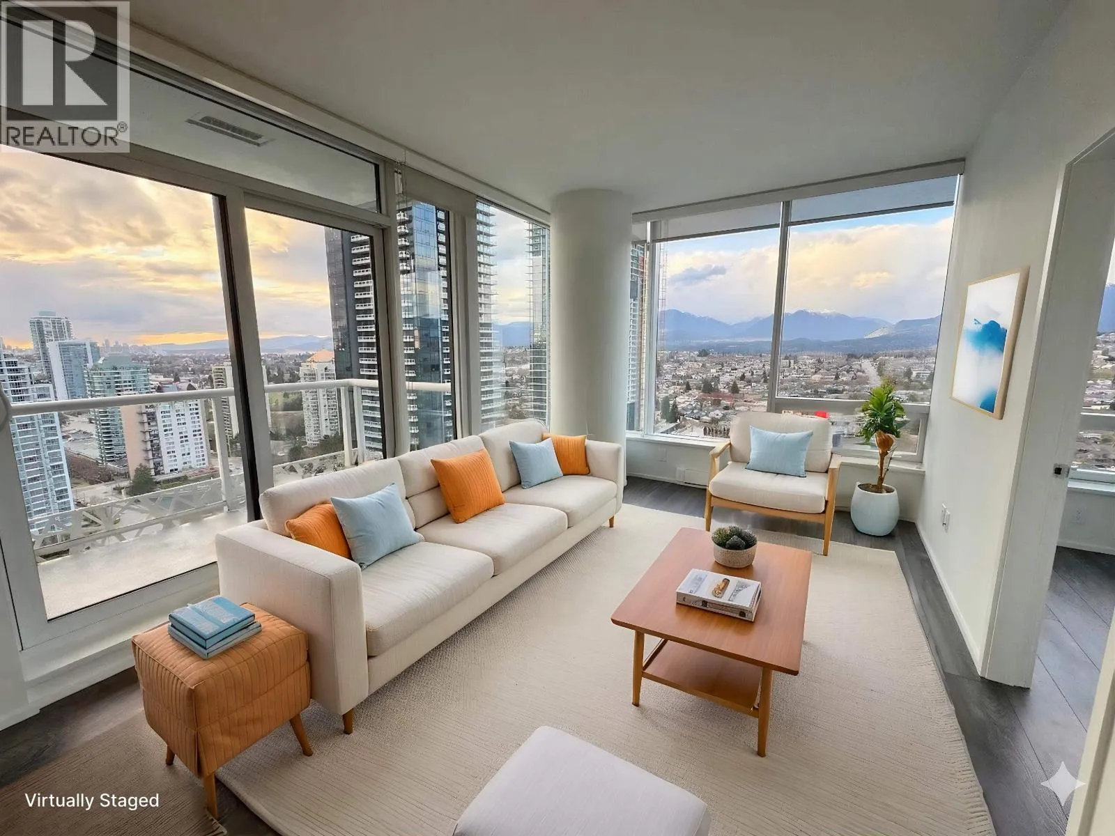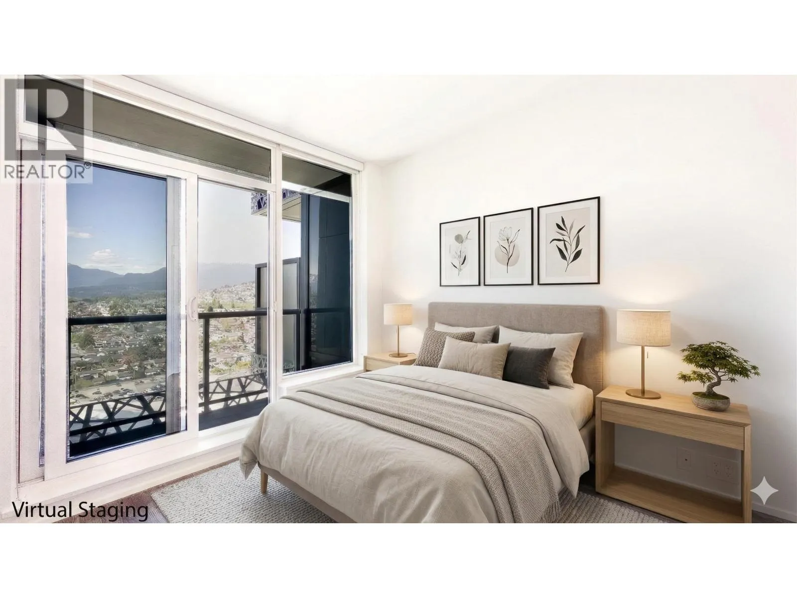 Welcome to Amazing Brentwood Tower II by Shape Properties. This stunning southwest corner 2-bedroom, 2-bathroom plus den home (den with sliding glass doors) with Fresh Paint offers breathtaking 270-degree panoramic views of Metrotown, city skyline, mountains, and glimpses of Burrard Inlet. Enjoy expansive floor-to-ceiling windows, a gourmet kitchen with quartz countertops, marble backsplash, Bosch stainless steel appliances, European cabinetry, laminate flooring throughout, and a built-in dining table. Five star amenities include 24-hour concierge, fitness centre, and guest suite. Steps to Brentwood Mall, Skytrain, restaurants. The strata is currently working on AC installation project. Virtual Staging shows potential. Measurements are approximate, Buyer or Buyers agent to verify. (id:27476)