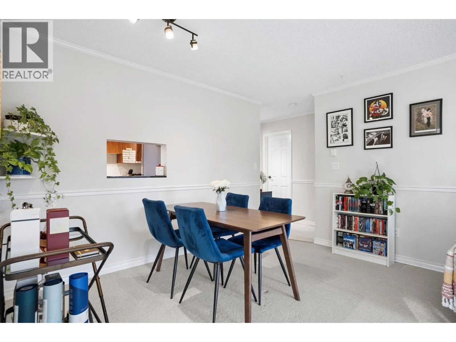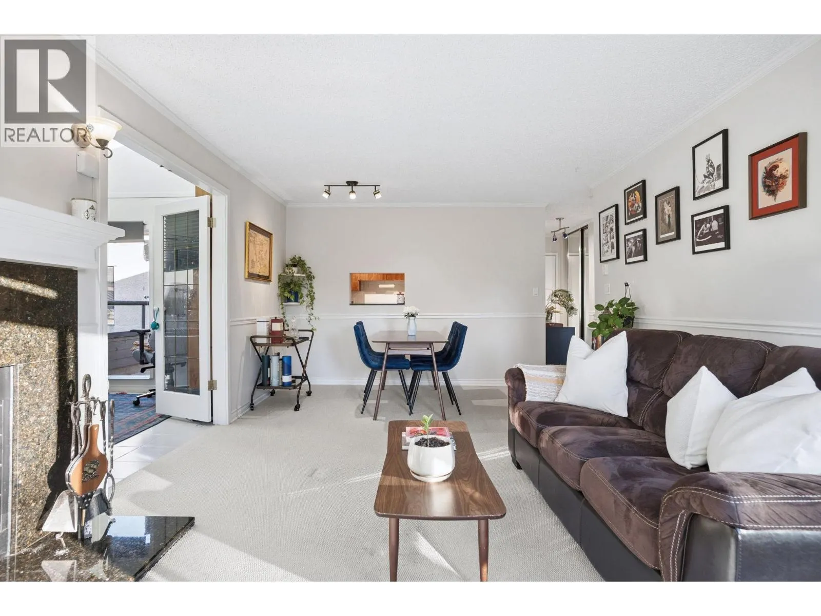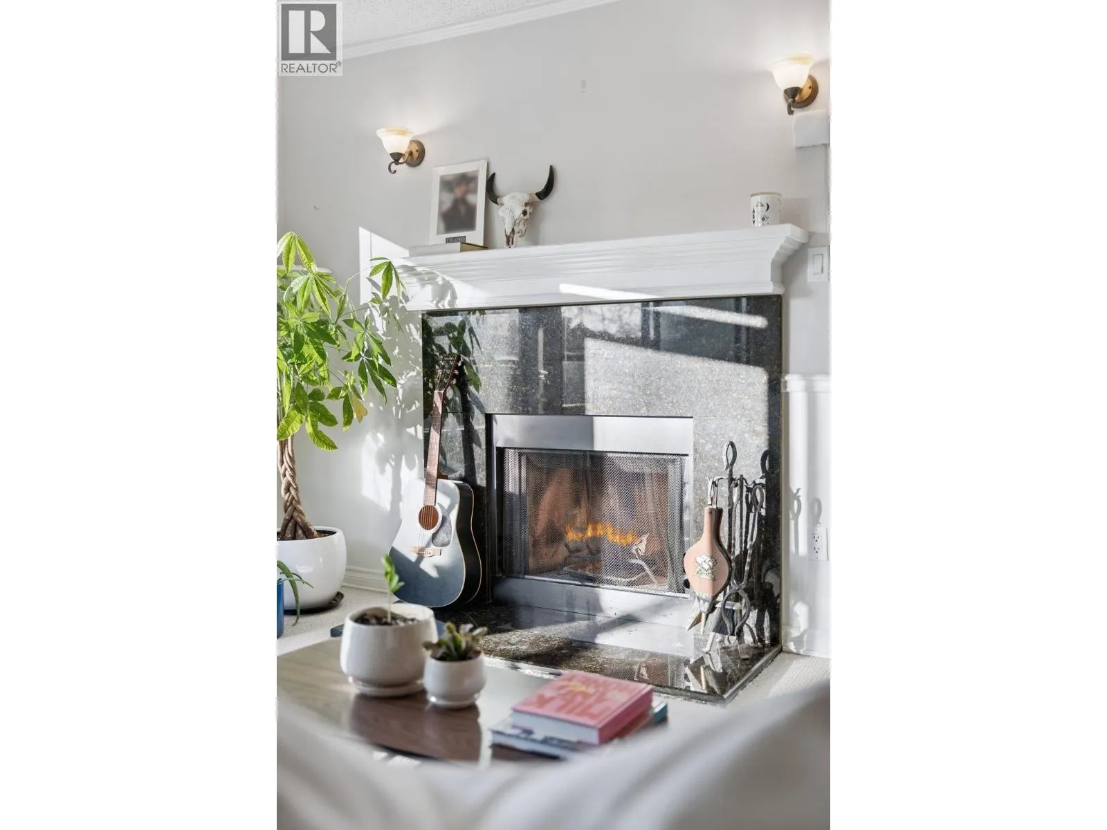 Welcome to August Grove Estates! This bright & airy TOP FLOOR corner 1 bed + den + 1 bath 725 sqft home offers desirable southwest exposure & an abundance of natural light throughout. Featuring TWO private balconies, this home is perfect for entertaining guests & enjoying the quiet treed outlook. The spacious layout features a large, bright den w vaulted ceilings - truly ideal for WFH, baby room or guest space. A cozy wood-burning fireplace adds warmth & character, while in-suite laundry, pantry & ample closet space provides everyday convenience. Enjoy the added benefits of a secure underground parking stall & storage locker. Ideally located within walking distance to Squint Lake Park and Burnaby Mountain Golf Course, with scenic trails and recreation right at your doorstep. Pets welcome! (id:27476)