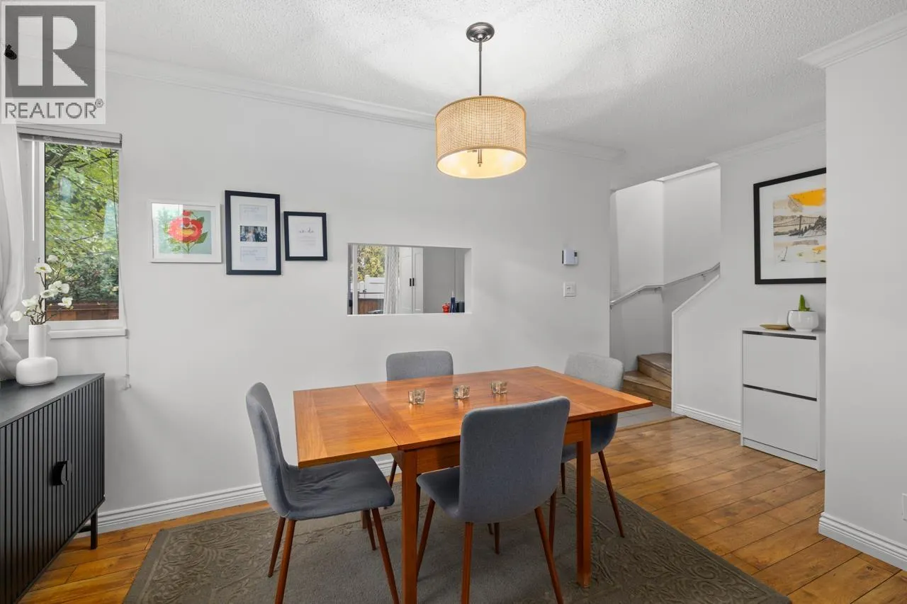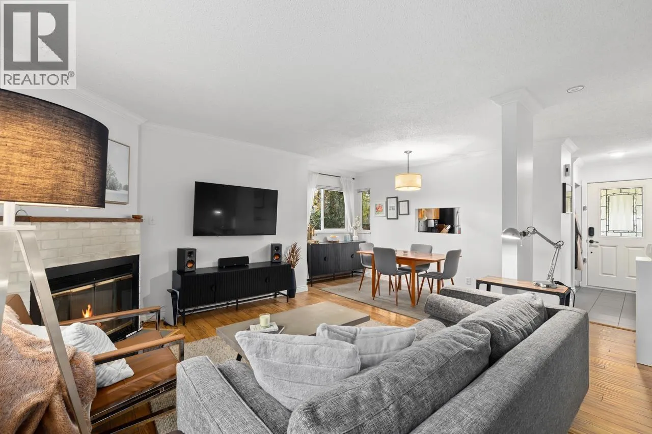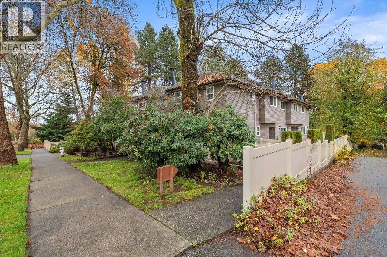 Charming 2 bdrm & den end-unit townhouse in a boutique 7-home complex, centrally located yet tucked into a peaceful, forest-like setting on a quiet street. Spacious living/dining area, cozy wood-burning f/p, & convenient 2 piece bath on main. Updated kitchen leading to a large, S-facing, fully enclosed patio, perfect for entertaining. Bright & private 2 level home feels like a house w/no neighbours above or below, windows on 3 sides, & access to a huge shared lawn - ideal place for kids to play. 2 generous bdrms, den, & full bath up. Abundant storage options w/exterior-access crawlspace, mountain & city views, low strata fees, free street parking, storage locker, & 2 parking. Pet friendly. Walkable to Gilmore SkyTrain Station, Brentwood, + restaurants up the block. A lovely family home. (id:27476)