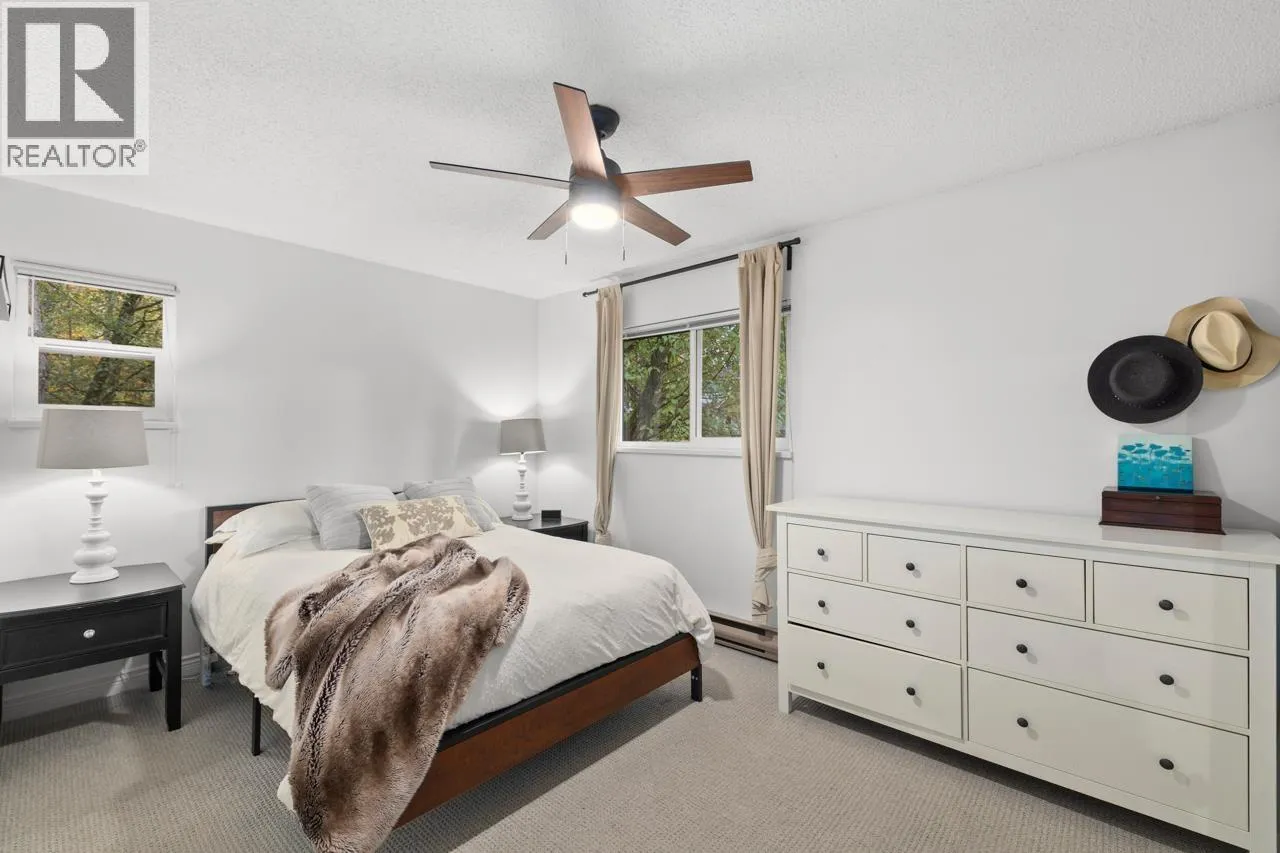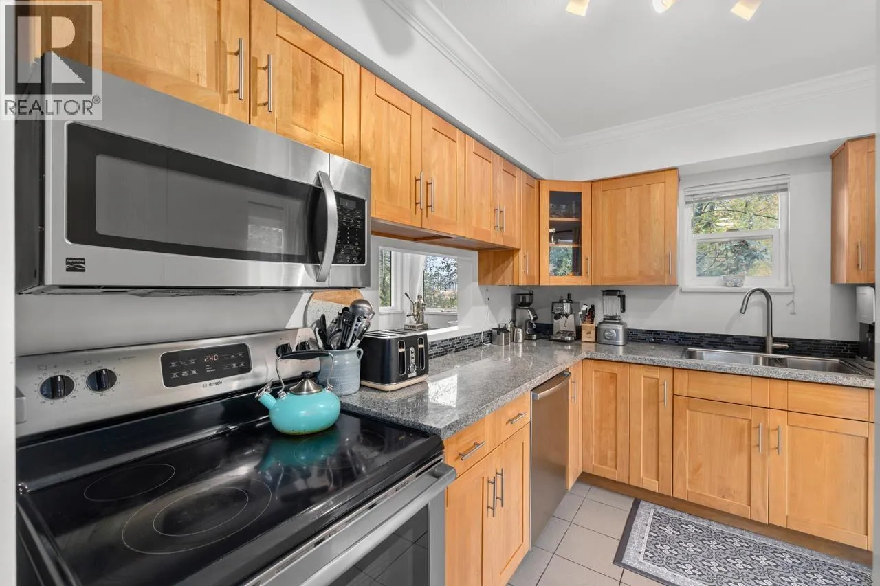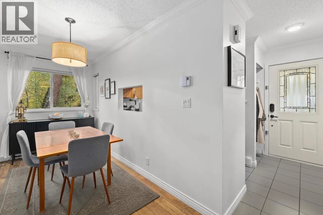Charming 2 bdrm & den end-unit townhouse in a boutique 7-home complex, centrally located yet tucked into a peaceful, forest-like setting on a quiet street. Spacious living/dining area, cozy wood-burning f/p, & convenient 2 piece bath on main. Updated kitchen leading to a large, S-facing, fully enclosed patio, perfect for entertaining. Bright & private 2 level home feels like a house w/no neighbours above or below, windows on 3 sides, & access to a huge shared lawn - ideal place for kids to play. 2 generous bdrms, den, & full bath up. Abundant storage options w/exterior-access crawlspace, mountain & city views, low strata fees, free street parking, storage locker, & 2 parking. Pet friendly. Walkable to Gilmore SkyTrain Station, Brentwood, + restaurants up the block. A lovely family home. (id:27476)