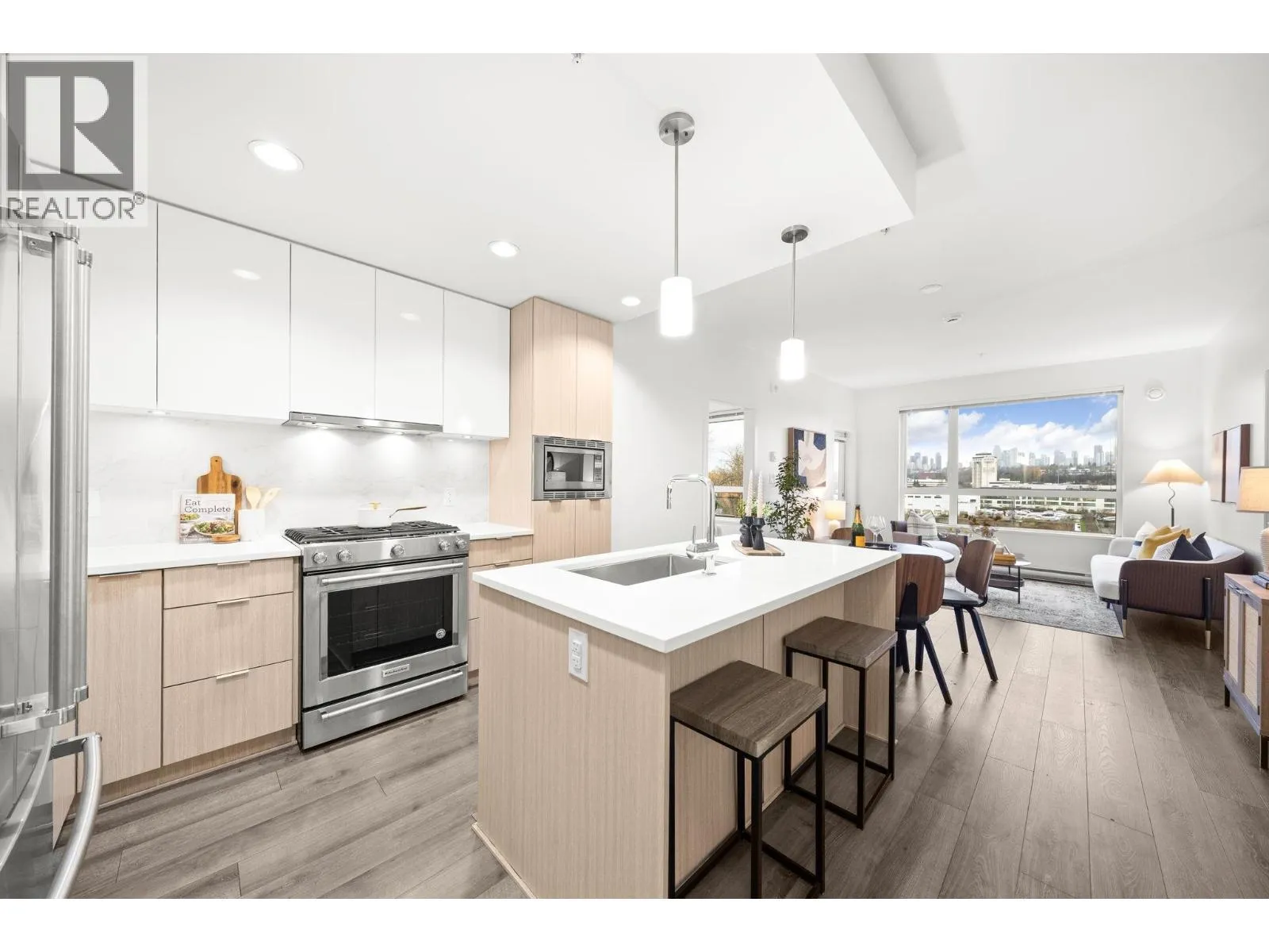 Beautiful south-facing upper residence at Madison & Dawson by Porte Communities perfectly positioned just steps from SkyTrain & The Amazing Brentwood in the electric core of Brentwood. This bright 2 Bed + large Den (easily a 3rd bedroom or office) + 2 Bath home offers 880 square ft of spacious living & a private balcony with city views. Entertain with confidence in the chef-inspired kitchen featuring an oversized island, KitchenAid Energy Star appliances, quartz countertops, & sleek soft-close cabinetry. The spacious open-concept living & dining area is enhanced by 9 ft ceilings & durable laminate flooring throughout, while bedrooms are separated for maximum privacy. Amenities include: gym, social lounge, garden terrace & guest suite. 1 parking stall & 1 storage locker. (id:27476)