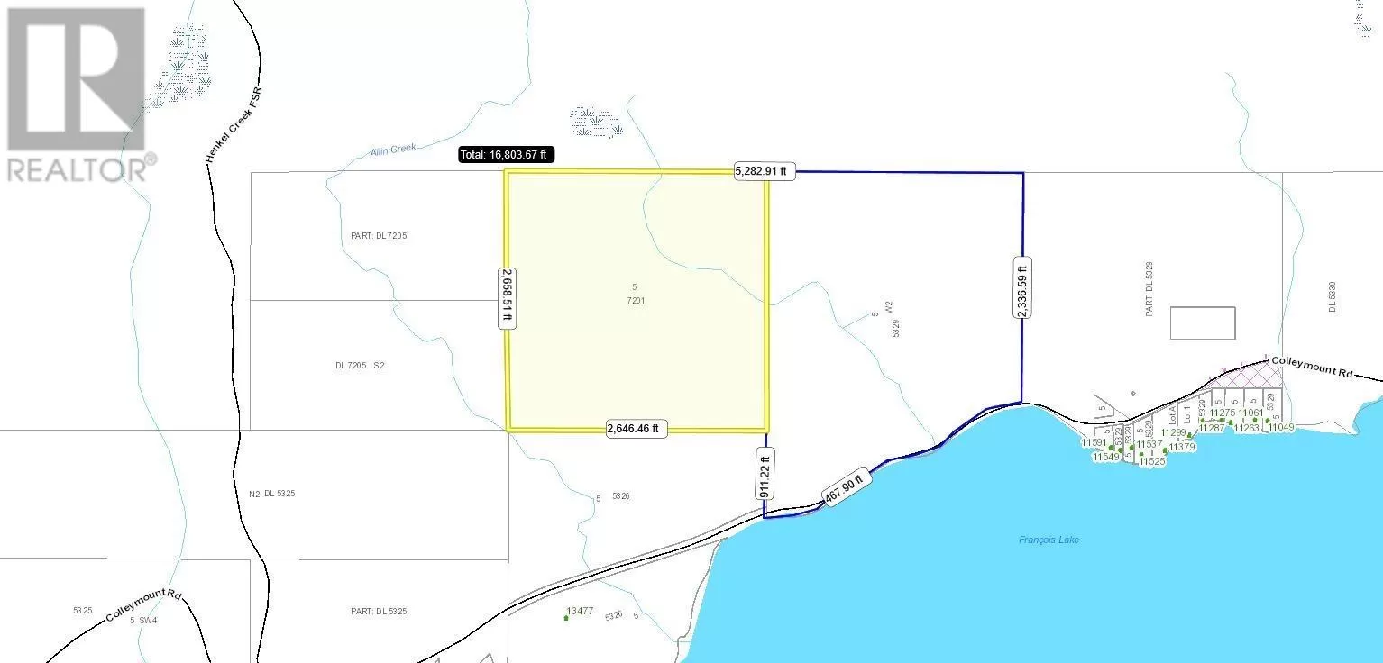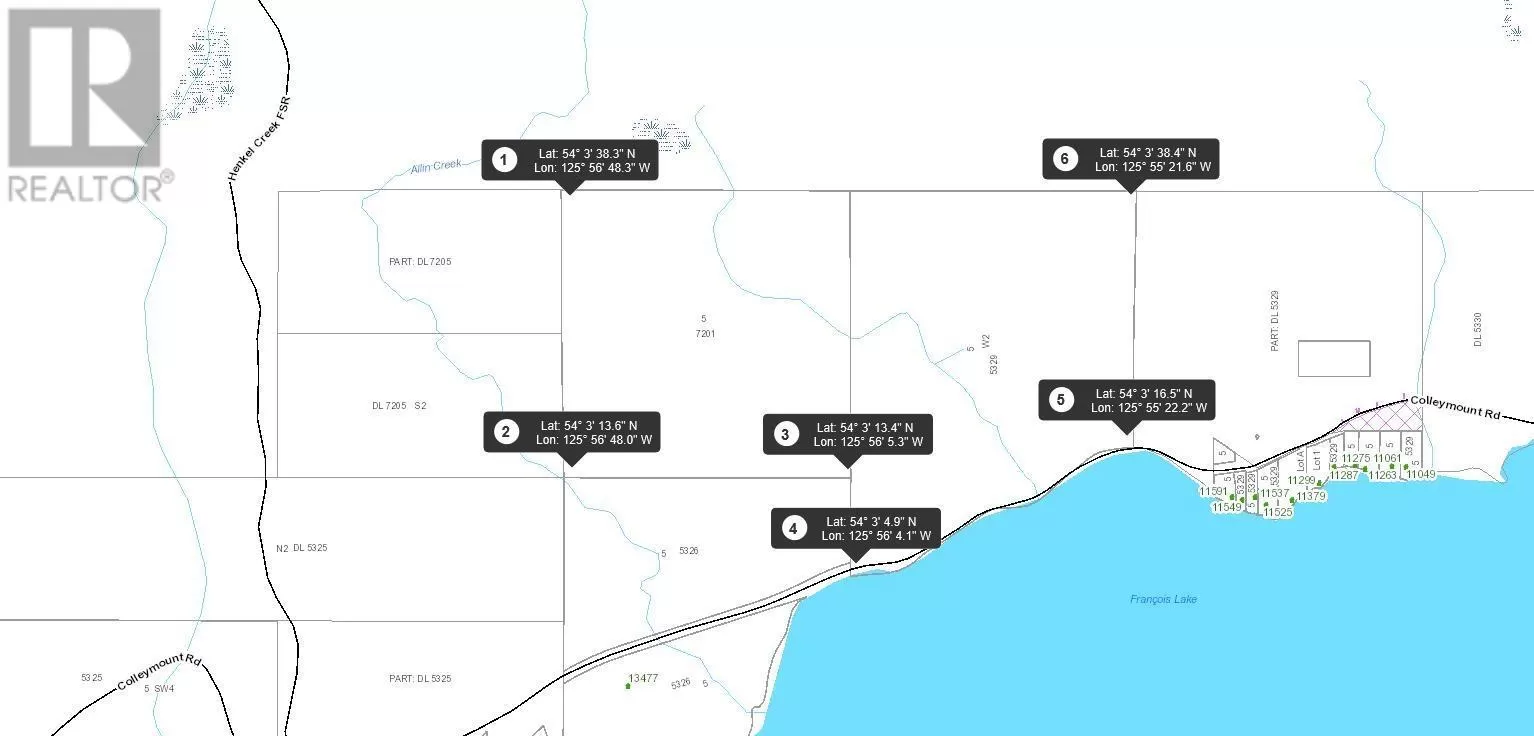 * PREC - Personal Real Estate Corporation. Unveiling an extraordinary opportunity, behold 341 acres nestled along the shores of Francois Lake, comprising of two parcels on its serene north side. Marvel at the breathtaking vistas from an enchanting building site atop the hill. With two titles and zoning accommodating single-family or dual dwellings, agriculture, retreat endeavors, or even a guest ranch, the possibilities are boundless. Delight in a plethora of recreational pursuits amidst this tranquil haven, making a remarkable chance for a lifestyle transformation. Embrace the serenity of your private oasis overlooking the picturesque lake, where dreams of a quiet existence become reality. Maps/Photos taken before selective logging. Land measurements are approximate, Buyer to verify if deemed important. (id:27476)