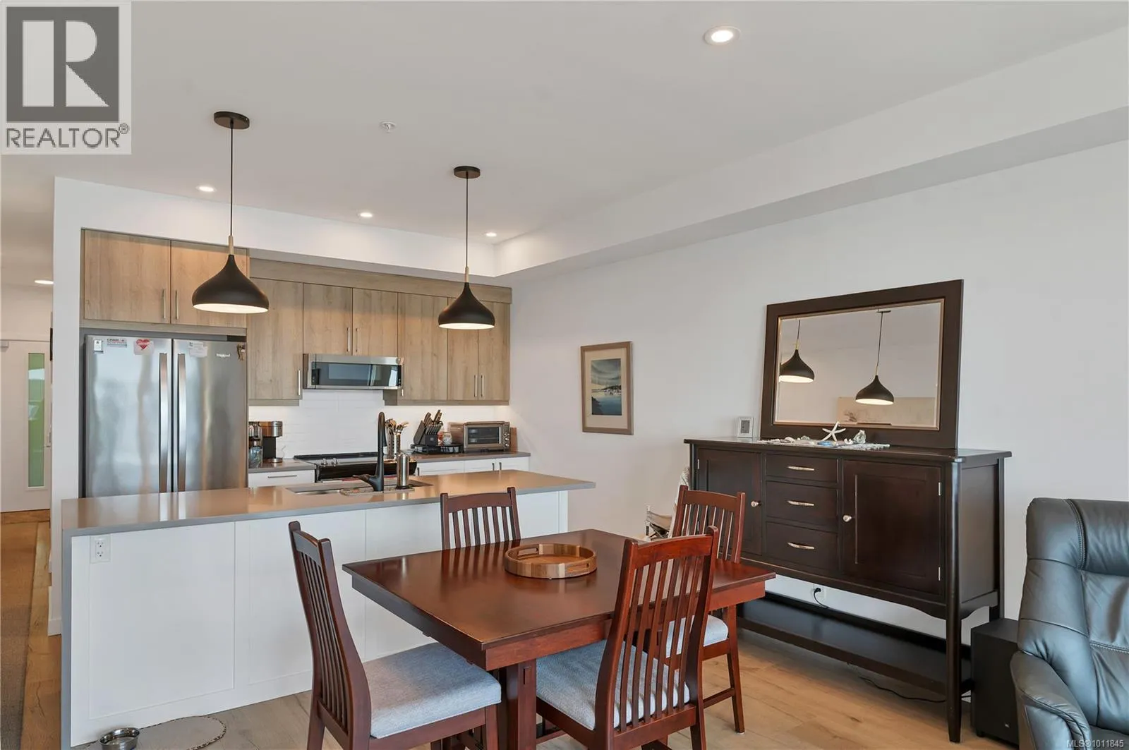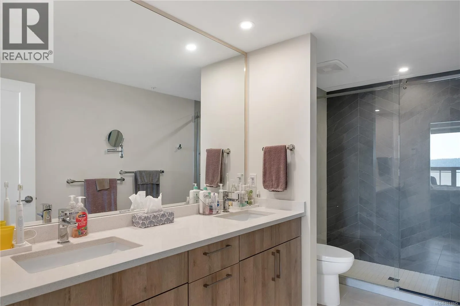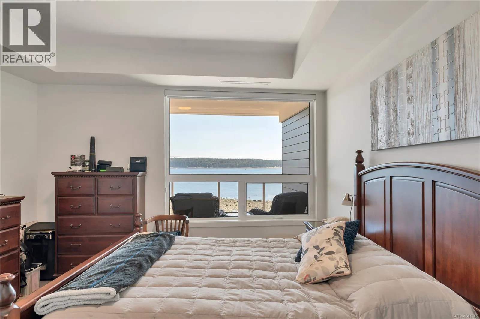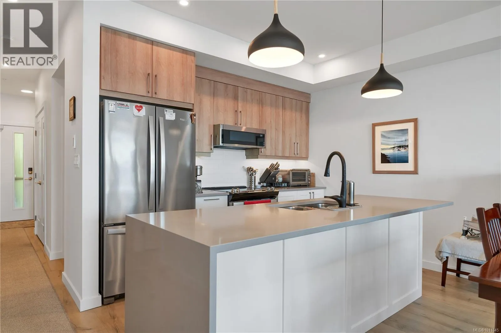 Built in 2023, this almost new 1,229 sqft condo offers modern living with breathtaking ocean views. Featuring 2 bedrooms plus a den, the open concept design includes laminate flooring, quartz countertops, and a sleek kitchen perfect for entertaining. The primary suite boasts a deluxe ensuite with double sinks, walk-in tiled shower, heated tile flooring, and a spacious walk-in closet. Enjoy year round comfort with air conditioning, electric blinds (with blackout in bedrooms), and a private deck for relaxing. Additional highlights include an exclusive EV charger, sprinkler system, and home warranty coverage. Pets are permitted (with size restrictions), all ages welcome, and best of allâno GST. This is an outstanding opportunity to own a stylish, ocean view, move-in-ready home with every modern convenience. (id:27476)