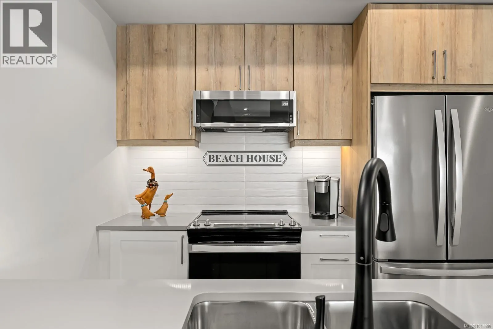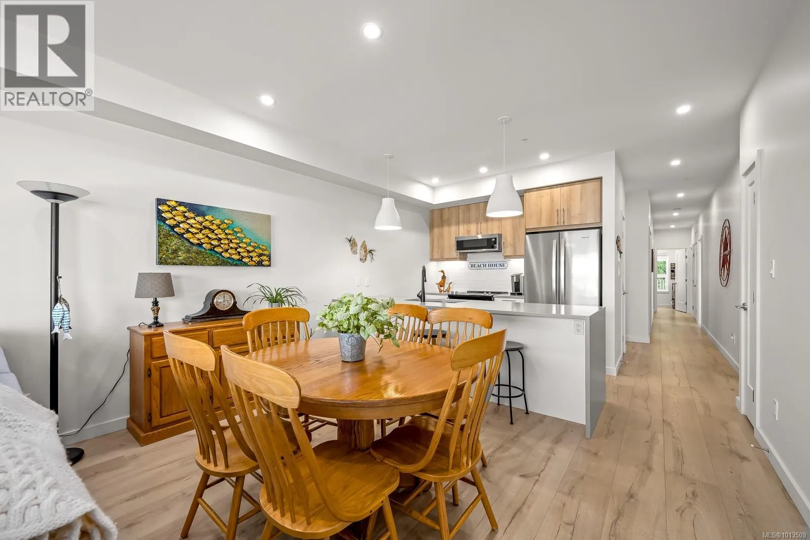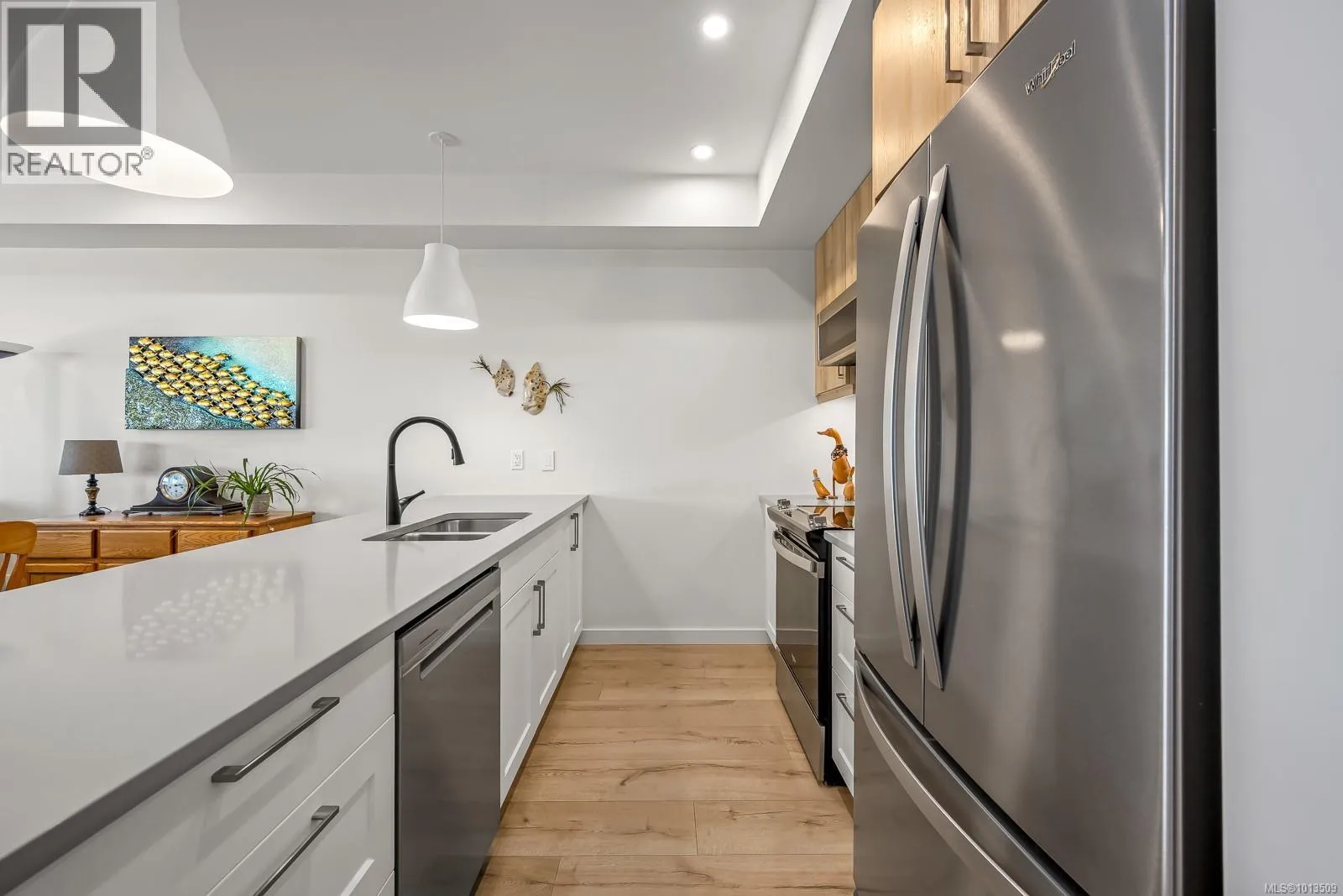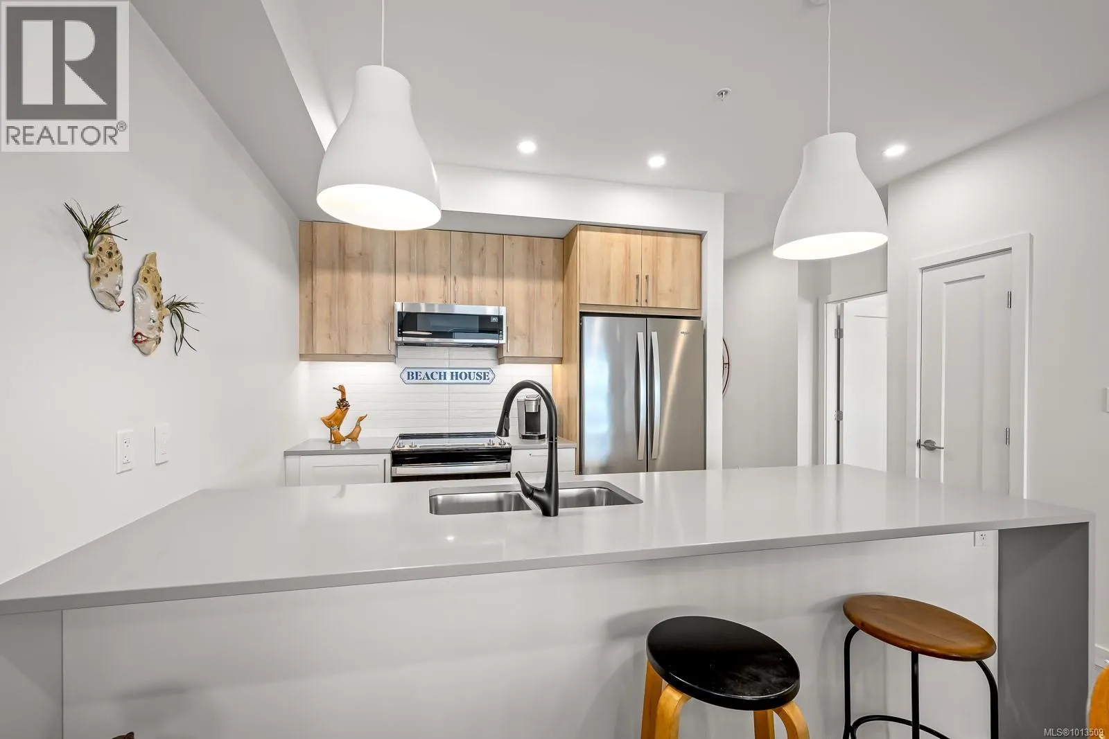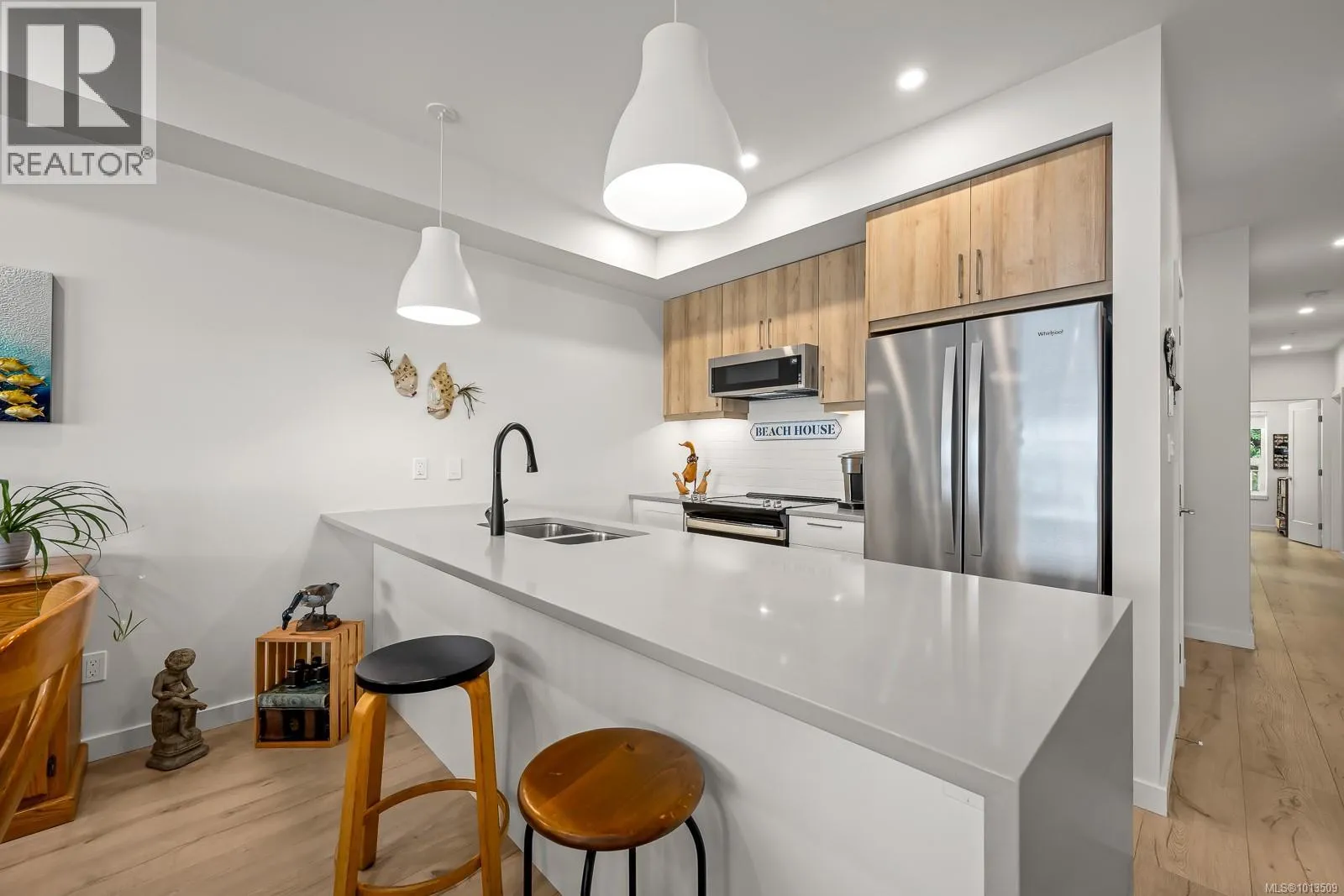 Ocean view Condo-two parking spots. Built in 2023, this property looks brand new inside and out. Exceptional features include three bedrooms plus den, open concept end unit with ocean views on two sides facing west, enjoy the boats and wildlife passing by with Quadra Island in the background. Neutral paint tones, designer kitchen with quartz countertops, two full bathrooms, and high end appliances. The owners have enjoyed the heat pump with air conditioning, and, walking distance to marina, cafes and shopping, yet parklike quiet setting in the backyard. A perfect investment, as most condominiums do not have 2 secured entry parking spots designated and 3 bedrooms plus a den. Open air hallways with parklike setting at the back. Ocean views all day long with sunsets in the evening, lock up and go lifestyle. (id:27476)