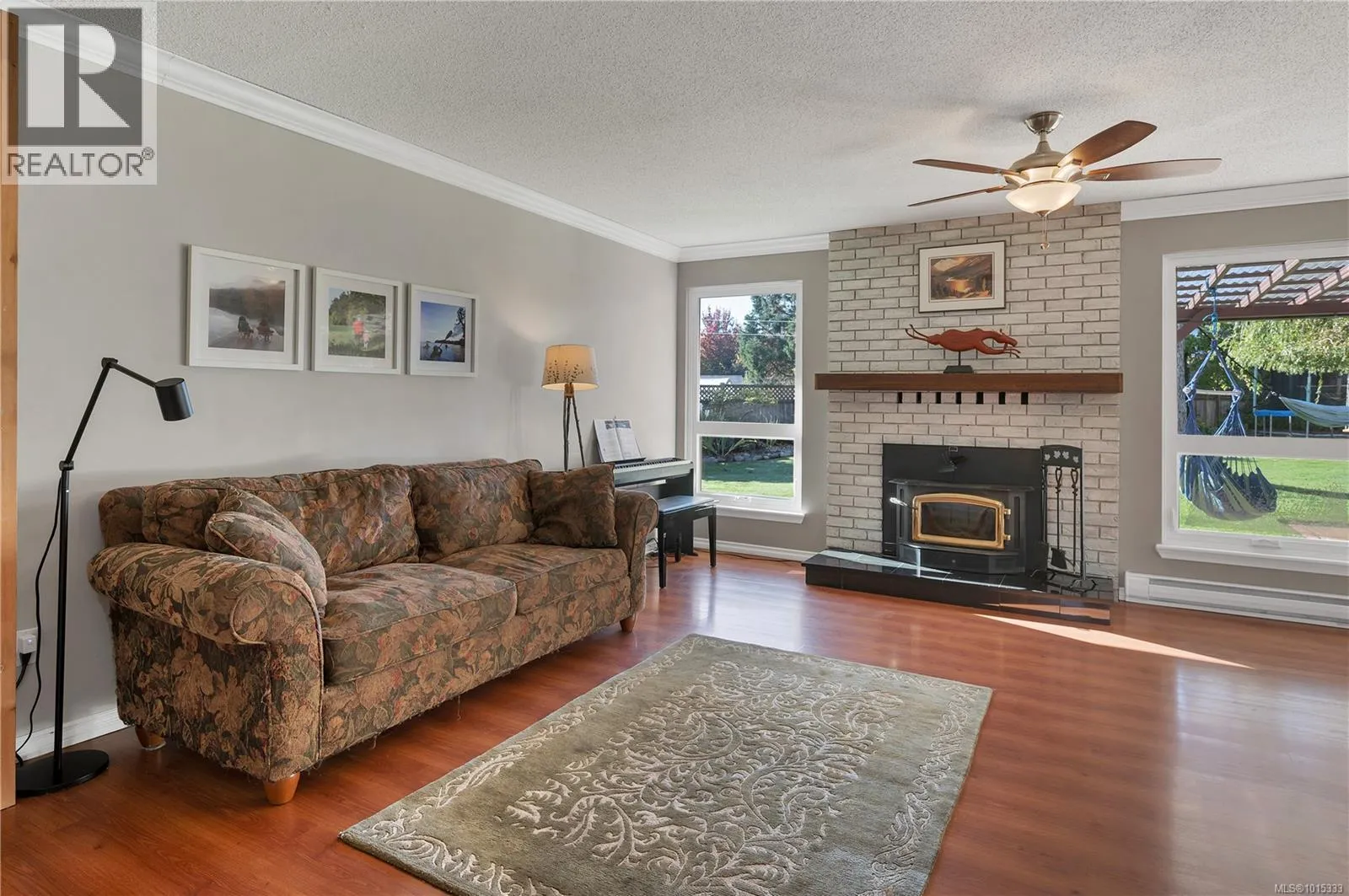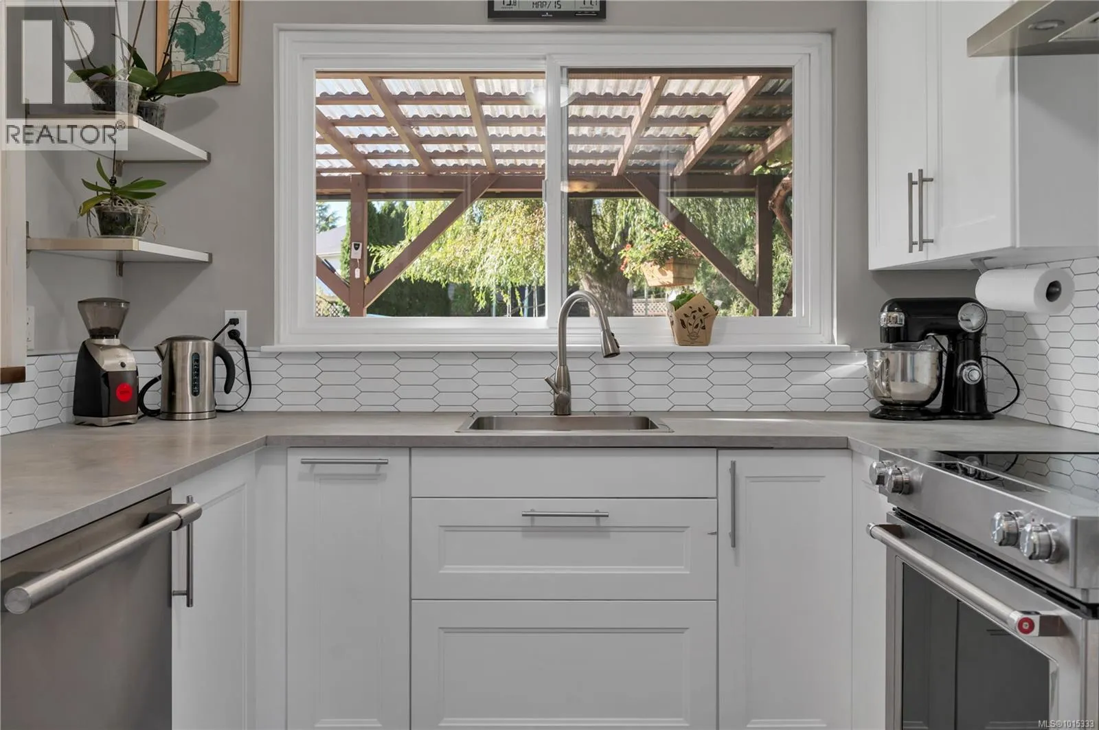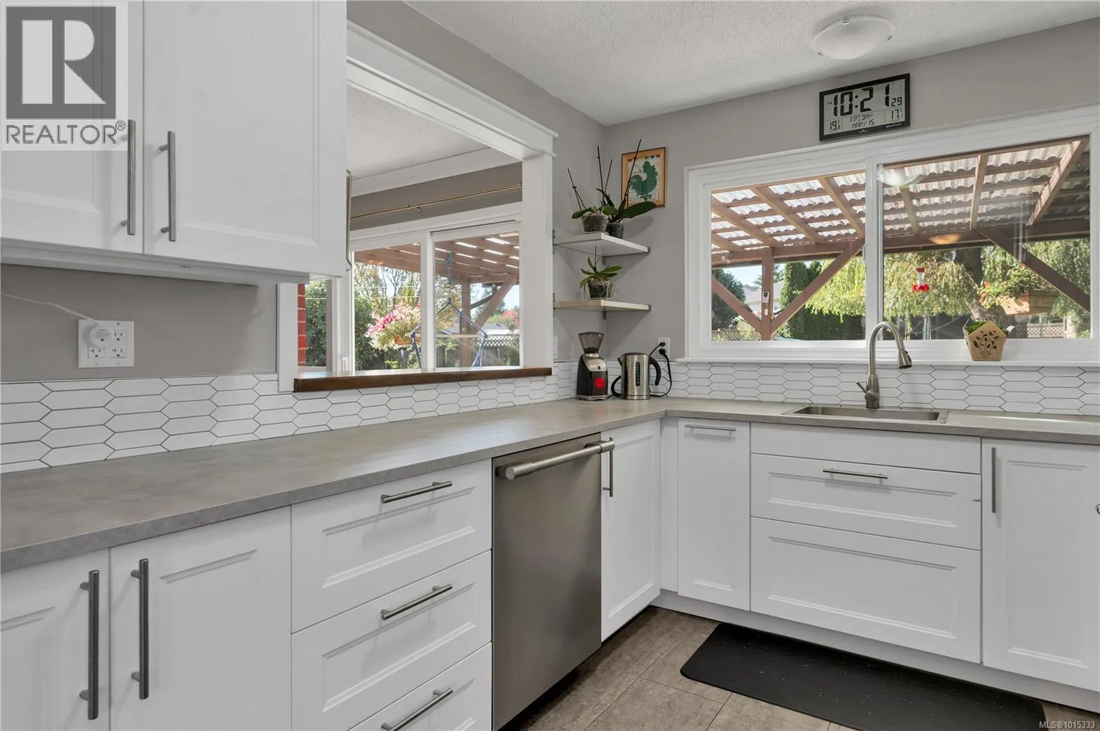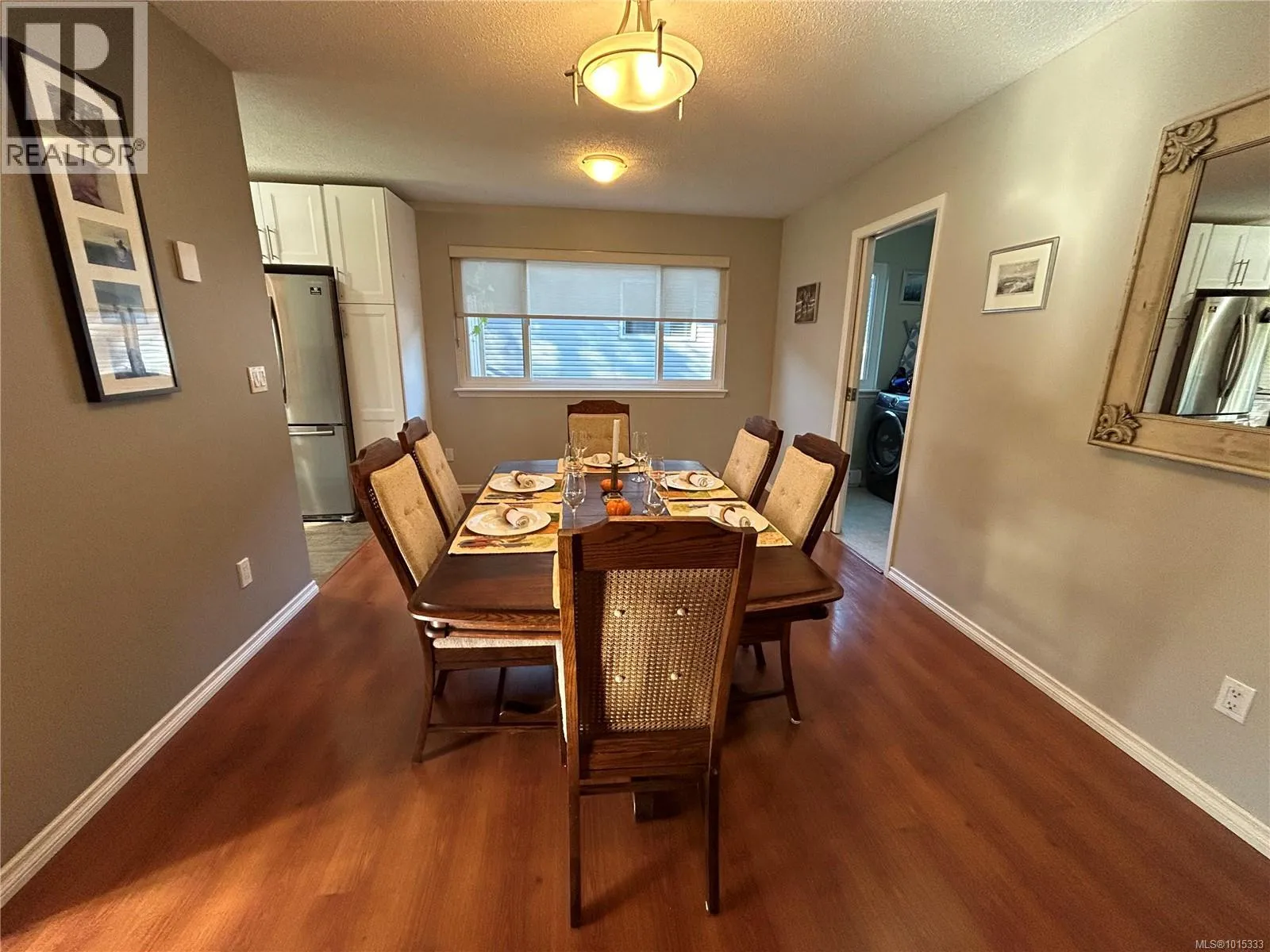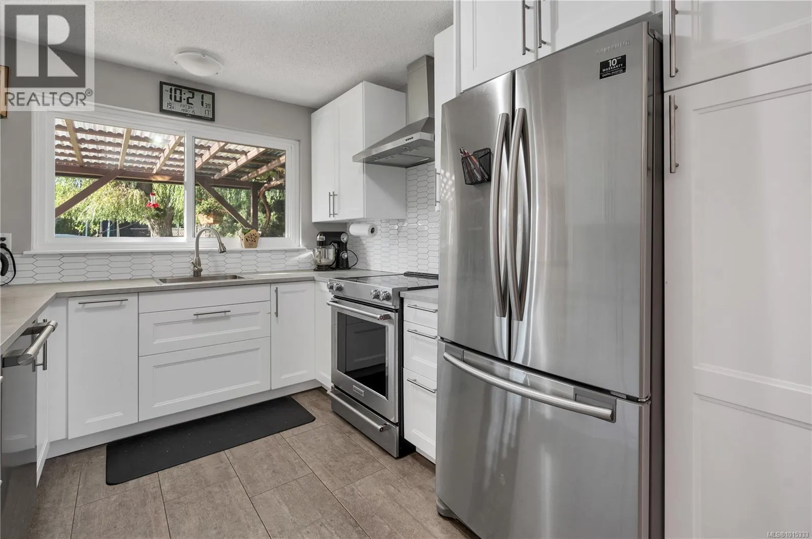 This beautifully updated 3-bedroom, 2-bathroom rancher offers comfort and style throughout. The spacious primary suite features a walk-in closet and a 2022-renovated ensuite with a tiled shower, glass door, heated floors, and a generous vanity. Large windows and a cozy woodstove brighten the inviting living room, while the adjoining family/dining area flows into the modern kitchen, featuring white cabinetry, stainless steel appliances, a tile backsplash, updated countertops, and an eating bar. Recent updates include a new stove (2024), washer (2024), dryer (2025), hot water tank (2025), and roof (2021). Step outside to a private 0.24-acre backyard oasis with a covered patio, mature trees, raised garden beds, a weeping willow, an apple tree, grapevines, blueberry, and raspberry bushes. Located on a quiet cul-de-sac in central Campbell Riverâclose to schools, shopping, and recreation. (id:27476)