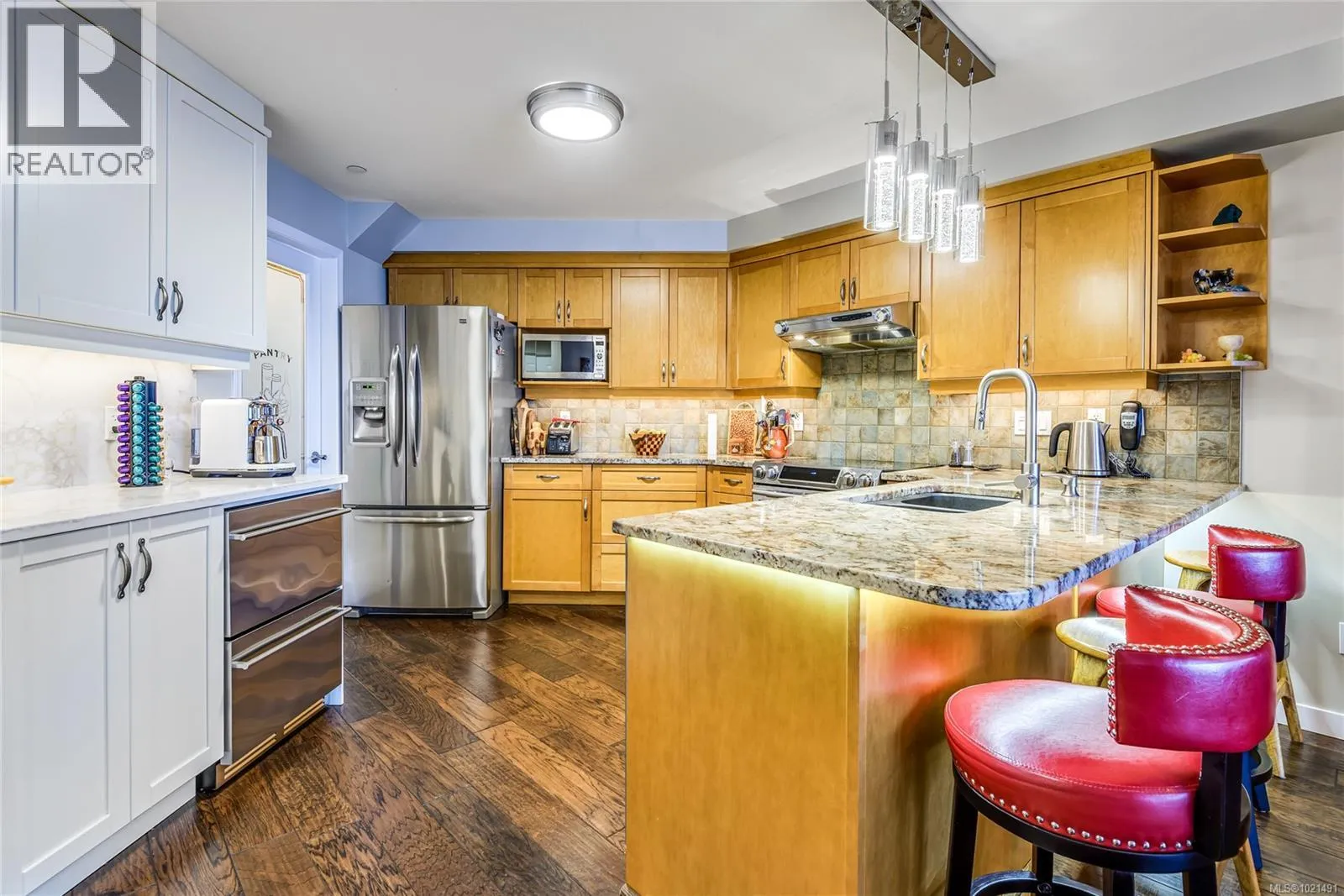 Enjoy beautiful ocean & mountain views highlighting Discovery Passage & the Coastal Mountain Range from this executive Silversea condo. This tastefully updated 2 bed, 2 bath + den unit features high-end finishing throughout. Warm and inviting living space with an abundance of natural light, cozy gas fireplace, and hardwood floors throughout. Other features include granite counter tops, stainless steel appliances, thoughtfully designed cabinetry, pantry with additional storage, large private deck, primary bedroom with full ensuite attached. Building features beautifully manicured grounds, underground parking, as well as a storage locker. Located across from the beach and renowned Campbell River Seawalk. (id:27476)