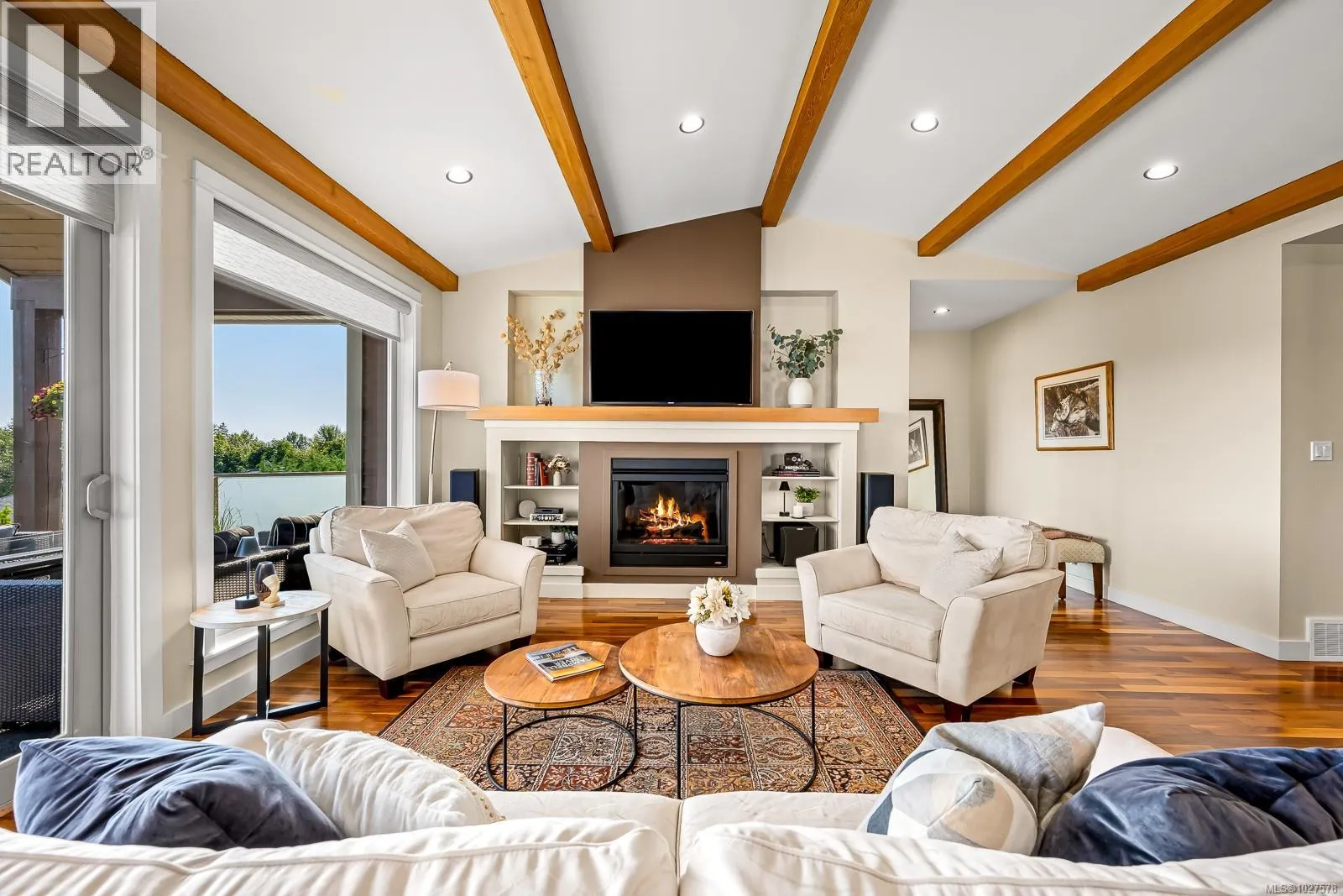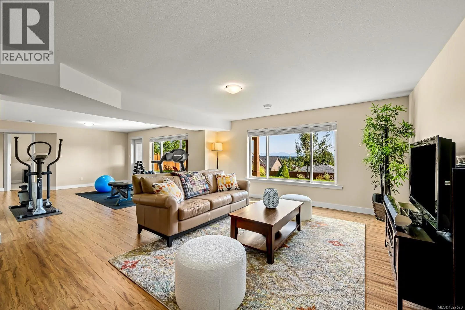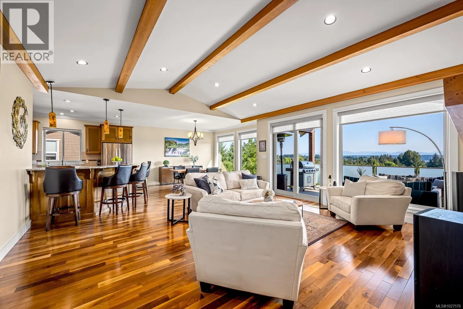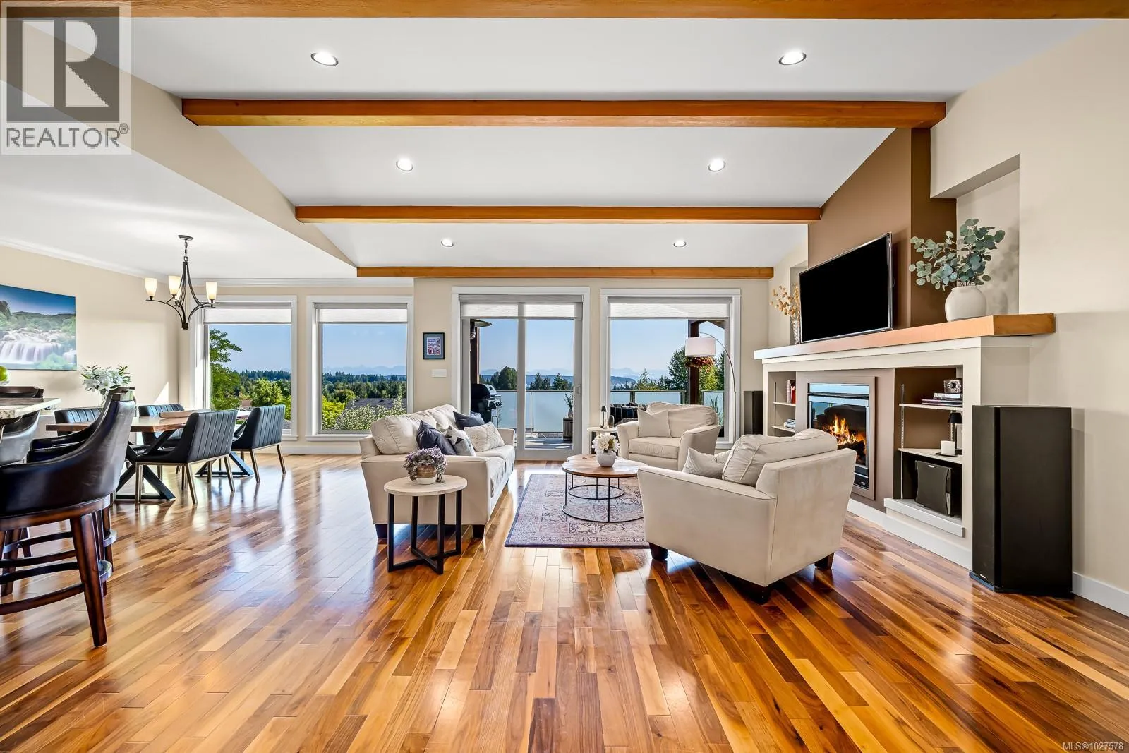 This custom, showhome-quality residence offers over 4,100 sq. ft. of thoughtfully designed living space complemented by stunning ocean and mountain views. The main level features a striking great room with vaulted ceilings, exposed wood beams, walnut flooring, and expansive windows that frame the coastal views. The gourmet maple kitchen is equipped with a granite island, walk-in pantry, and plenty of storage, while the dining area and covered deck make entertaining effortless year-round. The primary suite is a private retreat with a two-sided fireplace and spa-like ensuite, and two additional bedrooms plus a full bathroom with dual vanity complete the main level. The walk-out basement is expansive, with two more large bedrooms, two full baths, a rec room, play area, flex zones, and exceptional storage. Outside, mature landscaping enhances curb appeal, while RV and boat parking provide rare convenience. A perfect blend of craftsmanship, functionality, and west coast lifestyle. (id:27476)