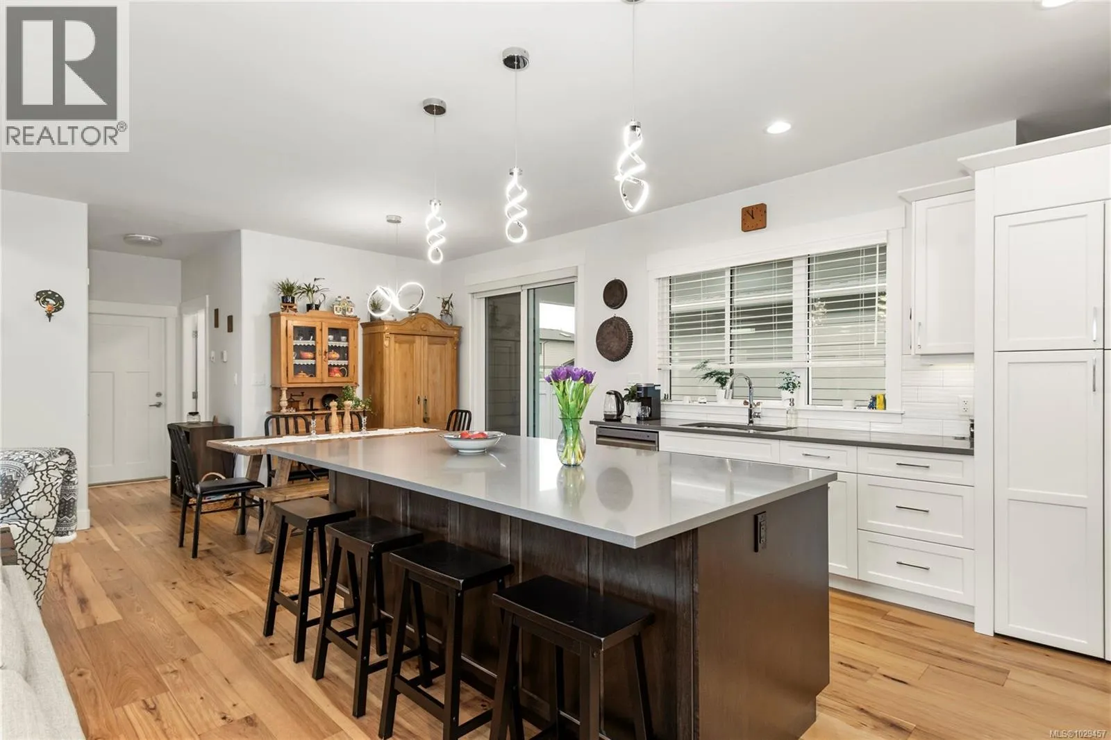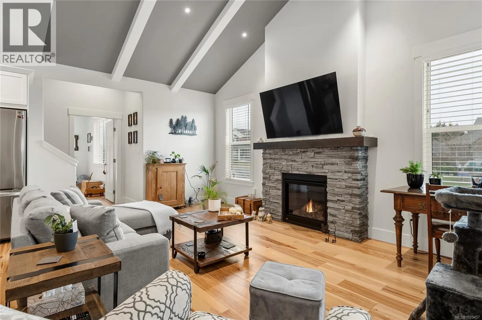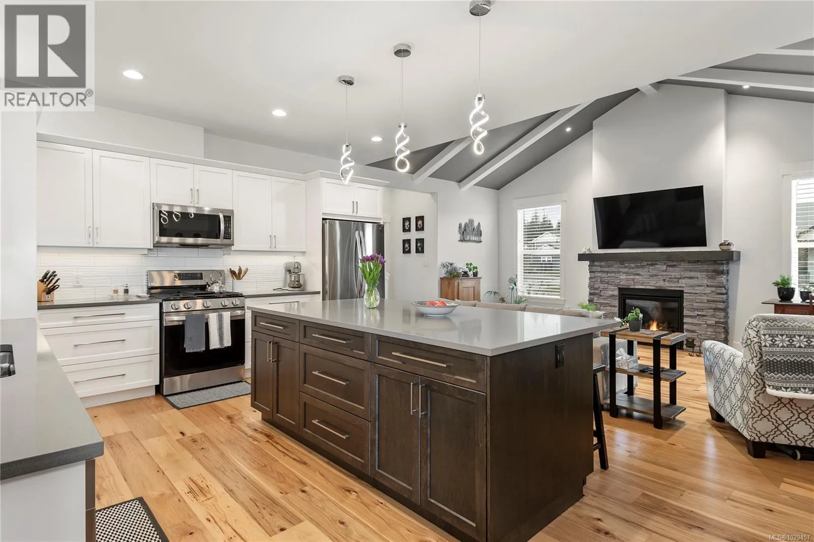 Welcome to this extraordinary duplex that lives like a detached home. Nestled in the new and growing Jubilee Heights on a corner lot with over 2,100sqft of living space. The main level impresses with vaulted ceilings, hickory hardwood flooring and a functional open-concept layout. The kitchen is equipped with a gas range, four-seater island and a hidden walk-in pantry. The primary bedroom offers a serene retreat with a 5 piece ensuite, a spacious walk-in closet and a separate linen closet. Downstairs is also home to a powder room and laundry room, while upstairs has two more generous sized bedrooms, a 4 piece bathroom and family room giving privacy to kids or guests. Outside, enjoy a private, covered patio perfect for relaxing and entertaining and a garden ready for your green thumb. Complete with a large garage with easy access to the crawl space, close proximity to the Beaver Lodge Trail network, and the underway Jubilee Heights Commercial Village. The ideal blend of function, style, and location in a growing community. (id:27476)