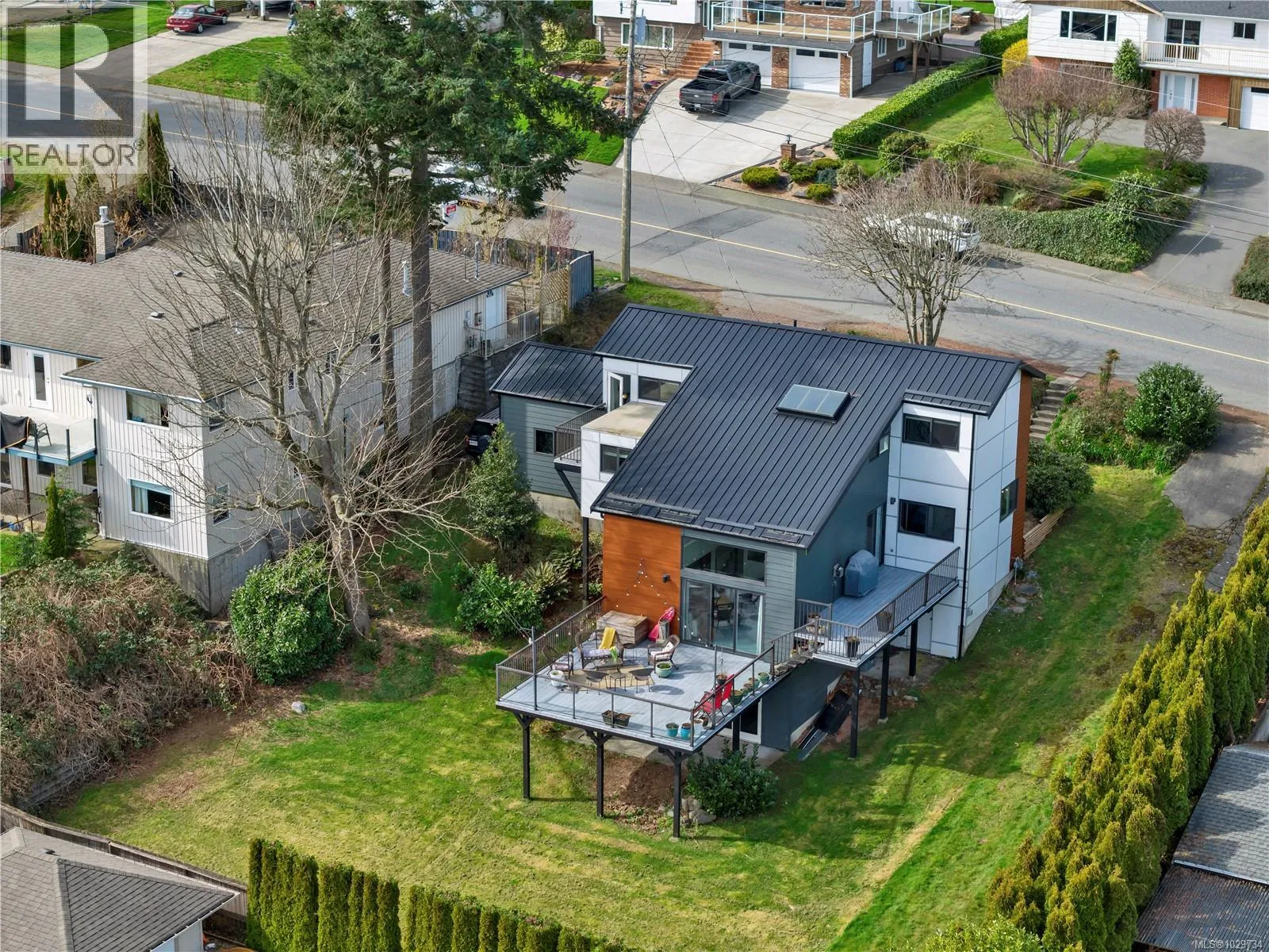 Panoramic ocean views set the stage for this beautifully updated West Coast Contemporary family home, complete with a brand-new, spacious two-tiered deckâperfect for relaxing or entertaining while taking in the scenery. Designed with families in mind, the unique multi-level layout offers both togetherness and privacy, featuring 4 bedrooms thoughtfully spread throughout the home. Extensive 2021 updates provide peace of mind and modern comfort, including new siding, windows, doors, sundecks, and a durable metal roof, along with refreshed flooring, drywall, paint, and fixtures inside. The upper level hosts a bright and airy primary retreat with stunning ocean views, a private balcony, and convenient en-suite, alongside two additional bedrooms and a full bathroomâideal for growing families. A fourth bedroom on the lower level offers flexibility for guests, teens, or a home office. A stunning home office will have you looking out the window at the views instead of your computer. There is also an extra sitting area for reading and downtime between the levels. Downstairs, the partially finished lower floor is full of potentialâcreate the perfect rec room, play space, gym, or studio, with French doors opening to a covered patio and backyard where more ocean views can be enjoyed. Set on a generous 0.19 city lot with mature, low-maintenance landscaping, this home offers space to play and unwind. Located close to all levels of schools, shopping, and everyday amenities, youâre just minutes from downtown and the shorelineâmaking busy family life that much easier.A perfect blend of space, updates, and locationâready to welcome its next family. (id:27476)