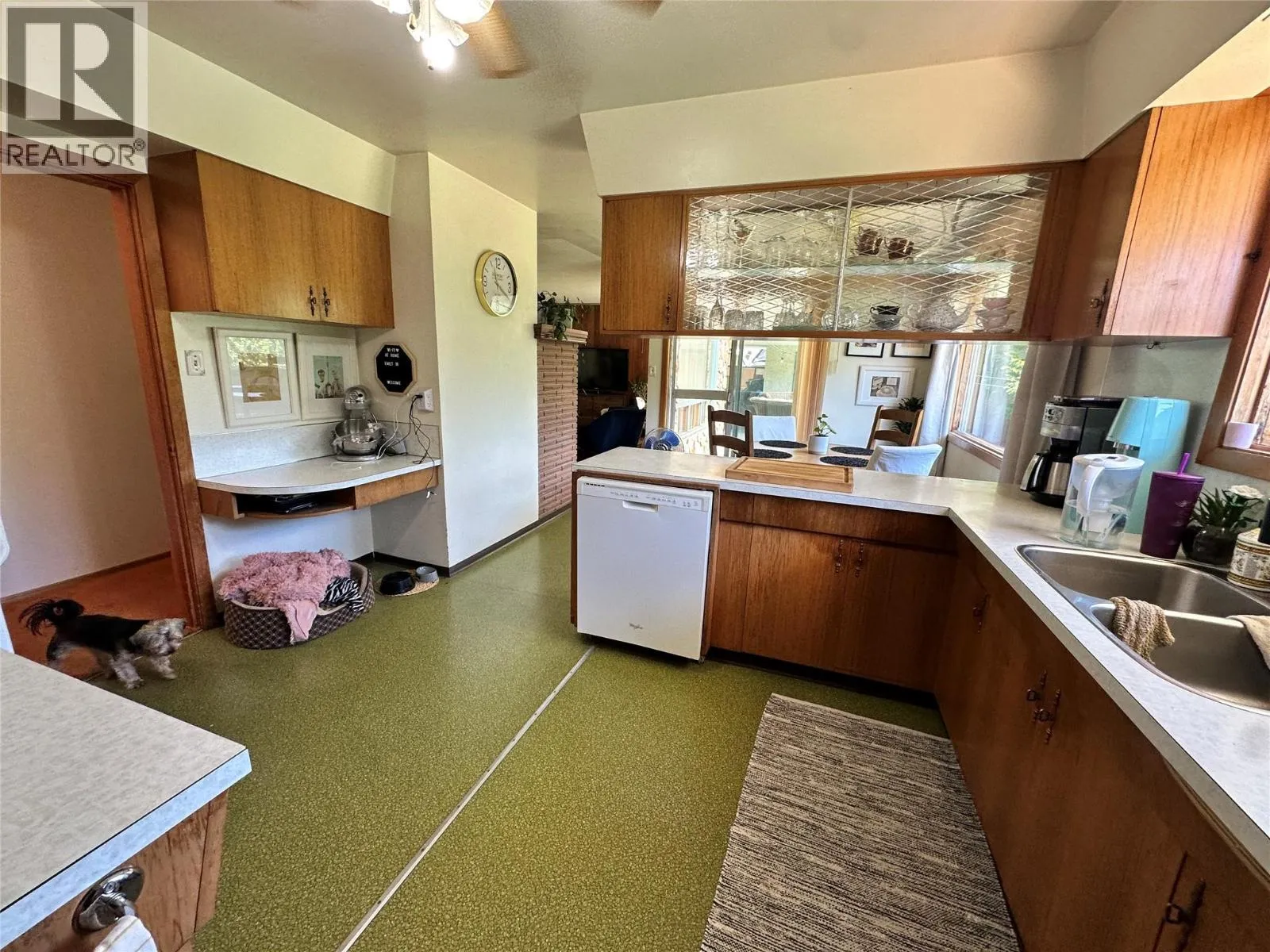 Welcome to this character-filled (mid Century Modern), ranch-style family home set on a generous 0.42-acre flat lot in desirable South Castlegar. Built in 1962, this solid home offers 1,836 sq ft of versatile living spaceâideal for families, gardeners, or investors.The main floor features 3 bright bedrooms, a full bathroom, and convenient main-level laundry. Downstairs, discover a fully suite-able basement with a second kitchen, full bath, spacious family/theatre room, and a separate entranceâperfect for extended family or rental potential. Enjoy scenic mountain views, excellent sun exposure, and an abundance of outdoor space including fruit trees, berry bushes, and garden-ready soil. A sunny dining nook leads to a covered patioâideal for summer BBQs. Ample off-street parking and room for RVs or future dwellings (per new zoning bylaws) add incredible value. Classic features include stone and stucco exterior, forced air gas heat with the additional two fireplaces (wood-burning, not WETT certified), and original linoleum and carpet flooring. Located near parks, transit, schools(Kinnard Elementary), airport, and everyday amenitiesâthis move-in ready home offers comfort, charm, and exciting development potential. A rare opportunity in a growing community! (id:27476)