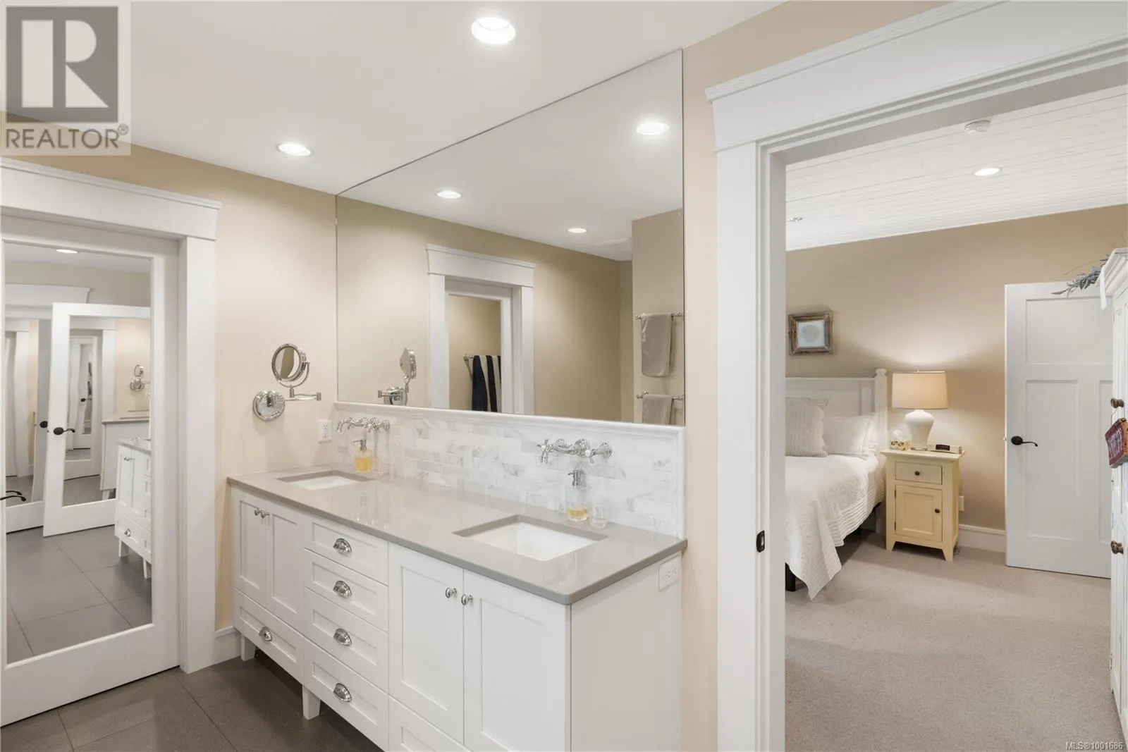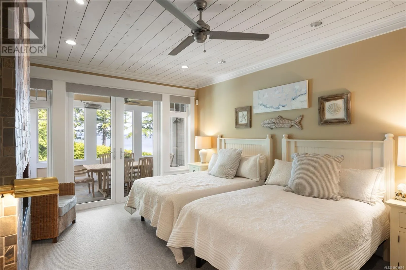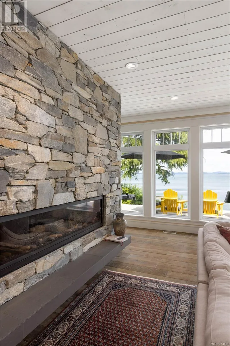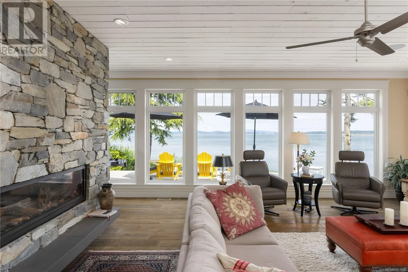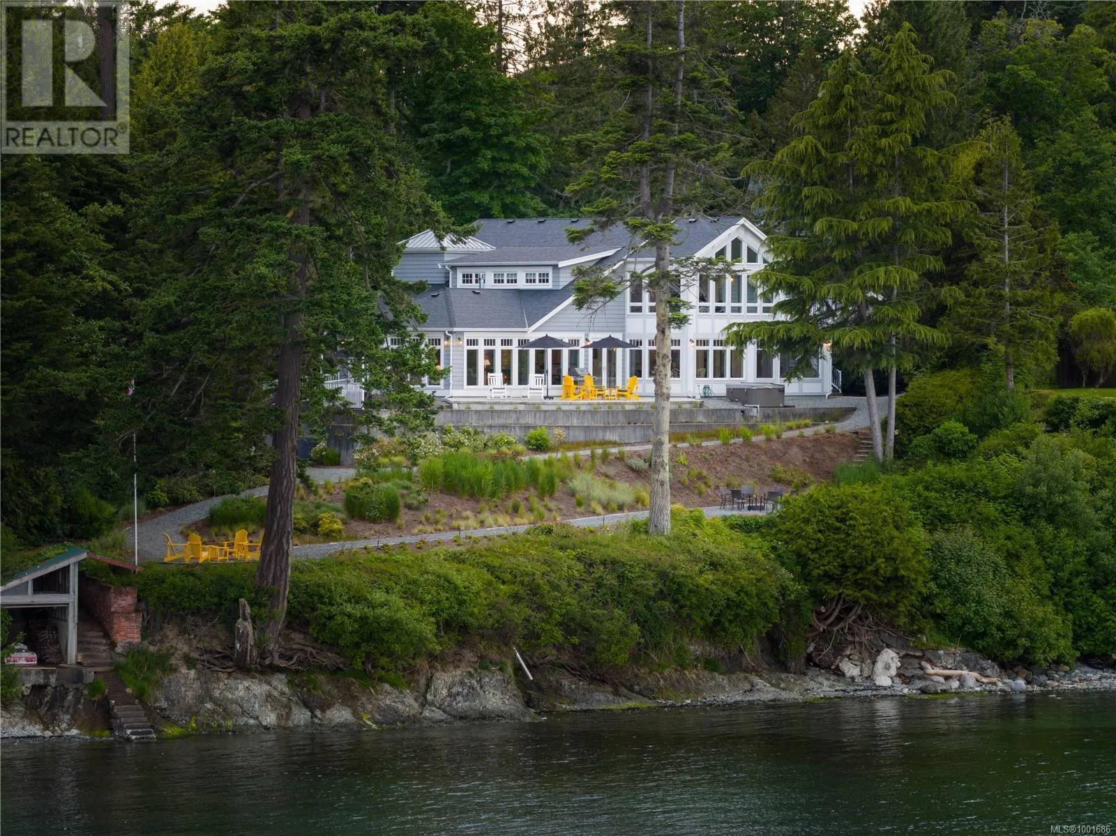 WATERFRONT: Nantucket West meets Sidney! Two private homes sit in a classic coastal, low-maintenance garden, soaking in sunshine and sea breezes with an old boathouse at the waterâs edge inviting beach access. The 4,063 sq ft Main House blends casual beach luxury with whitewashed shiplap ceilings, full-height mullioned windows, and wide-plank distressed white oak floors. A stunning floor-to-ceiling stone gas fireplace warms the great room, with hidden media cabinetry. The main-floor primary suite offers a spa-like 4-pc ensuite, dual walk-in closets, gas fireplace, French doors, and wool carpeting. The showpiece kitchen features a massive granite island, Kohler farmhouse sink, premium S/S appliances, 4-burner gas cooktop with griddle, wall/warming ovens, oak pass-through to the dining room, and custom paneled cabinetry. A sunny breakfast nook overlooks the ocean. A screened porch with imported East Coast bluestone is accessed via French doors from the kitchen and primary suite. Also on the main level: a secondary office with built-ins, plus a mudroom/laundry area with bathroom, sink, and W/D. Upstairs offers 3 bedrooms, a spacious office with French doors, 4-pc bath, 3-sided gas fireplace, and a soaring window-walled sunroom under 13â ceilings. With 2,000+ sq ft of decks and patios, hot tub, and fire table, outdoor living is exceptional. The full basement includes exterior access to an indoor pickleball court and space for a media room or further development. A breezeway connects to a 2-car garage with large workshop. Up the hill, the 950 sq ft 2-bedroom Carriage House above a 3-bay garage features a high-end custom kitchen with quartz counters, wide-plank floors, gas fireplace, and private water-view deckâideal for extended family or as a mortgage helper. (id:27476)