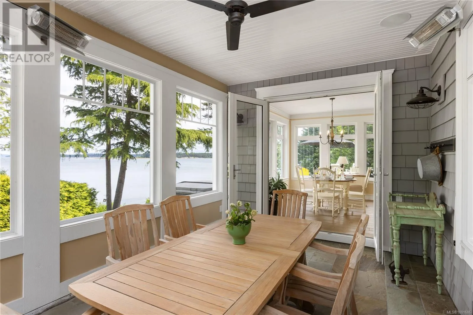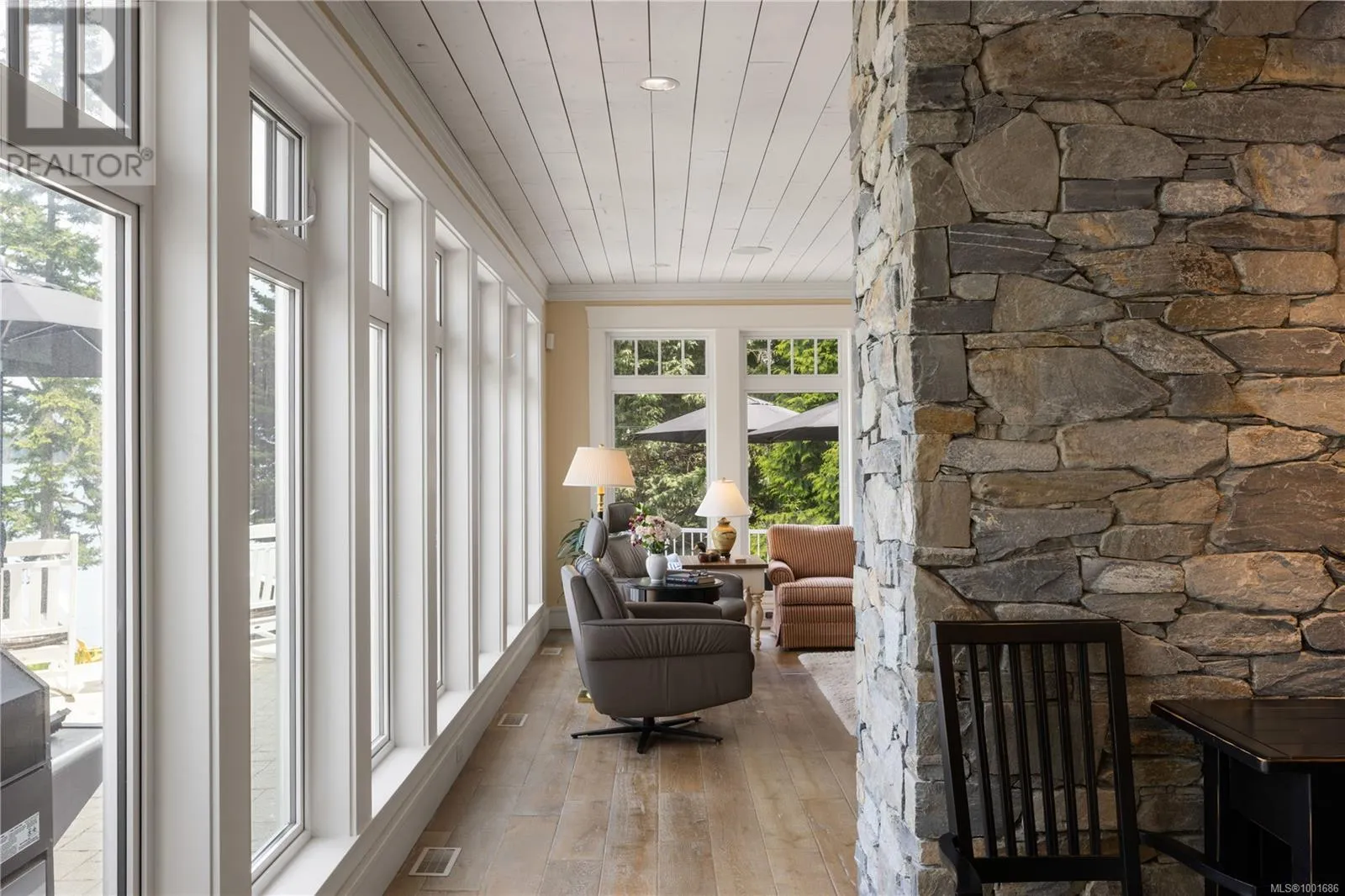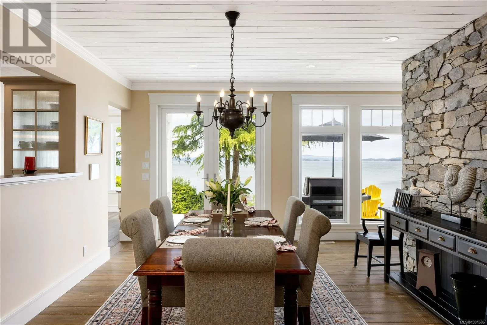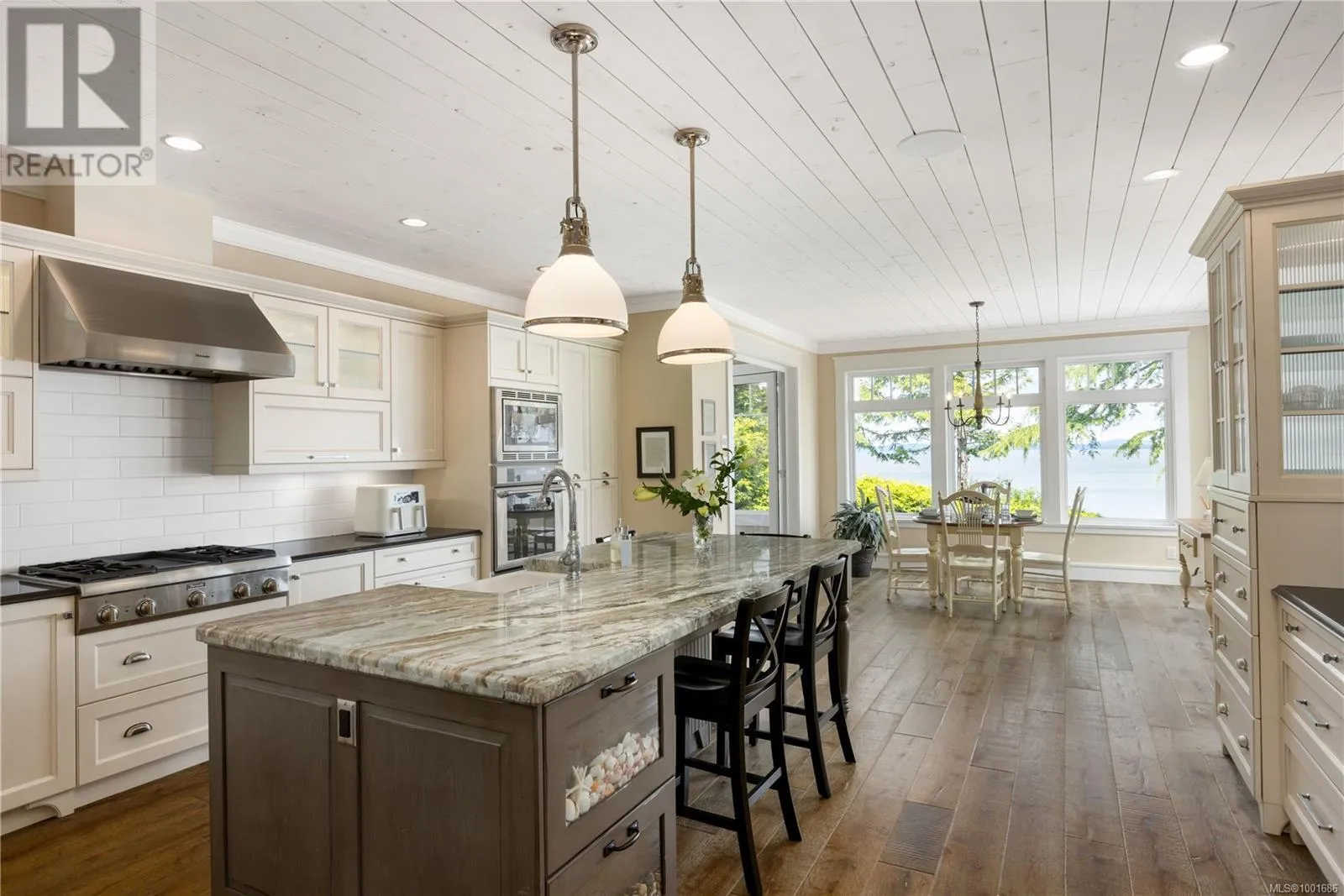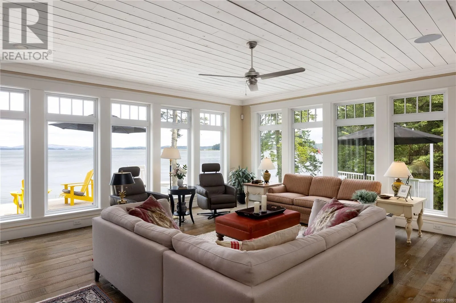 WATERFRONT: Nantucket West meets Sidney! Two private homes sit in a classic coastal, low-maintenance garden, soaking in sunshine and sea breezes with an old boathouse at the waterâs edge inviting beach access. The 4,063 sq ft Main House blends casual beach luxury with whitewashed shiplap ceilings, full-height mullioned windows, and wide-plank distressed white oak floors. A stunning floor-to-ceiling stone gas fireplace warms the great room, with hidden media cabinetry. The main-floor primary suite offers a spa-like 4-pc ensuite, dual walk-in closets, gas fireplace, French doors, and wool carpeting. The showpiece kitchen features a massive granite island, Kohler farmhouse sink, premium S/S appliances, 4-burner gas cooktop with griddle, wall/warming ovens, oak pass-through to the dining room, and custom paneled cabinetry. A sunny breakfast nook overlooks the ocean. A screened porch with imported East Coast bluestone is accessed via French doors from the kitchen and primary suite. Also on the main level: a secondary office with built-ins, plus a mudroom/laundry area with bathroom, sink, and W/D. Upstairs offers 3 bedrooms, a spacious office with French doors, 4-pc bath, 3-sided gas fireplace, and a soaring window-walled sunroom under 13â ceilings. With 2,000+ sq ft of decks and patios, hot tub, and fire table, outdoor living is exceptional. The full basement includes exterior access to an indoor pickleball court and space for a media room or further development. A breezeway connects to a 2-car garage with large workshop. Up the hill, the 950 sq ft 2-bedroom Carriage House above a 3-bay garage features a high-end custom kitchen with quartz counters, wide-plank floors, gas fireplace, and private water-view deckâideal for extended family or as a mortgage helper. (id:27476)