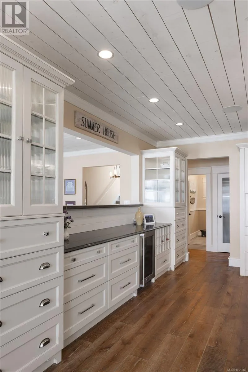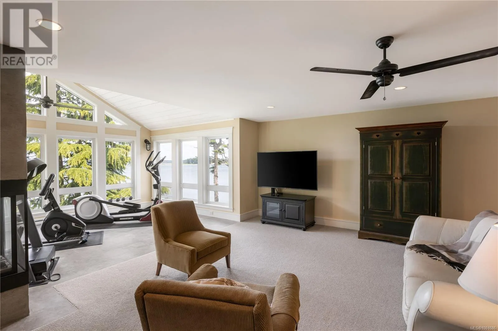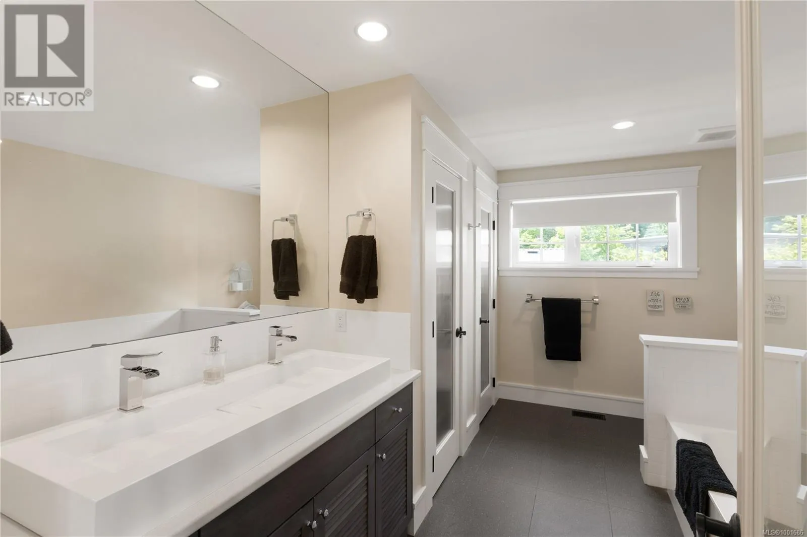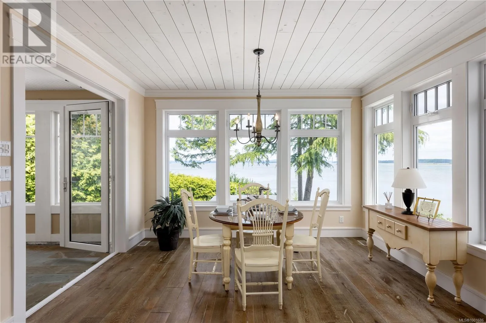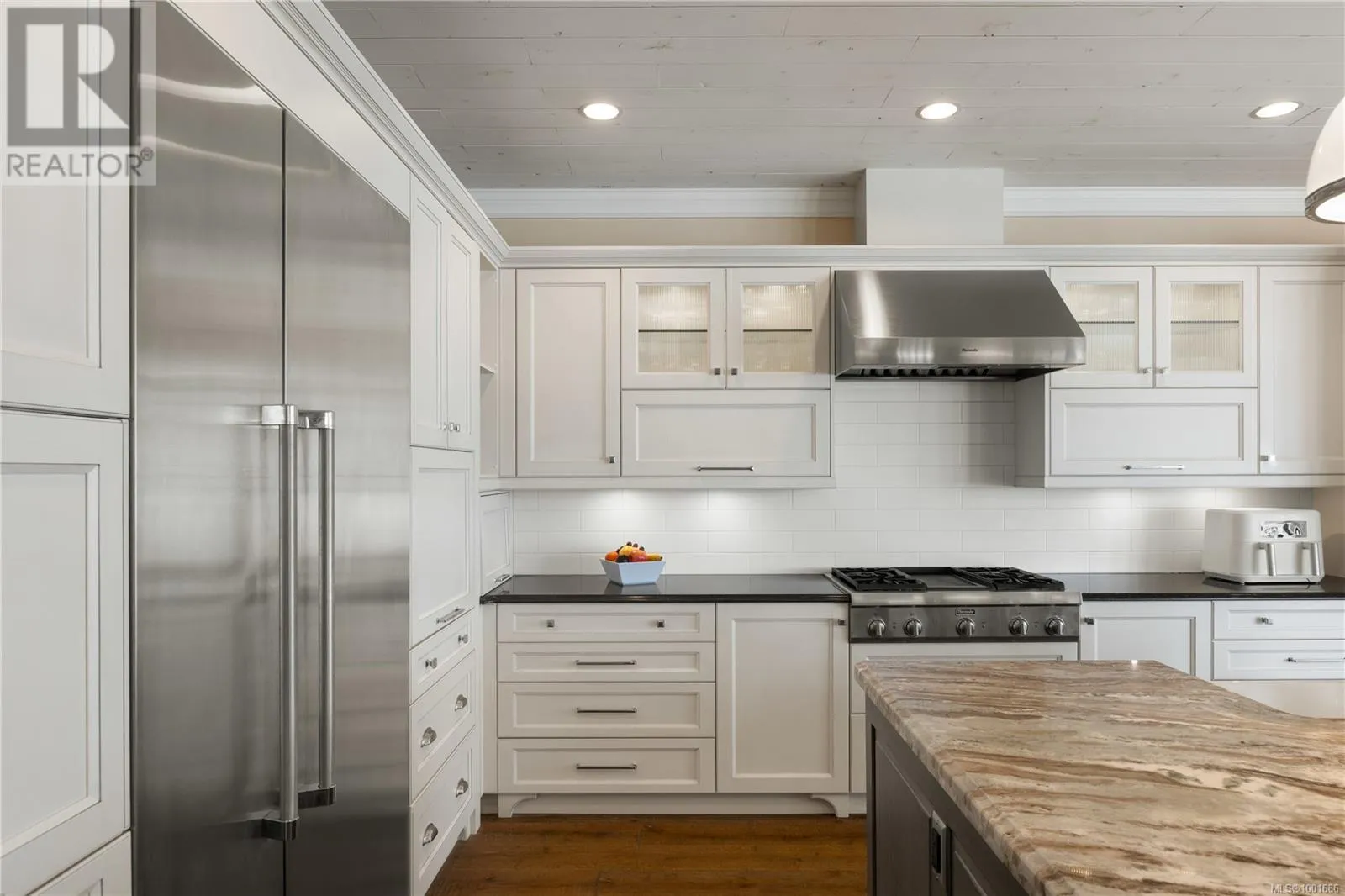 WATERFRONT: Nantucket West meets Sidney! Two private homes sit in a classic coastal, low-maintenance garden, soaking in sunshine and sea breezes with an old boathouse at the waterâs edge inviting beach access. The 4,063 sq ft Main House blends casual beach luxury with whitewashed shiplap ceilings, full-height mullioned windows, and wide-plank distressed white oak floors. A stunning floor-to-ceiling stone gas fireplace warms the great room, with hidden media cabinetry. The main-floor primary suite offers a spa-like 4-pc ensuite, dual walk-in closets, gas fireplace, French doors, and wool carpeting. The showpiece kitchen features a massive granite island, Kohler farmhouse sink, premium S/S appliances, 4-burner gas cooktop with griddle, wall/warming ovens, oak pass-through to the dining room, and custom paneled cabinetry. A sunny breakfast nook overlooks the ocean. A screened porch with imported East Coast bluestone is accessed via French doors from the kitchen and primary suite. Also on the main level: a secondary office with built-ins, plus a mudroom/laundry area with bathroom, sink, and W/D. Upstairs offers 3 bedrooms, a spacious office with French doors, 4-pc bath, 3-sided gas fireplace, and a soaring window-walled sunroom under 13â ceilings. With 2,000+ sq ft of decks and patios, hot tub, and fire table, outdoor living is exceptional. The full basement includes exterior access to an indoor pickleball court and space for a media room or further development. A breezeway connects to a 2-car garage with large workshop. Up the hill, the 950 sq ft 2-bedroom Carriage House above a 3-bay garage features a high-end custom kitchen with quartz counters, wide-plank floors, gas fireplace, and private water-view deckâideal for extended family or as a mortgage helper. (id:27476)