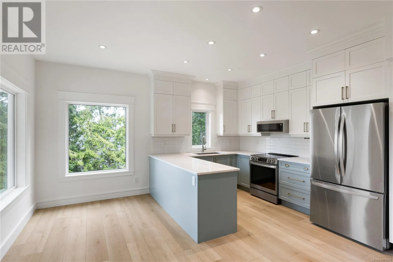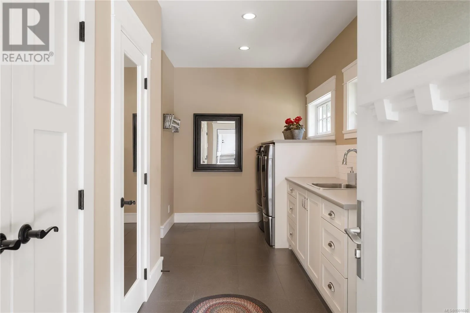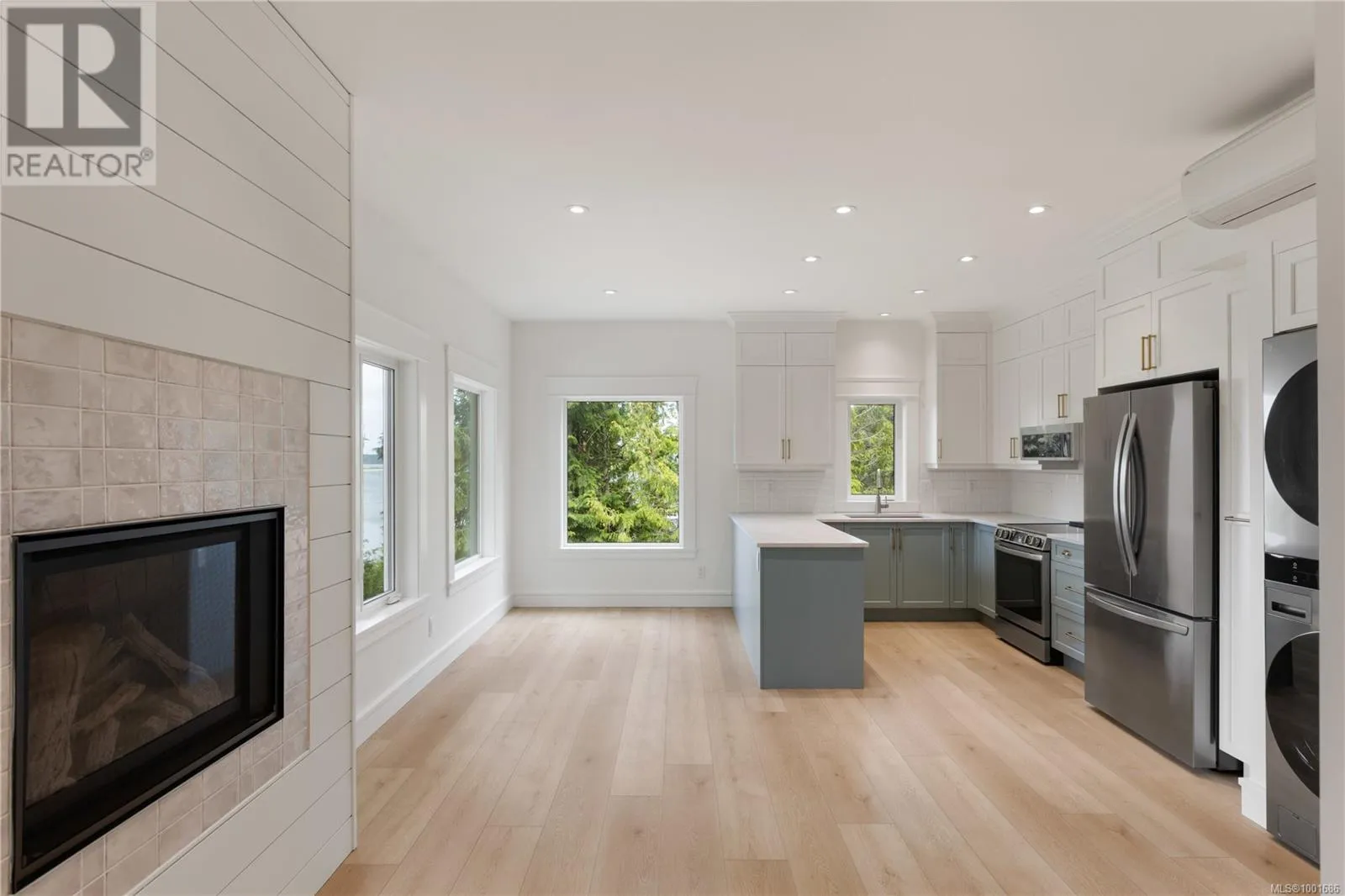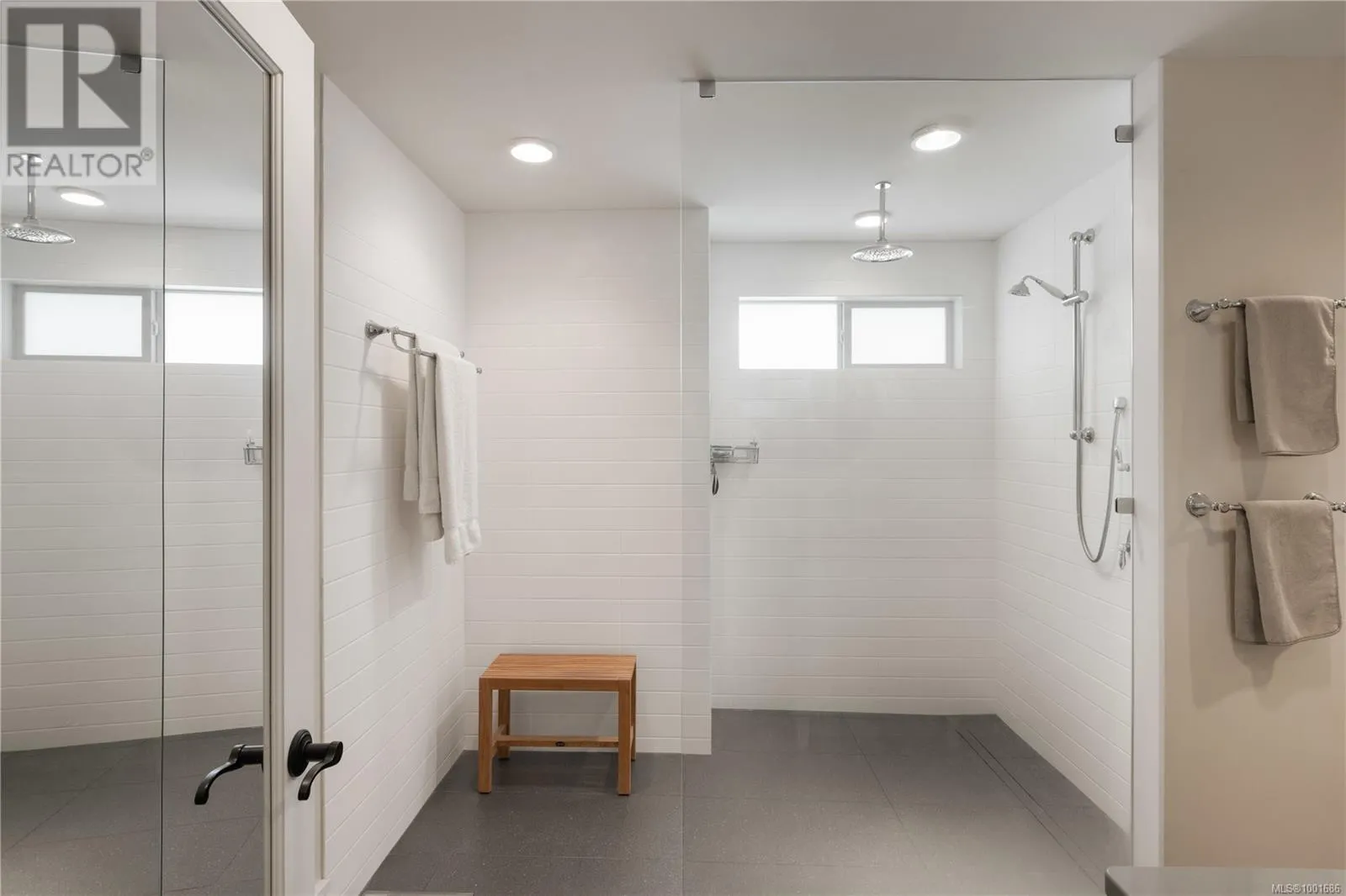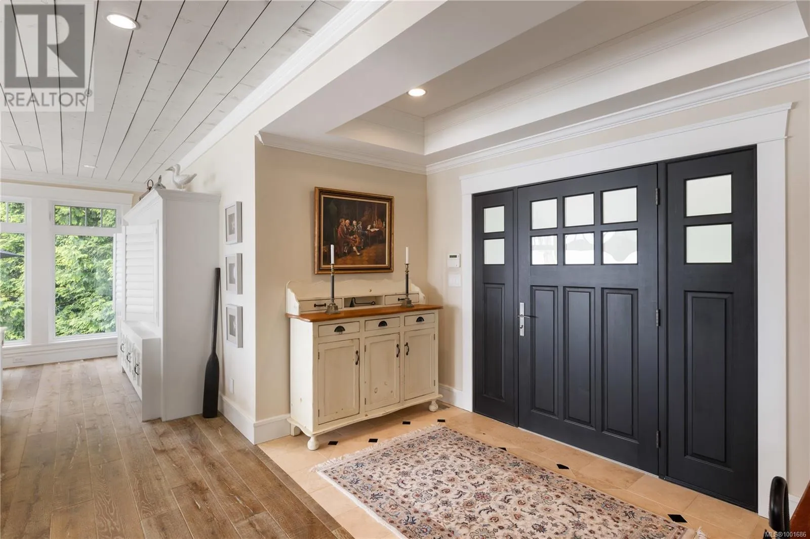 WATERFRONT: Nantucket West meets Sidney! Two private homes sit in a classic coastal, low-maintenance garden, soaking in sunshine and sea breezes with an old boathouse at the waterâs edge inviting beach access. The 4,063 sq ft Main House blends casual beach luxury with whitewashed shiplap ceilings, full-height mullioned windows, and wide-plank distressed white oak floors. A stunning floor-to-ceiling stone gas fireplace warms the great room, with hidden media cabinetry. The main-floor primary suite offers a spa-like 4-pc ensuite, dual walk-in closets, gas fireplace, French doors, and wool carpeting. The showpiece kitchen features a massive granite island, Kohler farmhouse sink, premium S/S appliances, 4-burner gas cooktop with griddle, wall/warming ovens, oak pass-through to the dining room, and custom paneled cabinetry. A sunny breakfast nook overlooks the ocean. A screened porch with imported East Coast bluestone is accessed via French doors from the kitchen and primary suite. Also on the main level: a secondary office with built-ins, plus a mudroom/laundry area with bathroom, sink, and W/D. Upstairs offers 3 bedrooms, a spacious office with French doors, 4-pc bath, 3-sided gas fireplace, and a soaring window-walled sunroom under 13â ceilings. With 2,000+ sq ft of decks and patios, hot tub, and fire table, outdoor living is exceptional. The full basement includes exterior access to an indoor pickleball court and space for a media room or further development. A breezeway connects to a 2-car garage with large workshop. Up the hill, the 950 sq ft 2-bedroom Carriage House above a 3-bay garage features a high-end custom kitchen with quartz counters, wide-plank floors, gas fireplace, and private water-view deckâideal for extended family or as a mortgage helper. (id:27476)